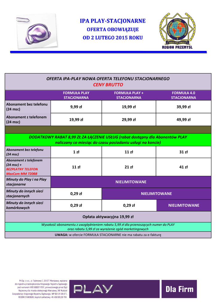 OFERTA IPA-PLAY NOWA OFERTA TELEFONU STACJONARNEGO CENY BRUTTO FORMUŁA PLAY STACJONARNA FORMUŁA PLAY + STACJONARNA FORMUŁA 4.0 STACJONARNA Abonament bez telefonu (24 msc) 9,99 zł 19,99 zł 39,99 zł Abonament z telefonem (24 msc) 19,99 zł 29,99 zł 49,99 zł DODATKOWY RABAT 8,99 ZŁ ZA ŁĄCZENIE USŁUG (rabat dostępny dla Abonentów PLAY naliczany co miesiąc do czasu posiadaniu usługi na koncie) Abonament bez telefonu (24 msc) 1 zł 11 zł 31 zł Abonament z telefonem (24 msc) + BEZPŁATNY TELEFON MaxCom MM 720BB 11 zł 21 zł 41 zł Minuty do Play i na Play stacjonarne NIELIMITOWANE Minuty do innych sieci stacjonarnych 0,29 zł Minuty do innych sieci komórkowych 0,29 zł NIELIMITOWANE 0,29 zł NIELIMITOWANE Opłata aktywacyjna 19,99 zł Wysokość abonamentu z uwzględnieniem rabatu 5,99 zł dla przenoszących numer do PLAY oraz rabatu 5,99 zł za wyrażenie zgód marketingowych UWAGA: w ofercie FORMUŁA STACJONARNE nie ma rabatu za e-fakturę