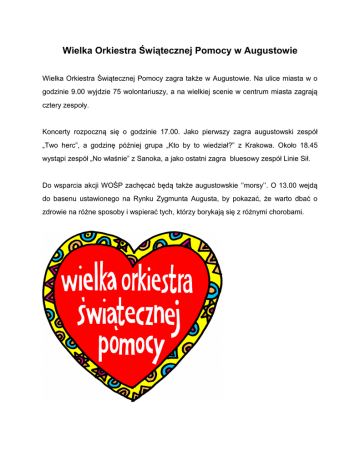 Wielka Orkiestra Świątecznej Pomocy w Augustowie Wielka Orkiestra Świątecznej Pomocy zagra także w Augustowie. Na ulice miasta w o godzinie 9.00 wyjdzie 75 wolontariuszy, a na wielkiej scenie w centrum miasta zagrają cztery zespoły. Koncerty rozpoczną się o godzinie 17.00. Jako pierwszy zagra augustowski zespół „Two herc”, a godzinę później grupa „Kto by to wiedział?” z Krakowa. Około 18.45 wystąpi zespół „No właśnie” z Sanoka, a jako ostatni zagra bluesowy zespół Linie Sił. Do wsparcia akcji WOŚP zachęcać będą także augustowskie ‘’morsy’’. O 13.00 wejdą do basenu ustawionego na Rynku Zygmunta Augusta, by pokazać, że warto dbać o zdrowie na różne sposoby i wspierać tych, którzy borykają się z różnymi chorobami.