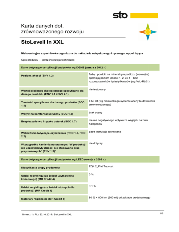 Karta danych dot. zrównoważonego rozwoju StoLevell In XXL Niskoemisyjna szpachlówka organiczna do nakładania natryskowego i ręcznego, wypełniająca Opis produktu — patrz instrukcja techniczna Dane dotyczące certyfikacji budynków wg DGNB (wersja z 2012 r.) Poziom jakości (ENV 1.2) Wartości bilansu ekologicznego specyficzne dla danego produktu (ENV 1.1 i ENV 2.1) Trwałość specyficzna dla danego produktu (ECO 1.1) Wpływ na komfort akustyczny (SOC 1.3) Bezpieczeństwo i ryzyko usterek (SOC 1.7) Wskazówki dotyczące czyszczenia (PRO 1.5, PRO 2.2) W przypadku kamienia naturalnego: “W produkcji nie uczestniczyły dzieci i nie stosowano prac przymusowych” (ENV 1.3)” farby i powłoki na mineralnym podłożu (wewnątrz) spełniają poziom jakości 1, 2, 3 i 4 – bez rozpuszczalników i plastyfikatorów (wg VdL-RL01) nie testowany ≥ 50 lat (wg niemieckiego systemu oceny budownictwa zrównoważonego) brak oceny nie ma negatywnego wpływu ze względu na brak halogenów patrz instrukcja techniczna nie dotyczy Dane dotyczące certyfikacji budynków wg LEED (wersja z 2009 r.) Klasyfikacja grupy produktów Udział recyklingu (ze źródeł użytkownika końcowego) (MR Credit 4) Udział recyklingu (ze źródeł istotnych dla produkcji) (MR Credit 4) Materiały regionalne (MR Credit 5) Nr wer.: 1 / PL / 22.10.2015 / StoLevell In XXL EQ4.2_Flat Topcoat 0% <1% 80 % < 800 km (500 mi) od zakładu produkcyjnego 1/6 Karta danych dot. zrównoważonego rozwoju StoLevell In XXL Miejsce produkcji (MR Credit 5) Surowce szybkoodnawialne (MR Credit 6) Drewno certyfikowane (FSC lub PEFC) (MR Credit 7) Zawartość związków VOC (IEQ Credit 4.1): materiały o niskiej zawartości substancji szkodliwych – materiały klejące i uszczelniające Zawartość związków VOC (IEQ Credit 4.2): materiały o niskiej zawartości substancji szkodliwych – farby i powłoki Zawartość związków VOC (IEQ Credit 4.3): materiały o niskiej zawartości substancji szkodliwych – systemy podłogowe Beissier S.A.S., F-77760 La Chapelle-la-Reine 1% nie dotyczy nie dotyczy < 1 g/l (bez wody) nie dotyczy Ekologiczne znaki jakości i oznaczenia Certyfikaty / ekologiczne znaki jakości (znak TÜV “Produkt niskoemisyjny, zbadany pod kątem zawartości substancji szkodliwych, z kontrolowanej produkcji”) TUEV - Certificate No. TM-18/140423-1 Declaration of conformity No. ECO-FR-024 Deklaracja środowiskowa produktu (EPD) Klasyfikacja substancji szkodliwych (GISCODE, EMICODE, RAL itd.) Karta charakterystyki (SDB) Instrukcja techniczna (TM) Nr wer.: 1 / PL / 22.10.2015 / StoLevell In XXL brak brak dostępny dostępny 2/6 Karta danych dot. zrównoważonego rozwoju StoLevell In XXL Składniki produktu Skład Składniki niebezpieczne (wg rozporządzeń UE) Udział substancji mineralnych (wg natureplus / baubook) Udział substancji organicznych (wg natureplus / baubook) Lotne substancje organiczne, substancje KMR (wg DIN EN ISO 17895) Zawartość związków VOC (wg dyrektywy Decopaint) Zawartość zmiękczacza (wg VdL-RL 01) Wolny formaldehyd (wg VdL-RL 03 lub RAL-UZ 102) Biocydy/substancja aktywna chroniąca powłokę (wg rozporządzenia UE 528/2012) Według wytycznych VdL dotyczących materiałów powłokowych do budynków, dyspersja polimerowa, Wypełniacze mineralne, woda, Dodatki, środek konserwujący Karta charakterystyki (patrz rozdział 3) ≥ 95 % ≤5% niewykrywalny (granica wykrywalności: 1 mg/kg) < 0,1 g/l (< 0,01 %) (Produkt nie podlega wytycznym 2004/42/WE) nie zawiera plastyfikatorów ≤ 10 mg/kg nie zawiera Biocydy/substancja aktywna chroniąca podczas składowania (wg rozporządzenia UE 528/2012) zawiera, patrz karta charakterystyki (rozdział 2), zawartość poniżej wartości granicznej wg RAL-UZ-102 załącznik 1 Metale ciężkie (migracja wg EN 71-3) poniżej wartości granicznej wg dyrektywy o zamówieniach TÜV Mark Przestrzeganie granicy emisji w przemyśle, gdzie powstaje tlenek tytanu (wg dyrektywy 92/112/EWG lub 25.BImSchV) Nr wer.: 1 / PL / 22.10.2015 / StoLevell In XXL nie dotyczy, ponieważ produkt nie zawiera dwutlenku tytanu 3/6 Karta danych dot. zrównoważonego rozwoju StoLevell In XXL Halogenowe węglowodory (np. FCKW, HFKW, HFCKW) Halogenowe związki organiczne (np. IPBC, HBCD, polichlorek winylu) nie zawiera brak Emisje Formaldehyd (wg PN-EN ISO 16000-9 lub badanie zawartości formaldehydu paskami testowymi Marckoquant) Półlotne związki organiczne SVOC (wg PN-EN ISO 16000-9 lub PN-EN 16402) niewykrywalny (granica wykrywalności: 2 µg/m³) niewykrywalny (granica wykrywalności: 2 µg/m³) Utylizacja / ponowne zastosowanie / recykling Ponowne zastosowanie / recykling Utylizacja Opakowanie / wiadro / folia Farby i lakiery nie są poddawane recyklingowi. Patrz Karta charakterystyki (podpunkt 13) Odbieranie zużytych opakowań oraz ich prawidłowe ponowne wykorzystanie zostało ustalone na podstawie przepisów z lokalną firmą utylizacyjną posiadającą odpowiednie certyfikaty. Odpowiedzialność firmy Sto Misja firmy / kierownictwo firmy Sto UN Global Compact — członkowstwo Podstawowe normy pracy ILO Nr wer.: 1 / PL / 22.10.2015 / StoLevell In XXL Głównym celem firmy Sto jest zajęcie pozycji technologicznego lidera w dziedzinie zrównoważonego, przyjaznego dla człowieka budownictwa. Na całym świecie. Pozostałe informacje: www.sto.com Firma Sto jest członkiem UN Global Compact i zobowiązuje się do przestrzegania dziesięciu uznanych zasad, obejmujących prawa człowieka, normy pracy, ochronę środowiska i zwalczanie korupcji. Pozostałe informacje: www.unglobalcompact.org Firma Sto zobowiązała się do przestrzegania we 4/6 Karta danych dot. zrównoważonego rozwoju StoLevell In XXL wszystkich swoich lokalizacjach podstawowych norm pracy ILO. Zarządzanie jakością i zarządzanie środowiskowe Kodeks dostawcy Miejsce produkcji zostało poddane certyfikacji wg DIN EN 9001 oraz DIN EN 14001. Kodeks dostawcy firmy Sto opiera się o zasady UN Global Compact oraz misję
