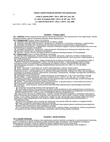 Ustawa o jakości handlowej artykułów rolno-spożywczych 1) z dnia 21 grudnia 2000 r. (Dz.U. 2001 Nr 5, poz. 44) tj. z dnia 15 września 2005 r. (Dz.U. Nr 187, poz. 1577) tj. z dnia 25 marca 2014 r. (Dz.U. z 2014 r. poz. 669) (zm. Dz.U. z 2014 r. poz. 1146) Rozdział 1. Przepisy ogólne. Art. 1 [Zakres] Ustawa reguluje sprawy jakości handlowej artykułów rolno-spożywczych oraz organizację i zasady działania Inspekcji Jakości Handlowej Artykułów Rolno-Spożywczych. Art. 2 [Wyłączenia] Przepisy ustawy nie dotyczą: 1) artykułów rolno-spożywczych wytwarzanych na własny użytek; 2) materiału siewnego roślin rolniczych, ogrodniczych i zielarskich w rozumieniu przepisów o nasiennictwie; 3) sprzedaży artykułów rolno-spożywczych dokonywanej przez ich producentów w gospodarstwie bezpośrednio konsumentom, z wyłączeniem wyrobów winiarskich objętych wspólną organizacją rynku wina oraz fermentowanych napojów winiarskich; 4) wymagań zdrowotnych, sanitarnych, weterynaryjnych i fitosanitarnych dotyczących artykułów rolnospożywczych określonych w odrębnych przepisach; 5) owoców i warzyw, których wymagania jakości handlowej określają przepisy Unii Europejskiej. Art. 3 [Słowniczek] Użyte w ustawie określenia oznaczają: 1) artykuły rolno-spożywcze - produkty rolne, runo leśne, dziczyznę, organizmy morskie i słodkowodne w postaci surowców, półproduktów oraz wyrobów gotowych otrzymywanych z tych surowców i półproduktów, w tym środki spożywcze; 2) żywność (środek spożywczy) - każdą substancję lub produkt w rozumieniu art. 2 rozporządzenia (WE) nr 178/2002 Parlamentu Europejskiego i Rady z dnia 28 stycznia 2002 r. ustanawiającego ogólne zasady i wymagania prawa żywnościowego, powołującego Europejski Urząd ds. bezpieczeństwa żywności oraz ustanawiającego procedury w zakresie bezpieczeństwa żywności (Dz.Urz. WE L 31 z 01.02.2002); 3) (uchylony) 4) obrót - czynności w rozumieniu art. 3 pkt 8 rozporządzenia, o którym mowa w pkt 2; 5) jakość handlowa - cechy artykułu rolno-spożywczego dotyczące jego właściwości organoleptycznych, fizykochemicznych i mikrobiologicznych w zakresie technologii produkcji, wielkości lub masy oraz wymagania wynikające ze sposobu produkcji, opakowania, prezentacji i oznakowania, nieobjęte wymaganiami sanitarnymi, weterynaryjnymi lub fitosanitarnymi; 6) opakowany środek spożywczy - środek spożywczy w rozumieniu art. 3 ust. 3 pkt 19 ustawy z dnia 25 sierpnia 2006 r. o bezpieczeństwie żywności i żywienia (Dz.U. z 2010 r. Nr 136, poz. 914, z późn. zm.2)); 7) partia produkcyjna - określoną ilość artykułu rolno-spożywczego wyprodukowanego, przetworzonego lub zapakowanego w praktycznie takich samych warunkach; 8) próbka - część partii produkcyjnej pobraną jednorazowo, w sposób losowy, w celu kontroli lub oceny w zakresie jakości handlowej artykułu rolno-spożywczego; 9) producent - osobę fizyczną, osobę prawną albo jednostkę organizacyjną nieposiadającą osobowości prawnej, która: a) produkuje lub paczkuje artykuły rolno-spożywcze, lub b) wprowadza artykuły rolno-spożywcze do obrotu, jeżeli działalność ta jest zarejestrowana na terytorium któregoś z państw członkowskich Unii Europejskiej lub państw członkowskich Europejskiego Porozumienia o Wolnym Handlu (EFTA) - stron umowy o Europejskim Obszarze Gospodarczym; 10) artykuł rolno-spożywczy zafałszowany - produkt, którego skład jest niezgodny z przepisami dotyczącymi jakości handlowej poszczególnych artykułów rolno-spożywczych, albo produkt, w którym zostały wprowadzone zmiany, w tym zmiany dotyczące oznakowania, mające na celu ukrycie jego rzeczywistego składu lub innych właściwości, jeżeli niezgodności te lub zmiany w istotny sposób naruszają interesy konsumentów, w szczególności jeżeli: a) dokonano zabiegów, które zmieniły lub ukryły jego rzeczywisty skład lub nadały mu wygląd produktu zgodnego z przepisami dotyczącymi jakości handlowej, b) w oznakowaniu podano nazwę niezgodną z przepisami dotyczącymi jakości handlowej poszczególnych artykułów rolno-spożywczych albo niezgodną z prawdą, c) w oznakowaniu podano niezgodne z prawdą dane w zakresie składu, pochodzenia, terminu przydatności do spożycia lub daty minimalnej trwałości, zawartości netto lub klasy jakości handlowej. Rozdział 2. Jakość handlowa. Art. 4 [Jakość handlowa] 1. Wprowadzane do obrotu artykuły rolno-spożywcze powinny spełniać wymagania w zakresie jakości handlowej, jeżeli w przepisach o jakości handlowej zostały określone takie wymagania, oraz dodatkowe wymagania dotyczące tych artykułów, jeżeli ich spełnienie zostało zadeklarowane przez producenta. 2. Określenie wymagań w zakresie jakości handlowej artykułu rolno-spożywczego może nastąpić w szczególności przez ustalenie jego klasy jakości. Art. 5 [Opakowanie artykułu] Opakowania artykułów rolno-spożywczych wprowadzanych do obrotu powinny zapewniać zachowanie cech istotnych dla danego rodzaju artykułu rolno-spożywczego, decydujących o jego tożsamości. Art. 6 [Wymóg znakowania] 1. Artykuły rolno-spożywcze wprowadzane do obrotu są oznakowane. 2. Do znakowania artykułów rolno-spożywczych stosuje się odpowiednio wymagania określone w art. 45 ust. 2, art. 46 ust. 1 pkt 1 i art. 48 ust. 1 ustawy z dnia 25 sierpnia 2006 r. o bezpieczeństwie żywności i żywienia. 3. Do reklamy oraz do prezentacji artykułów rolno-spożywczych, w tym w szczególności w odniesieniu do ich kształtu, wyglądu lub opakowania, zastosowanych materiałów opakowaniowych, sposobu prezentacji oraz otoczenia, w jakim są prezentowane, stosuje się odpowiednio wymagania określone w art. 46 ust. 1 pkt 1 ustawy z dnia 25 sierpnia 2006 r. o bezpieczeństwie żywności i żywienia. 4. Wymóg znakowania w języku polskim nie dotyczy artykułów rolno-spożywczych przeznaczonych do wywozu poza terytorium Rzeczypospol