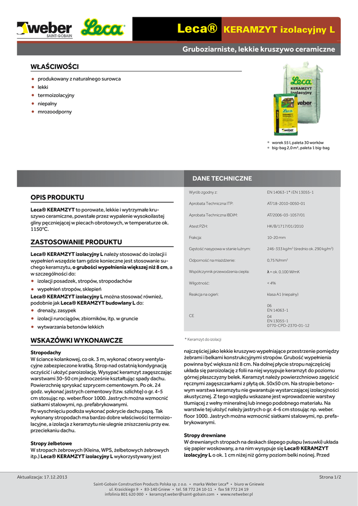 Leca® KERAMZYT izolacyjny L Gruboziarniste, lekkie kruszywo ceramiczne WŁAŚCIWOŚCI • produkowany z naturalnego surowca • lekki • termoizolacyjny • niepalny • mrozoodporny • worek 55 l, paleta 30 worków • big-bag 2,0 m³, paleta 1 big-bag DANE TECHNICZNE Opis produktu Leca® KERAMZYT to porowate, lekkie i wytrzymałe kruszywo ceramiczne, powstałe przez wypalenie wysokoilastej gliny pęczniejącej w piecach obrotowych, w temperaturze ok. 1150°C. Zastosowanie produktu Leca® KERAMZYT izolacyjny L należy stosować do izolacji i wypełnień wszędzie tam gdzie konieczne jest stosowanie suchego keramzytu, o grubości wypełnienia większej niż 8 cm, a w szczególności do: izolacji posadzek, stropów, stropodachów • • wypełnień stropów, sklepień Leca® KERAMZYT izolacyjny L można stosować również, podobnie jak Leca® KERAMZYT budowlany L do: drenaży, zasypek • • izolacji rurociągów, zbiorników, itp. w gruncie • wytwarzania betonów lekkich Wyrób zgodny z: EN 14063-1* i EN 13055-1 Aprobata Techniczna ITP: AT/18-2010-0050-01 Aprobata Techniczna IBDiM: AT/2006-03-1057/01 Atest PZH: HK/B/1717/01/2010 Frakcja: 10-20 mm Gęstość nasypowa w stanie luźnym: 246-333 kg/m3 (średnio ok. 290 kg/m3) Odporność na miażdżenie: 0,75 N/mm2 Współczynnik przewodzenia ciepła: λ = ok. 0,100 W/mK Wilgotność: < 4% Reakcja na ogień: klasa A1 (niepalny) CE 06 EN 14063-1 04 EN 13055-1 0770-CPD-2370-01-12 Wskazówki wykonawcze * Keramzyt do izolacji Stropodachy W ściance kolankowej, co ok. 3 m, wykonać otwory wentylacyjne zabezpieczone kratką. Strop nad ostatnią kondygnacją oczyścić i ułożyć paroizolację. Wysypać keramzyt zagęszczając warstwami 30-50 cm jednocześnie kształtując spady dachu. Powierzchnię spryskać szprycem cementowym. Po ok. 24 godz. wykonać jastrych cementowy (tzw. szlichtę) o gr. 4-5 cm stosując np. weber.floor 1000. Jastrych można wzmocnić siatkami stalowymi, np. prefabrykowanymi. Po wyschnięciu podłoża wykonać pokrycie dachu papą. Tak wykonany stropodach ma bardzo dobre właściwości termoizolacyjne, a izolacja z keramzytu nie ulegnie zniszczeniu przy ew. przeciekaniu dachu. najczęściej jako lekkie kruszywo wypełniające przestrzenie pomiędzy żebrami i belkami konstrukcyjnymi stropów. Grubość wypełnienia powinna być większa niż 8 cm. Na dolnej płycie stropu najczęściej układa się paroizolację z folii na niej wysypuje keramzyt do poziomu górnej płaszczyzny belek. Keramzyt należy powierzchniowo zagęścić ręcznymi zagęszczarkami z płytą ok. 50x50 cm. Na stropie betonowym warstwa keramzytu nie gwarantuje wystarczającej izolacyjności akustycznej. Z tego względu wskazane jest wprowadzenie warstwy tłumiącej z wełny mineralnej lub innego podobnego materiału. Na warstwie tej ułożyć należy jastrych o gr. 4-6 cm stosując np. weber. floor 1000. Jastrych można wzmocnić siatkami stalowymi, np. prefabrykowanymi. Stropy żelbetowe W stropach żebrowych (Kleina, WPS, żelbetowych żebrowych itp.) Leca® KERAMZYT izolacyjny L wykorzystywany jest Stropy drewniane W drewnianych stropach na deskach ślepego pułapu (wsuwki) układa się papier woskowany, a na nim wysypuje się Leca® KERAMZYT izolacyjny L o ok. 1 cm niżej niż górny poziom belki nośnej. Przed Aktualizacja: 17.12.2013 Strona 1/2 Saint-Gobain Construction Products Polska sp. z o.o. • marka Weber Leca® • biuro w Gniewie ul. Krasickiego 9 • 83-140 Gniew • tel. 58 772 24 10-11 • fax 58 772 24 19 infolinia 801 620 000 • [email protected] • www.netweber.pl Leca® KERAMZYT izolacyjny L Gruboziarniste, lekkie kruszywo ceramiczne ułożeniem drewnianej podłogi na belkach należy sprawdzić wilgotność ułożonego keramzytu. Można to sprawdzić układając na keramzycie szklana szybkę na okres nocy. Jeżeli rano szkło będzie bardzo zaparowane keramzyt należy przegrabić a pomieszczenia intensywnie wietrzyć. Po ułożeniu podłogi drewnianej (najlepiej z desek) wysypuje się ok. 5 cm warstwę drobnego Leca® KERAMZYTU podsypkowego. Warstwa ta skutecznie izoluje akustycznie i poziomuje płaszczyznę stropu. Na wyrównanej powierzchni drobnego keramzytu układa się gipsowo-kartonowe płyty systemów podłogowych,a na nich wierzchnią posadzkę. Przy ścianach należy pozostawić nieszczelności kolejnych warstw stropu, a szczególnie nieszczelności przy listwach cokołowych. Stropy drewniane to zawsze stropy przeprowadzające wilgoć z dolnych pomieszczeń do górnych i nigdy nie można szczelnie zamykać takich stropów. Ważna informacja Przy większości zastosowań układany keramzyt ulega zagęszczeniu 0-10%. Dlatego przy zakupie wskazane jest uwzględnienie kilku procentowego zapasu kruszywa. Opakowania • worek 55 l, paleta 30 worków tj. 1,65 m (ok. 505 kg) • big-bag 2,0 m , paleta 1 big-bag (ok. 605 kg) 3 3 Rozładunek palet wózkiem widłowym lub dźwigiem. Magazynowanie i transport Keramzytu w workach 55 l nie należy składować w nasłonecznionym miejscu powyżej 3 miesięcy. Grozi to uszkodzeniem foliowych worków. Keramzyt w big-bagach może być przechowany na zewnątrz przez okres do 6 miesięcy. Dłuższy okres przechowywania big-bagów w nasłonecznionym miejscu może obniżyć wytrzymałość opakowania. Środki bezpieczeństwa Przy układaniu keramzytu może powstawać niewielkie zapylenie. Zalecane jest stosowanie środków ochronnych na oczy i drogi oddechowe. Uwaga Producent gwarantuje jakość wyrobu, lecz nie ma wpływu na sposób jego zastosowania. Wyrób należy stosować zgodnie z podanym opisem, jednak przedstawione informacje nie mogą zastąpić fachowego przygotowania wykonawcy i nie zwalniają go ze stosowania się do zasad sztuki budowlanej i BHP. W przypadku wątpliwości zaleca się wykonać własne próby lub skontaktować się z Działem Technicznym Weber Leca®. Wraz z ukazaniem się tej karty technicznej tracą ważność karty wcześniejsze. Aktualizacja: 17.12.2013 St