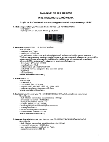ZAŁĄCZNIK NR 1DD DO SIWZ OPIS PRZEDMIOTU ZAMÓWIENIA Część nr 4 –Dostawa i instalacja wyposażenia komputerowego i RTV 1. Radiomagnetofon typu Wieża LG Model: XD 123 LUB RÓWNOWAŻNE - kolor czarny - wymiary: wys. 24 cm, szer. 17 cm, gł. 25,5 cm. 2. Komputer typu HP 3500 LUB RÓWNOWAŻNE Specyfikacja: - obudowa typu Tower - pamięć min 4 GB RAM - zainstalowany system operacyjny typu Windows 7 professional polska wersja językowa – Windows wymagany ze względu na dedykowane oprogramowanie używane we wszystkich placówkach Zamawiającego (54 żłobki i mini żłobki), oraz używanie makr w pakiecie Microsoft Office związanych z używanym systemem księgowym - dysk twardy SATA min 500 GB - napęd optyczny: DVD - karta sieciowa Ethernet 10/100/1000 - porty USB: min 6, z czego min 2 na przednim panelu - mysz USB - klawiatura USB wraz z montażem i instalacją 3. Monitor LCD 19" Specyfikacja: - przekątna 19" - czas reakcji 5ms lub lepszy - rozdzielczość: min 1440 x 900 lub 1280 x 1024 - podstawowe złącza: Analogowe (D-Sub) wraz z montażem i instalacją 4. Drukarka typu Kyocera typu FS-1320 DN LUB RÓWNOWAŻNE, urządzenie nabiurkowe Specyfikacja: - druk 28 stron na minutę z rozdzielczością 1200 dpi - żywotność bębna min 100000 stron - maksymalny rozmiar papieru A4 - podajnik papieru na 250 arkuszy - automatyczny druk dwustronny w standardzie - 32 MB pamięci RAM - sterowniki dla systemu Windows 7 - karta sieciowa Ethernet 10/100 wraz z montażem i instalacją 5. Urządzenie wielofunkcyjne typu Kyocera typu FS-1035MFP/DP LUB RÓWNOWAŻNE Specyfikacja: - druk 28 stron na minutę z rozdzielczością min. 600 dpi - żywotność bębna min 100000 stron - czas otrzymania pierwszej kopii ok. 7 sek. - rozdzielczość skanera 600 dpi 1 - w standardzie funkcje: drukowania i skanowania - w standardzie moduł druku dwustronnego - opcjonalny podajnik oryginałów 6. Telefax termiczny typu Panasonic KX-FT986PDB LUB RÓWNOWAŻNE Specyfikacja: - telefax na papier termiczny - cyfrowy automat zgłoszeniowy z 18 min czasem nagrywania - maksymalna prędkość modemu 9600 b/s(dobierana automatycznie) - pamięć dokumentów 28 stron - funkcja kopiowania - obsługa funkcji identyfikacji abonenta wywołującego - system głośno mówiący - dwuliniowy wyświetlacz LCD - komunikaty na wyświetlaczu LCD i wydruki raportów w języku polskim - przycisk nawigacyjny ułatwiający dostęp do funkcji telefaksu oraz książki telefonicznej - książka telefoniczna (100 numerów) 2