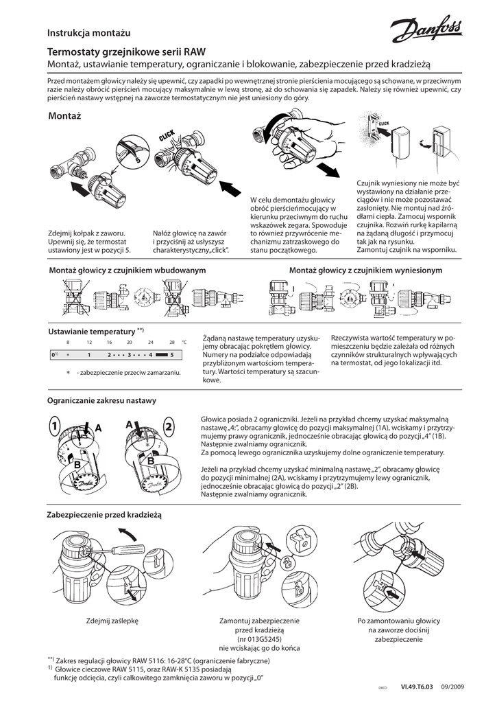 Instrukcja montażu Termostaty grzejnikowe serii RAW Montaż, ustawianie temperatury, ograniczanie i blokowanie, zabezpieczenie przed kradzieżą Przed montażem głowicy należy się upewnić, czy zapadki po wewnętrznej stronie pierścienia mocującego są schowane, w przeciwnym razie należy obrócić pierścień mocujący maksymalnie w lewą stronę, aż do schowania się zapadek. Należy się również upewnić, czy pierścień nastawy wstępnej na zaworze termostatycznym nie jest uniesiony do góry. Montaż Zdejmij kołpak z zaworu. Upewnij się, że termostat ustawiony jest w pozycji 5. Nałóż głowicę na zawór i przyciśnij aż usłyszysz charakterystyczny„click”. W celu demontażu głowicy obróć pierścieńmocujący w kierunku przeciwnym do ruchu wskazówek zegara. Spowoduje to również przywrócenie mechanizmu zatrzaskowego do stanu początkowego. Montaż głowicy z czujnikiem wbudowanym Ustawianie temperatury **) 8 12 16 20 24 28 * 1 2 • • • 3 • • • 4 5 01) * - zabezpieczenie przeciw zamarzaniu. °C Czujnik wyniesiony nie może być wystawiony na działanie przeciągów i nie może pozostawać zasłonięty. Nie montuj nad źródłami ciepła. Zamocuj wspornik czujnika. Rozwiń rurkę kapilarną na żądaną długość i przymocuj tak jak na rysunku. Zamontuj czujnik na wsporniku. Montaż głowicy z czujnikiem wyniesionym Żądaną nastawę temperatury uzyskujemy obracając pokrętłem głowicy. Numery na podziałce odpowiadają przybliżonym wartościom temperatury. Wartości temperatury są szacunkowe. Rzeczywista wartość temperatury w pomieszczeniu będzie zależała od różnych czynników strukturalnych wpływających na termostat, od jego lokalizacji itd. Ograniczanie zakresu nastawy 1 2 Głowica posiada 2 ograniczniki. Jeżeli na przykład chcemy uzyskać maksymalną nastawę „4:”, obracamy głowicę do pozycji maksymalnej (1A), wciskamy i przytrzymujemy prawy ogranicznik, jednocześnie obracając głowicą do pozycji „4” (1B). Następnie zwalniamy ogranicznik. Za pomocą lewego ogranicznika uzyskujemy dolne ograniczenie temperatury. Jeżeli na przykład chcemy uzyskać minimalną nastawę „2”, obracamy głowicę do pozycji minimalnej (2A), wciskamy i przytrzymujemy lewy ogranicznik, jednocześnie obracając głowicą do pozycji „2” (2B). Następnie zwalniamy ogranicznik. Zabezpieczenie przed kradzieżą Zdejmij zaślepkę Zamontuj zabezpieczenie przed kradzieżą (nr 013G5245) nie wciskając go do końca Po zamontowaniu głowicy na zaworze dociśnij zabezpieczenie **) Zakres regulacji głowicy RAW 5116: 16-28°C (ograniczenie fabryczne) 1) Głowice cieczowe RAW 5115, oraz RAW-K 5135 posiadają funkcję odcięcia, czyli całkowitego zamknięcia zaworu w pozycji „0” DKCD VI.49.T6.03 09/2009