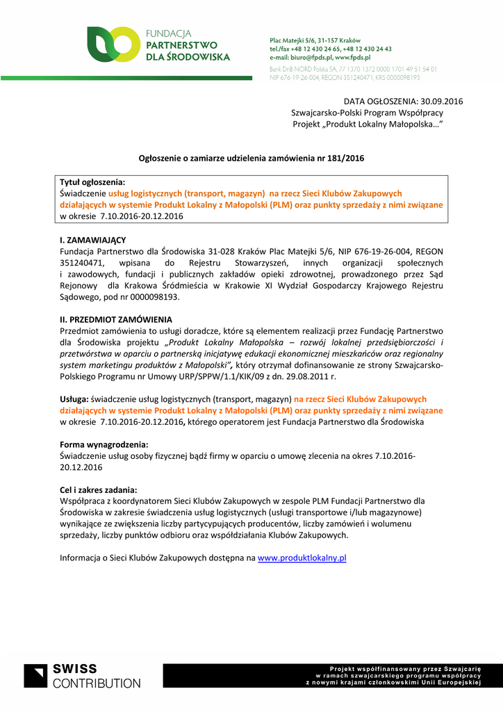 DATA OGŁOSZENIA: 30.09.2016 Szwajcarsko-Polski Polski Program Współpracy Projekt „Produkt Lokalny Małopolska…” Ogłoszenie o zamiarze udzielenia zamówienia nr 181/2016 6 Tytuł ogłoszenia: Świadczenie usług logistycznych (transport, magazyn) na rzecz Sieci Klubów Zakupowych działających w systemie Produkt Lokalny z Małopolski (PLM) oraz punkty sprzedaży z nimi związane w okresie 7.10.2016-20.12.2016 .2016 I. ZAMAWIAJĄCY Środowi 31-028 Kraków Plac Matejki 5/6, NIP 676-19-26-004, 676 REGON Fundacja Partnerstwo dla Środowiska 351240471, wpisana do Rejestru Stowarzyszeń, innych organizacji społecznych i zawodowych, fundacji i publicznych zakładów opieki zdrowotnej, prowadzonego przez Sąd Rejonowy dla Krakowa wa Śródmieścia w Krakowie XI Wydział Gospodarczy Krajowego Rejestru Sądowego, pod nr 0000098193. II. PRZEDMIOT ZAMÓWIENIA Przedmiot ot zamówienia to usługi doradcze, doradcze, które są elementem realizacji przez Fundację Partnerstwo dla Środowiska projektu „Produkt Lokalny L Małopolska – rozwój lokalnej przedsiębiorczości i przetwórstwa w oparciu o partnerską inicjatywę edukacji ekonomicznej mieszkańców oraz regionalny system marketingu produktów z Małopolski”, Małopolski” który otrzymał dofinansowanie ze strony SzwajcarskoSzwajcarsko Polskiego Programu nr Umowy URP/SPPW/1.1/KIK/09 z dn. 29.08.2011 r. Usługa: świadczenie usług logistycznych (transport, magazyn) na rzecz Sieci Klubów Zakupowych działających w systemie Produkt Lokalny z Małopolski (PLM) oraz punkty sprzedaży z nimi związane w okresie 7.10.2016-20.12.2016 20.12.2016, którego operatorem jest Fundacja Partnerstwo dla Środowiska Forma wynagrodzenia: Świadczenie usług osoby fizycznej bądź firmy w oparciu o umowę zlecenia na okres 7.10.201620.12.2016 Cel i zakres zadania: Współpraca z koordynatorem Sieci Klubów Zakupowych w zespole PLM Fundacji Partnerstwo dla Środowiska w zakresie świadczenia usług logistycznych (usługi (usługi transportowe i/lub magazynowe) wynikające ze zwiększenia liczby partycypujących producentów, liczby zamówień zamówień i wolumenu sprzedaży, liczby punktów odbioru oraz współdziałania Klubów Zakupowych. Informacja o Sieci Klubów Zakupowych dostępna na www.produktlokalny.pl III. OPIS WARUNKÓW PRZYJĘCIA CIA PRZEZ ZLECAJĄCEGO ZLECAJ CEGO OFERT ORAZ OPIS SPOSOBU DOKONYWANIA OCENY SPEŁNIANIA TYCH WARUNKÓW 1. Uwarunkowania Zamawiającego: a) W celu właściwego przygotowania Oferty Zamawiający może na wniosek Oferenta przekazać materiały w postaci Kompletnej Propozycji Projektu Produkt Lokalny Małopolska. b) W celu realizacji zamówienia Zamawiający przekaże Wykonawcy inne materiały i opracowania dotyczące projektu Produkt Lokalny Małopolska i przygotowane dotychczas na jego potrzeby – w szczególności w zakresie działalności Sieci Klubów Zakupowych (wykaz Klubów Zakupowych w systemie PLM na www.produktlokalny.pl) . c) Zamawiający dopuszcza możliwość powierzenia części lub całości ałości zamówienia podwykonawcom, wykonawcom, po uzyskaniu uprzedniej zgody Zamawiającego. d) Zamawiający dopuszcza możliwość składania cząstkowych ofert (tzn. wskazujący obszary geograficzne,, marszruty, które jest w stanie obsłużyć czy też powierzchnie magazynowe, które jest w stanie udostępnić) udostępnić e) Rozliczenia między dzy Zamawiającym Zamawiaj a Wykonawcą będą prowadzone w PLN. f) Zapytanie ofertowe jest przeprowadzane zgodnie z obowiązującym w Fundacji Partnerstwo dla Środowiska Regulaminem Zamówień, które uwzględnia wymogi Szwajcarsko-Polskiego Szwajcarsko Programu Współpracy. 2. Wymagane kwalifikacje Oferenta: Oferenta a) Oferent powinien zapewnić obsługę transportową i/lub techniczną (obsługa magazynu) i/lub magazynową związaną z logistyką, zgodnie z obowiązującymi przepisami i standardami odby co najmniej b) Oferent powinien założyć, że dostawy w Klubach Zakupowych będą się odbywały raz w tygodniu, uwzględniając również możliwość świadczenia usług transportowych lub/i l magazynowych w innych terminach. c) Wskazać, które obszary geograficzne działalności Klubów Zakupowych jest w stanie obsłużyć usługą transportową lub/i magazynową 2/ Oferent może przedstawić inne certyfikaty, świadectwa i dyplomy potwierdzające posiadane kwalifikacje, co będzie dodatkowym atutem. IV. OPIS SPOSOBU PRZYGOTOWANIA OFERTY 1. Oferta powinna: • posiadać datę sporządzenia, • zawierać adres lub siedzibę oferenta, numer telefonu, numer NIP, • być podpisana czytelnie przez wykonawcę, • Opis obszaru geograficznego (region działalności Klubu Zakupowego), Zakupowego), który może być obsłużony, znajomość lokalnych rolników i producent ów • zawierać cenę (netto oraz brutto) z wyszczególnieniem ceny za 1km transportu towaru, 1godz. obsługi technicznej magazynu, za 1 m2/24ha powierzchni magazynowej • Opis samochodu (rodzaj, pojemność, typ np. samochód chłodnia) – jeśli dotyczy • Opis magazynu (powierzchnia, wyposażenie np. w lodówki, zamrażarki) – jeśli dotyczy • zawierać datę ważności oferty, oferty 2. Zaoferowana cena powinna uwzględniać uwzgl wykonanie wszystkich prac i czynności czynno oraz zawierać wszelkie koszty związane zane z realizacją realizacj zamówienia, świadczonego wiadczonego przez okres i na warunkach określonych lonych w ofercie Wykonawcy. Wykonawcy 3. Ceny podane w ofercie nie podlegają podlegaj zmianom przez cały okres obowiązywania zywania umowy. 4. Ceny należy wyrazić w jednostkach pieniężnych pieni tj. z dokładnością do dwóch miejsc po przecinku. V. MIEJSCE ORAZ TERMIN SKŁADANIA OFERT 1. Oferta powinna być przesłana za pośrednictwem poczty elektronicznej (adres: [email protected]), poczty, kuriera lub też eż dostarczona osobiście na adres Fundacji w kopercie opisanej w poniższy sposób: „Produkt Lokalny Małopolska” – Oferta dot. Zam