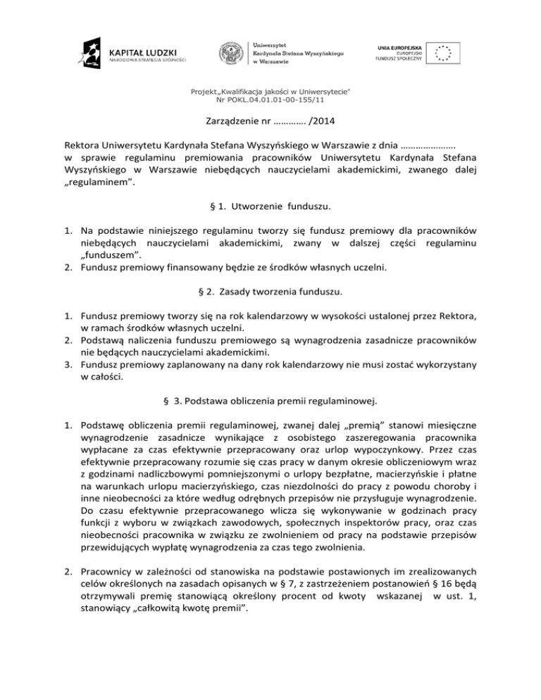 Projekt „Kwalifikacja jakości w Uniwersytecie” Nr POKL.04.01.01-00-155/11 Zarządzenie nr …………. /2014 Rektora Uniwersytetu Kardynała Stefana Wyszyńskiego w Warszawie z dnia …………………. w sprawie regulaminu premiowania pracowników Uniwersytetu Kardynała Stefana Wyszyńskiego w Warszawie niebędących nauczycielami akademickimi, zwanego dalej „regulaminem”. § 1. Utworzenie funduszu. 1. Na podstawie niniejszego regulaminu tworzy się fundusz premiowy dla pracowników niebędących nauczycielami akademickimi, zwany w dalszej części regulaminu „funduszem”. 2. Fundusz premiowy finansowany będzie ze środków własnych uczelni. § 2. Zasady tworzenia funduszu. 1. Fundusz premiowy tworzy się na rok kalendarzowy w wysokości ustalonej przez Rektora, w ramach środków własnych uczelni. 2. Podstawą naliczenia funduszu premiowego są wynagrodzenia zasadnicze pracowników nie będących nauczycielami akademickimi. 3. Fundusz premiowy zaplanowany na dany rok kalendarzowy nie musi zostać wykorzystany w całości. § 3. Podstawa obliczenia premii regulaminowej. 1. Podstawę obliczenia premii regulaminowej, zwanej dalej „premią” stanowi miesięczne wynagrodzenie zasadnicze wynikające z osobistego zaszeregowania pracownika wypłacane za czas efektywnie przepracowany oraz urlop wypoczynkowy. Przez czas efektywnie przepracowany rozumie się czas pracy w danym okresie obliczeniowym wraz z godzinami nadliczbowymi pomniejszonymi o urlopy bezpłatne, macierzyńskie i płatne na warunkach urlopu macierzyńskiego, czas niezdolności do pracy z powodu choroby i inne nieobecności za które według odrębnych przepisów nie przysługuje wynagrodzenie. Do czasu efektywnie przepracowanego wlicza się wykonywanie w godzinach pracy funkcji z wyboru w związkach zawodowych, społecznych inspektorów pracy, oraz czas nieobecności pracownika w związku ze zwolnieniem od pracy na podstawie przepisów przewidujących wypłatę wynagrodzenia za czas tego zwolnienia. 2. Pracownicy w zależności od stanowiska na podstawie postawionych im zrealizowanych celów określonych na zasadach opisanych w § 7, z zastrzeżeniem postanowień § 16 będą otrzymywali premię stanowiącą określony procent od kwoty wskazanej w ust. 1, stanowiący „całkowitą kwotę premii”. Projekt „Kwalifikacja jakości w Uniwersytecie” Nr POKL.04.01.01-00-155/11 § 4. Wysokość premii. Ustala się maksymalną wysokość premii dla następujących poziomów stanowisk: Poziom stanowisk N-1 Stanowisko Maksymalna wysokość premii w % Kanclerz, Kwestor, Dyrektor Kancelarii Rektora 40% podstawy premii Kierownicy, zastępcy Kanclerza i Kwestora, Dyrektor 20% podstawy premii Wydawnictwa ( w tym p.o. tych stanowisk) N-2 N-3 zastępcy kierowników 10% podstawy premii pozostali pracownicy 5% podstawy premii § 5. Stanowiska uprawione do stawiania celów. Osobami uprawnionymi do stawania celów są pracownicy zatrudnieni na następujących stanowiskach: a) Rektor, b) Prorektor, c) Dziekan, d) Kanclerz, e) Kwestor, f) Dyrektor Kancelarii Rektora; zwani dalej „przełożonymi stawiającymi cele premiowe” lub „przełożonymi” w niniejszym regulaminie. § 6. Charakter premii. Przełożeni zobowiązani są do przedstawienia celów, których realizacja powoduje powstanie obowiązku wypłaty premii na zasadach i w wysokości określonej treścią niniejszego regulaminu. Projekt „Kwalifikacja jakości w Uniwersytecie” Nr POKL.04.01.01-00-155/11 § 7. Charakterystyka celów. 1. Cele stawiane dla poziomu stanowisk N-1 mają charakter ogólny i muszą : a) odnosić się do wskaźników ekonomicznych uczelni w szczególności związanych z maksymalizacją źródeł finansowania Uczelni, b) odnosić się do współpracy pracownika z innymi osobami z poziomu przełożonych; a także charakter indywidualny i w tym zakresie muszą: c) odnosić się do wyników związanych z rozwojem naukowym i dydaktyką Uczelni d) być powiązane z bieżącą działalnością operacyjną wynikającą z pełnionej funkcją przez pracownika. 2. Cele stawiane dla poziomu stanowisk N-2 i N-1 maja charakter zespołowy i muszą: a) odnosić się do strategicznych priorytetów dla administracji UKSW, b) być powiązane z bieżącą/ stałą działalnością operacyjną jednostki, c) odnosić się do wzrostu kompetencji i umiejętności pracowników jednostki, d) odnosić się do współpracy między komórkami. § 8. Cele indywidualne. 1. Cele indywidualne będą stawiane osobno dla poszczególnych pracowników zajmujących następujące stanowiska: Kanclerz, Kwestor, Dyrektor Kancelarii Rektora. 2. W uzasadnionych przypadkach cele indywidualne mogą być takie same dla stanowisk wymienionych w ust. 1. § 9. Cele zespołowe i ogólne. 1. Cele zespołowe będą stawiane dla stanowisk, których regulamin dotyczy w ramach danej jednostki organizacyjnej. 2. Cele ogólne będą stawiane dla pracowników zajmujących następujące stanowiska: Kanclerz, Kwestor, Dyrektor Kancelarii Rektora. 3. Jeżeli będzie to w danej sytuacji uzasadnione, cele zespołowe dla wybranej grupy pracowników lub poszczególnych stanowisk mogą być identyczne jak dla innych grup lub stanowisk. § 10. Formułowanie celów. 1. Podstawowym założeniem dla stawiania celów pracownikom jest zwiększenie indywidualnej i zespołowej efektywności. 2. Przy uwzględnieniu ust. 1, postawione cele muszą być obiektywnie możliwe do realizacji, sformułowane w sposób zrozumiały oraz w taki sposób opisane, aby możliwa była weryfikacja poziomu ich realizacji. Projekt „Kwalifikacja jakości w Uniwersytecie” Nr POKL.04.01.01-00-155/11 3. Każdemu z celów musi być przyporządkowany równy procent z wysokości premii ustalonej w § 4. Suma procentów określonych dla każdego z celów wynosi 100%. 4. Przełożony odpowiedzialny jest za należyte postawienie celów. 5. Pracownik/pracownicy nie mogą ponosić odpowiedzialności za nienależyte postawienie celu pr