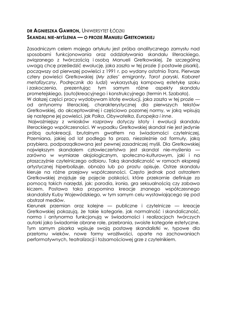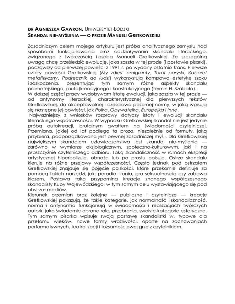 DR AGNIESZKA GAWRON, UNIWERSYTET ŁÓDZKI SKANDAL NIE-MYŚLENIA — O PROZIE MANUELI GRETKOWSKIEJ Zasadniczym celem mojego artykułu jest próba analitycznego zamysłu nad sposobami funkcjonowania oraz oddziaływania skandalu literackiego, związanego z twórczością i osobą Manueli Gretkowskiej. Ze szczególną uwagą chcę prześledzić ewolucję, jaka zaszła w tej prozie (i postawie pisarki), począwszy od pierwszej powieści z 1991 r. po wydany ostatnio Trans. Pierwsze cztery powieści Gretkowskiej (My zdies’ emigranty, Tarot paryski, Kabaret metafizyczny, Podręcznik do ludzi) wykorzystują kampową estetykę szoku i zaskoczenia, prezentując tym samym różne aspekty skandalu prometejskiego, (auto)kreacyjnego i konstrukcyjnego (termin H. Szabała). W dalszej części pracy wydobywam istotę ewolucji, jaka zaszła w tej prozie — od antynormy literackiej, charakterystycznej dla pierwszych tekstów Gretkowskiej, do akceptowalnej i częściowo pozornej normy, w jaką wpisują się następne jej powieści, jak Polka, Obywatelka, Europejka i inne. Najważniejszy z wniosków rozprawy dotyczy istoty i ewolucji skandalu literackiego współczesności. W wypadku Gretkowskiej skandal nie jest jedynie próbą autokreacji, brutalnym gwałtem na świadomości czytelniczej. Przemiana, jakiej od lat podlega ta proza, niezależnie od formuły, jaką przybiera, podporządkowana jest pewnej zasadniczej myśli. Dla Gretkowskiej największym skandalem człowieczeństwa jest skandal nie-myślenia — zarówno w wymiarze aksjologicznym, społeczno-kulturowym, jaki i na płaszczyźnie czytelniczego odbioru. Taką skandaliczność w ramach ekspresji artystycznej hiperbolizuje, obnaża lub po prostu opisuje. Ostrze skandalu kieruje na różne przejawy współczesności. Często jednak pod ostrzałem Gretkowskiej znajduje się pojęcie polskości, które przekornie definiuje za pomocą takich narzędzi, jak: parodia, ironia, gra seksualnością czy zabawa kiczem. Postawa taka przypomina kreacje znanego współczesnego skandalisty Kuby Wojewódzkiego, w tym samym celu wystawiającego się pod obstrzał mediów. Kierunek przemian oraz kolejne — publiczne i czytelnicze — kreacje Gretkowskiej pokazują, że takie kategorie, jak normalność i skandaliczność, norma i antynorma funkcjonują w świadomości i realizacjach twórczych autorki jako świadomie obrane role, przebrania, swoiste kategorie estetyczne. Tym samym pisarka wpisuje swoją postawę skandalistki w, typowe dla przełomu wieków, nowe formy wrażliwości, oparte na zachowaniach performatywnych, teatralizacji i tożsamościowej grze z czytelnikiem.