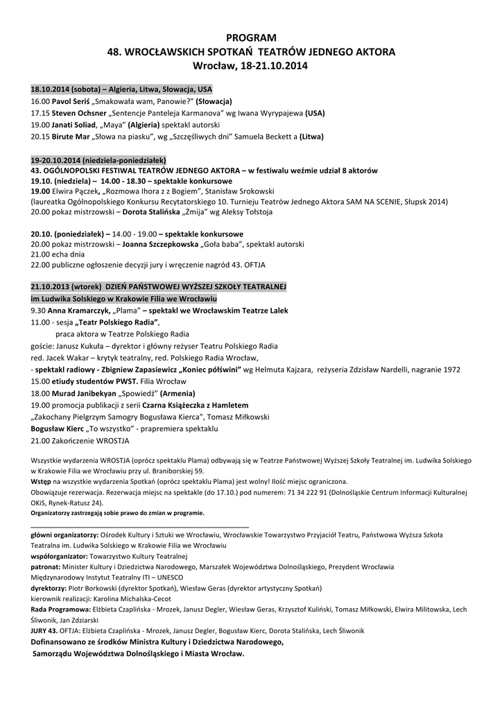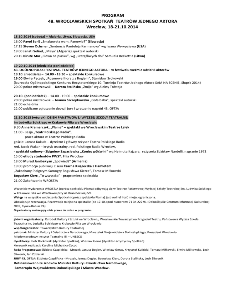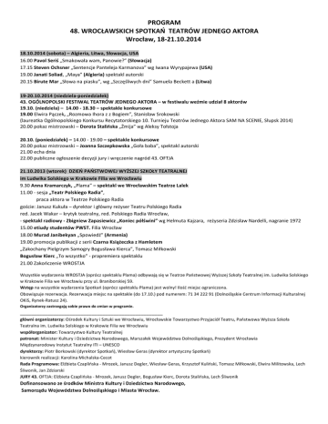 PROGRAM 48. WROCŁAWSKICH SPOTKAŃ TEATRÓW JEDNEGO AKTORA Wrocław, 18-‐21.10.2014 18.10.2014 (sobota) – Algieria, Litwa, Słowacja, USA 16.00 Pavol Seriś „Smakowała wam, Panowie?” (Słowacja) 17.15 Steven Ochsner „Sentencje Panteleja Karmanova” wg Iwana Wyrypajewa (USA) 19.00 Janati Soliad, „Maya” (Algieria) spektakl autorski 20.15 Birute Mar „Słowa na piasku”, wg „Szczęśliwych dni” Samuela Beckett a (Litwa) 19-‐20.10.2014 (niedziela-‐poniedziałek) 43. OGÓLNOPOLSKI FESTIWAL TEATRÓW JEDNEGO AKTORA – w festiwalu weźmie udział 8 aktorów 19.10. (niedziela) – 14.00 -‐ 18.30 – spektakle konkursowe 19.00 Elwira Pączek, „Rozmowa Ihora z z Bogiem”, Stanisław Srokowski (laureatka Ogólnopolskiego Konkursu Recytatorskiego 10. Turnieju Teatrów Jednego Aktora SAM NA SCENIE, Słupsk 2014) 20.00 pokaz mistrzowski – Dorota Stalińska „Żmija” wg Aleksy Tołstoja 20.10. (poniedziałek) – 14.00 -‐ 19.00 – spektakle konkursowe 20.00 pokaz mistrzowski – Joanna Szczepkowska „Goła baba”, spektakl autorski 21.00 echa dnia 22.00 publiczne ogłoszenie decyzji jury i wręczenie nagród 43. OFTJA 21.10.2013 (wtorek) DZIEŃ PAŃSTWOWEJ WYŻSZEJ SZKOŁY TEATRALNEJ im Ludwika Solskiego w Krakowie Filia we Wrocławiu 9.30 Anna Kramarczyk, „Plama” – spektakl we Wrocławskim Teatrze Lalek 11.00 -‐ sesja „Teatr Polskiego Radia”, praca aktora w Teatrze Polskiego Radia goście: Janusz Kukuła – dyrektor i główny reżyser Teatru Polskiego Radia red. Jacek Wakar – krytyk teatralny, red. Polskiego Radia Wrocław, -‐ spektakl radiowy -‐ Zbigniew Zapasiewicz „Koniec półświni” wg Helmuta Kajzara, reżyseria Zdzisław Nardelli, nagranie 1972 15.00 etiudy studentów PWST. Filia Wrocław 18.00 Murad Janibekyan „Spowiedź” (Armenia) 19.00 promocja publikacji z serii Czarna Książeczka z Hamletem „Zakochany Pielgrzym Samogry Bogusława Kierca”, Tomasz Miłkowski Bogusław Kierc „To wszystko” -‐ prapremiera spektaklu 21.00 Zakończenie WROSTJA Wszystkie wydarzenia WROSTJA (oprócz spektaklu Plama) odbywają się w Teatrze Państwowej Wyższej Szkoły Teatralnej im. Ludwika Solskiego w Krakowie Filia we Wrocławiu przy ul. Braniborskiej 59. Wstęp na wszystkie wydarzenia Spotkań (oprócz spektaklu Plama) jest wolny! Ilość miejsc ograniczona. Obowiązuje rezerwacja. Rezerwacja miejsc na spektakle (do 17.10.) pod numerem: 71 34 222 91 (Dolnośląskie Centrum Informacji Kulturalnej OKiS, Rynek-‐Ratusz 24). Organizatorzy zastrzegają sobie prawo do zmian w programie. ____________________________________________________ główni organizatorzy: Ośrodek Kultury i Sztuki we Wrocławiu, Wrocławskie Towarzystwo Przyjaciół Teatru, Państwowa Wyższa Szkoła Teatralna im. Ludwika Solskiego w Krakowie Filia we Wrocławiu współorganizator: Towarzystwo Kultury Teatralnej patronat: Minister Kultury i Dziedzictwa Narodowego, Marszałek Województwa Dolnośląskiego, Prezydent Wrocławia Międzynarodowy Instytut Teatralny ITI – UNESCO dyrektorzy: Piotr Borkowski (dyrektor Spotkań), Wiesław Geras (dyrektor artystyczny Spotkań) kierownik realizacji: Karolina Michalska-‐Cecot Rada Programowa: Elżbieta Czaplińska -‐ Mrozek, Janusz Degler, Wiesław Geras, Krzysztof Kuliński, Tomasz Miłkowski, Elwira Militowska, Lech Śliwonik, Jan Zdziarski JURY 43. OFTJA: Elżbieta Czaplińska -‐ Mrozek, Janusz Degler, Bogusław Kierc, Dorota Stalińska, Lech Śliwonik Dofinansowano ze środków Ministra Kultury i Dziedzictwa Narodowego, Samorządu Województwa Dolnośląskiego i Miasta Wrocław.
