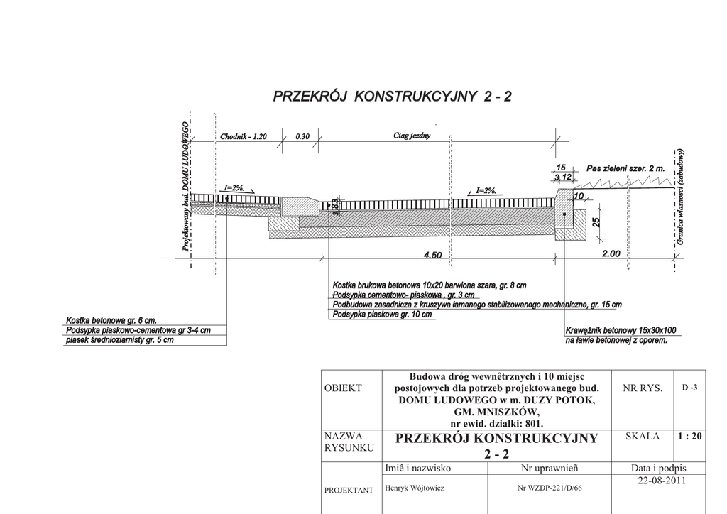 Kostka betonowa gr. 6 cm. Podsypka piaskowo-cementowa gr 3-4 cm piasek œrednioziarnisty gr. 5 cm Ciag jezdny 0.30 15 3 12 I=2%. I=2%. Pas zieleni szer. 2 m. 25 10 Granica wlasnosci (zabudowy) Chodnik - 1.20 3 83 Projektowany bud. DOMU LUDOWEGO PRZEKRÓJ KONSTRUKCYJNY 2 - 2 2.00 4.50 Kostka brukowa betonowa 10x20 barwiona szara, gr. 8 cm Podsypka cementowo- piaskowa , gr. 3 cm Podbudowa zasadnicza z kruszywa ³amanego stabilizowanego mechaniczne, gr. 15 cm Podsypka piaskowa gr. 10 cm Krawê¿nik betonowy 15x30x100 na ³awie betonowej z oporem. OBIEKT NAZWA RYSUNKU Budowa dróg wewnêtrznych i 10 miejsc postojowych dla potrzeb projektowanego bud. DOMU LUDOWEGO w m. DUZY POTOK, GM. MNISZKÓW, nr ewid. dzialki: 801. PRZEKRÓJ KONSTRUKCYJNY 2-2 Imiê i nazwisko PROJEKTANT Henryk Wójtowicz Nr uprawnieñ Nr WZDP-221/D/66 NR RYS. D -3 SKALA 1 : 20 Data i podpis 22-08-2011