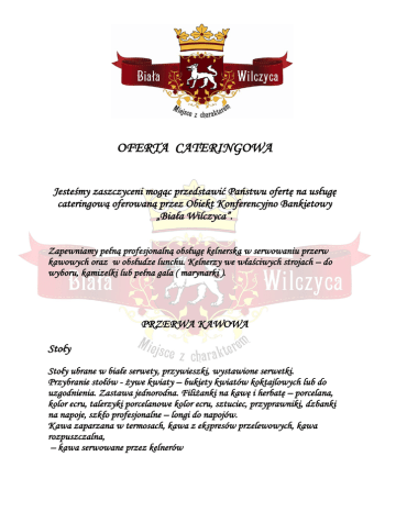 OFERTA CATERINGOWA Jesteśmy zaszczyceni mogąc przedstawić Państwu ofertę na usługę cateringową oferowaną przez Obiekt Konferencyjno Bankietowy „Biała Wilczyca”. Zapewniamy pełną profesjonalną obsługę kelnerską w serwowaniu przerw kawowych oraz w obsłudze lunchu. Kelnerzy we właściwych strojach – do wyboru, kamizelki lub pełna gala ( marynarki ). PRZERWA KAWOWA Stoły Stoły ubrane w białe serwety, przywieszki, wystawione serwetki. Przybranie stołów - żywe kwiaty – bukiety kwiatów koktajlowych lub do uzgodnienia. Zastawa jednorodna. Filiżanki na kawę i herbatę – porcelana, kolor ecru, talerzyki porcelanowe kolor ecru, sztuciec, przyprawniki, dzbanki na napoje, szkło profesjonalne – longi do napojów. Kawa zaparzana w termosach, kawa z ekspresów przelewowych, kawa rozpuszczalna, – kawa serwowane przez kelnerów MENU - kawa mielona, kawa rozpuszczalna - śmietanka, mleko do kawy (ciepłe) - herbata – różne smaki, cytryna - cukier biały, cukier brązowy, słodzik - naturalny sok marki Tymbark z Grupy Maspex Wadowice - jabłkowy i pomarańczowy, serwowany w dzbankach - naturalna woda źródlana czerpana ze źródeł w górach Beskidu Sądeckiego – Kropla Beskidu - woda gazowana podana w butelkach plastikowych o pojemności 500 ml - woda niegazowana podawana w dzbankach – czysta oraz z cytryną i liśćmi mięty - kullery z lodem - ciastka cukiernicze z Firmy Józef Wilk www.jozefwilk.pl mix ciastek bankietowych serwowane na kutych paterach – sernik, jabłecznik, piernik, drobne babeczki nadziewane kremami i owocami – wszystko podane w papilotkach - owoce serwowane na kutych paterach – winogrona białe, ciemne, owoce sezonowe, jabłka, Cena brutto na osobę 30,00 zł LUNCH Stoły przybrane białymi obrusami i przywieszkami złotymi lub ecru do wyboru. Porcelana jednorodna kolor ecru, sztuciec, serwetki. Dekoracja kwiatowa, świeczniki kute lub szklane (uzależnione od przestrzeni na stołach). Potrawy wydane na lustrach, srebrnych paterach oraz deski do serów. Ciepły bufet - zapiekanka warzywna - jarskie pierogi własnego wyrobu - ruskie, z mięsem, ze szpinakiem szynka pieczona na zasmażanej kapuście barszcz czerwony solo Zimny bufet - mięsa pieczone ( schab, karczek, szynka, rolady mięsne ) - wędliny - wyroby własne z regionu Luborzyca-Kocmyrzów ( pasztety, kiełbasy) - kęsy serów - tarta serowa z ziołami - sałatka po grecku - studzienina (regionalne-galaretki wieprzowe) Pieczywo – jasne i ciemne Napitki – kawa, herbata, woda, soki Cena brutto na osobę 90,00 zł Zapewniamy wysoką jakość produktów i obsługi. Obsługa oraz aranżacja stołów cenie zlecenia. Pragniemy nadmienić – mamy doświadczenie i sukcesy w zakresie obsługi zleceń tak ważnych uroczystości. Byliśmy wykonawcami obsługi cateringowej zorganizowanej z okazji otwarcia (po remoncie) Sukiennic. Jesteśmy w gronie najmłodszych członków Kongregacji Kupieckiej w Krakowie. Zapraszamy do skorzystania z naszej usługi cateringowej. Życzymy samych sukcesów i wspaniałych Spotkań. Kontakt: Krystyna Stanowska Tel: 799 06 79 17 Biała Wilczyca Anna i Marek Osiakowscy Wilków 90, 32-010 Kocmyrzów Tel. 515 838 965, Tel/fax 12 685 21 31 e-mail: [email protected] www.białawilczyca.pl