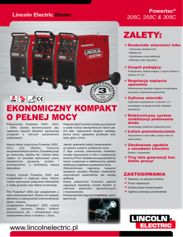 Powertec® 205C, 255C & 305C Lincoln Electric Bester Zalety: aDoskonałe własności łuku • Doskonałe zapalanie łuku • Stabilny łuk • Zredukowany czas stabilizacji • Minimalna ilość odprysków aZespół podający Profesjonalny zespół podający z dużymi rolkami o średnicy 37 mm. aRegulacja napięcia spawania Wieloskokowa regulacja napięcia umożliwiająca precyzyjne nastawianie parametrów. aCyfrowe mierniki Ekonomiczny kompakt o pełnej mocy Półautomaty Powertec 205C, 255C i 305C zostały skonstruowane aby zapewnić naszym klientom typoszereg urządzeń o różnych parametrach wyjściowych. Półautomaty Powertec zostały wyposażone w wiele funkcji standardowych takich jak: 2/4 takt, regulowanà długość wolnego końca drutu, spawanie punktowe oraz testy gazu i drutu. Naszą ofertę rozpoczyna Powertec 205C, który jest idealną maszyną do spawania blach cienkich. Charakteryzuje go doskonały, stabilny łuk i bardzo łatwy zapłon, co pozwala wykonywać prace spawalnicze sprawnie, szybko i profesjonalnie, z minimalną ilością odprysków. Jakość spawania zależy bezpośrednio od jakości systemu podawania drutu. Z tego powodu półautomaty Powertec zostały wyposażone w rolki o zwiększonej średnicy 37mm. Dodatkowo wyposażyliśmy nasze urządzenia w elektroniczny system stabilizacji prędkości podawania drutu. Wieloskokowa regulacja napięcia spawania umożliwi Państwu znalezienie optymalnych parametrów dla każdej aplikacji. Każdy półautomat Powertec spełnia najwyższe standardy Lincoln Electric w zakresie własności spawalniczych i niezawodności. Potwierdzeniem tego jest trzyletnia, pełna gwarancja. Kolejny produkt Powertec 255C jest urządzeniem o większej mocy, którym można wykonywać połączenia elementów o małej grubości oraz lekkie konstrukcje. The Powertec® 305C jest urządzeniem o wielu zastosowaniach. Można nim spawać elementy o małej grubości oraz konstrukcje lekkie i średnie. Urządzeniem Powertec® 305C można spawać zarówno łukiem krótkim (zwarciowym) jak i natryskowym przy zastosowaniu drutu o średnicy 1,0mm. www.lincolnelectric.pl Opcjonalne wyposażenie w mierniki V i A pozwalające na lepszą kontrolę nastawów parametrów. aElektroniczny system stabilizacji podawania drutu Gwarantujący stabilność podawania drutu. aŁatwe przemieszczanie Wyposażone w duże kółka, rączkę i haki do podnoszenia. aZbudowane zgodnie z zasadami Lincolna Solidne i niezawodne. aTrzy lata gwarancji bez limitu pracy! Zastosowania aNaprawy na placach budowy aPrace naprawcze aDrobne prace konstrukcyjne aOgólna produkcja przemysłowa Dane techniczne Produkt Indeks Powertec® 205C Powertec® 255C Powertec® 305C Powertec® 305C 4R Napięcie zasilania Zabezp. K14054-1 400V/3/50-60Hz 16A K14054-2 230/400V/3/50-60Hz 25/16A K14055-1 400V/3/50-60Hz 16A K14055-2 230/400V/3/50-60Hz 32/16A K14056-1 400V/3/50-60Hz 25A K14056-2 230/400V/3/50-60Hz 40/25A K14056-3 400V/3/50-60Hz 25A K14056-4 230/400V/3/50-60Hz 40/25A Parametry wyjściowe Produkt Zakres prądu (A) Powertec® 205C Powertec® 255C Powertec 305C ® Wymiary WxSxD (mm) 74 765 x 427 x 850 200 A / 24 V / 35% 150 A / 21.5 V / 60% 94 IP23 / H 810 x 467 x 930 EN 60974-1 / EN 50199 CE ROHS 95 Indeks Opis KP14016-0.8 / -1.0 / -1.2 Zestaw rolek- drut lity - podajnik 2 rolkowy KP14016-1.2A Zestaw rolek- drut aluminiowy - pod. 2 rol. Zestaw rolek - drut rdzeniowy- pod. 2 rol. 25-250 250 A / 26.5 V / 35% 190 A / 23.5 V / 60% KP14017-0.8 / -1.0 / -1.2 Zestaw rolek - drut lity - podajnik 4 rolkowy 30-300 300 A / 29 V / 35% 225 A / 25.2 V / 60% KP14017-1.2A Zestaw rolek - drut aluminiowy- pod. 4 rol. KP14017-1.1R / 1.6R Zestaw rolek- drut rdzeniowy - pod. 4 rol. Na zapytanie Reduktor gazu K14076-1 Zestaw do zmiany polaryzacji PT205C K14077-1 Zestaw do zmiany polar. PT255C & 305C K14049-1 K14009-1 Zestaw mierników V/A Zestaw zasilania podgrzewacza CO2 Uchwyty linc gun Uchwyt Cykl pracy Indeks LG 150 G 150A 60% K10413-15 LG 250 G 200A 60% K10413-25 LG 240 G 220A 60% K10413-24 LG 260 G 260A 60% K10413-26 LG 360 G 335A 60% K10413-36 Długość 3m/4m/5m Dobór produktów 50 100 150 200 250 300 350 400 MC 710-H Ø 1,6 mm MC 710-H Ø 1,4 mm MC 710-H Ø 1,2 mm Supramig® Ø 1,2 mm Supramig® Ø 1,0 mm Polska: Lincoln Electric Bester Tel : +48 74 64 61 100 e.mail : [email protected] Holandia : Lincoln Smitweld Tel : + 31 24 3522 911 e.mail : [email protected] Belgia : Lincoln Smitweld Belgium Tel : +32 54 33 42 12 e.mail : [email protected] Norwegia : Sveiseeksperten AS Tel : +47 22 08 00 94 e.mail : [email protected] Dania : Lincoln Electric Nordic Tel :+ 45 86 26 51 00 e.mail : [email protected] Portugalia : Electro Arco Tel : +351 21 238 7300 Finlandia : Lincoln Electric Nordic Tel : +3+35 8 10 52235 00 e.mail : [email protected] 305 C 255 C 0 Zgodność KP14016-1.1R tm 205 C Klasa izolacji akcesoria Cykl pracy w 40°C 25-200 Waga (kg) 450 500 A Francja : Lincoln Electric France Tel :+33 2 32 11 40 40 e.mail : [email protected] Niemcy : Lincoln Electric Deutschland Tel :+49 2102 713960 e.mail : [email protected] Włochy : Lincoln Electric Italia Tel : +39 010 754 111 e.mail : [email protected] Rosja : Lincoln Electric Russia Tel : +7 (495) 660-94-04 e.mail : [email protected] Hiszpania : Lincoln KD Tel : +34 93 685 96 00 e.mail : [email protected] Szwecja : Svetskompaniet AB Tel : +46 (0) 320 211710 e.mail : [email protected] UK/ Irelandia : Lincoln Electric UK Tel : +44 114 287 2401 e.mail : [email protected] Supramig® Ø 0,8 mm Dystrybutor Lincoln Electric: www.lincolnelectric.pl E0018.10/09