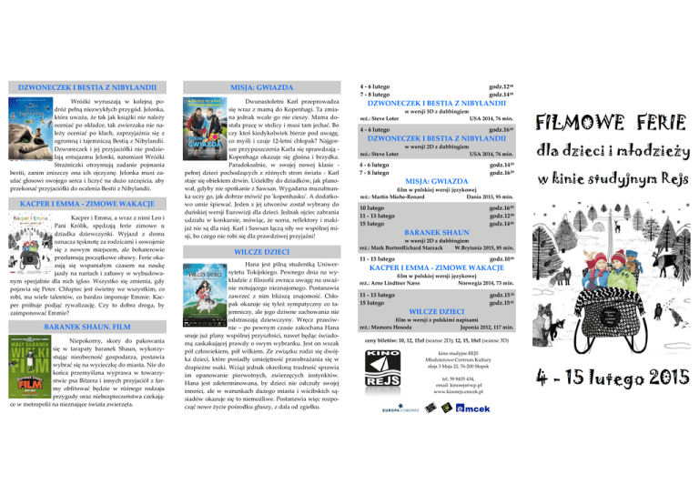 DZWONECZEK I BESTIA Z NIBYLANDII MISJA: GWIAZDA Wróżki wyruszają w kolejną podróż pełną niezwykłych przygód. Jelonka, która uważa, że tak jak książki nie należy oceniać po okładce, tak zwierzaka nie należy oceniać po kłach, zaprzyjaźnia się z ogromną i tajemniczą Bestią z Nibylandii. Dzwoneczek i jej przyjaciółki nie podzielają entujazmu Jelonki, natomiast Wróżki Strażniczki otrzymują zadanie pojmania bestii, zanim zniszczy ona ich ojczyznę. Jelonka musi zaufać głosowi swojego serca i liczyć na dużo szczęścia, aby przekonać przyjaciółki do ocalenia Bestii z Nibylandii. Dwunastoletni Karl przeprowadza się wraz z mamą do Kopenhagi. Ta zmiana jednak wcale go nie cieszy. Mama dostała pracę w stolicy i musi tam jechać. Bo czy ktoś kiedykolwiek bierze pod uwagę, co myśli i czuje 12-letni chłopak? Najgorsze przypuszczenia Karla się sprawdzają Kopenhaga okazuje się głośna i brzydka. Paradoksalnie, w swojej nowej klasie pełnej dzieci pochodzących z różnych stron świata - Karl staje się obiektem drwin. Uciekłby do dziadków, jak planował, gdyby nie spotkanie z Sawsan. Wygadana muzułmanka uczy go, jak dobrze mówić po 'kopenhasku'. A dodatkowo umie śpiewać. Jeden z jej utworów został wybrany do duńskiej wersji Eurowizji dla dzieci. Jednak ojciec zabrania udziału w konkursie, mówiąc, że scena, reflektory i makijaż nie są dla niej. Karl i Sawsan łączą siły we wspólnej misji, bo czego nie robi się dla prawdziwej przyjaźni! KACPER I EMMA - ZIMOWE WAKACJE Kacper i Emma, a wraz z nimi Leo i Pani Królik, spędzają ferie zimowe u dziadka dziewczynki. Wyjazd z domu oznacza tęsknotę za rodzicami i oswojenie się z nowym miejscem, ale bohaterowie przełamują początkowe obawy. Ferie okazują się wspaniałym czasem na naukę jazdy na nartach i zabawy w wybudowanym specjalnie dla nich igloo. Wszystko się zmienia, gdy pojawia się Peter. Chłopiec jest świetny we wszystkim, co robi, ma wiele talentów, co bardzo imponuje Emmie. Kacper próbuje podjąć rywalizację. Czy to dobra droga, by zaimponować Emmie? BARANEK SHAUN. FILM Niepokorny, skory do pakowania się w tarapaty baranek Shaun, wykorzystując nieobecność gospodarza, postawia wybrać się na wycieczkę do miasta. Nie do końca przemyślana wyprawa w towarzystwie psa Bitzera i innych przyjaciół z farmy obfitować będzie w różnego rodzaju przygody oraz niebezpieczeństwa czekające w metropolii na nieznające świata zwierzęta. WILCZE DZIECI Hana jest pilną studentką Uniwersytetu Tokijskiego. Pewnego dnia na wykładzie z filozofii zwraca uwagę na uważnie notującego nieznajomego. Postanawia zawrzeć z nim bliższą znajomość. Chłopak okazuje się tyleż sympatyczny co tajemniczy, ale jego dziwne zachowania nie odstraszają dziewczyny. Wręcz przeciwnie – po pewnym czasie zakochana Hana snuje już plany wspólnej przyszłości, nawet będąc świadomą zaskakującej prawdy o swym wybranku. Jest on wszak pół człowiekiem, pół wilkiem. Ze związku rodzi się dwójka dzieci, które posiadły umiejętność przeobrażania się w drapieżne ssaki. Wciąż jednak określoną trudność sprawia im opanowanie pierwotnych, zwierzęcych instynktów. Hana jest zdeterminowana, by dzieci nie odczuły swojej inności, ale w warunkach dużego miasta i wścibskich sąsiadów okazuje się to niemożliwe. Postanawia więc rozpocząć nowe życie pośrodku głuszy, z dala od zgiełku. 4 - 6 lutego 7 - 8 lutego godz.12 00 godz.14 00 DZWONECZEK I BESTIA Z NIBYLANDII w wersji 3D z dubbingiem reż.: Steve Loter USA 2014, 76 min. 4 - 6 lutego godz.16 00 DZWONECZEK I BESTIA Z NIBYLANDII w wersji 2D z dubbingiem reż.: Steve Loter USA 2014, 76 min. 4 - 6 lutego 7 - 8 lutego godz.14 00 godz.16 00 MISJA: GWIAZDA film w polskiej wersji językowej reż.: Martin Miehe-Renard Dania 2013, 95 min. 10 lutego 11 - 13 lutego 15 lutego godz.16 00 godz.12 00 godz.14 00 BARANEK SHAUN w wersji 2D z dubbingiem reż.: Mark BurtonRichard Starzack W.Brytania 2015, 85 min. 11 - 13 lutego godz.10 00 KACPER I EMMA - ZIMOWE WAKACJE film w polskiej wersji językowej reż.: Arne Lindtner Næss Norwegia 2014, 73 min. 11 - 13 lutego 15 lutego godz.15 30 godz.15 45 WILCZE DZIECI film w wersji z polskimi napisami reż.: Mamoru Hosoda Japonia 2012, 117 min. ceny biletów: 10, 12, 15zł (seanse 2D); 12, 15, 18zł (seanse 3D) kino studyjne REJS Młodzieżowe Centrum Kultury aleja 3 Maja 22, 76-200 Słupsk tel. 59 8435 434, email: [email protected] www.kinorejs.emcek.pl