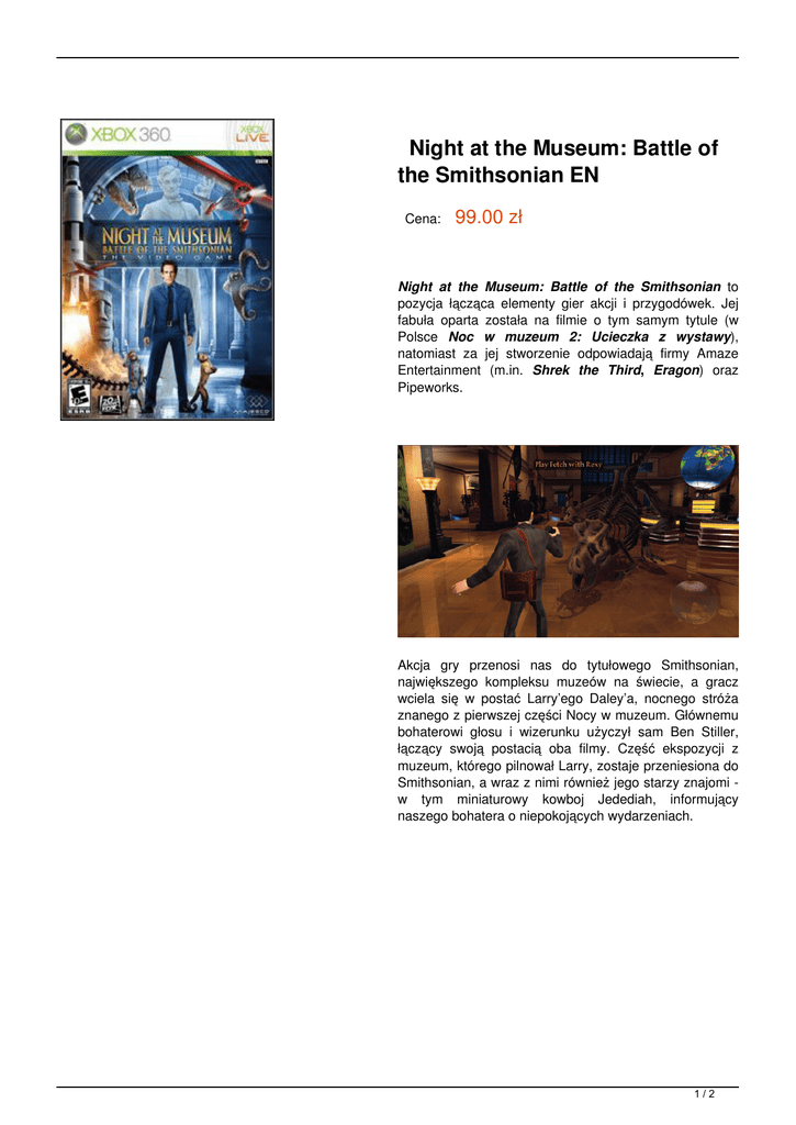 Night at the Museum: Battle of the Smithsonian EN Cena: 99.00 zł Night at the Museum: Battle of the Smithsonian to pozycja łącząca elementy gier akcji i przygodówek. Jej fabuła oparta została na filmie o tym samym tytule (w Polsce Noc w muzeum 2: Ucieczka z wystawy), natomiast za jej stworzenie odpowiadają firmy Amaze Entertainment (m.in. Shrek the Third, Eragon) oraz Pipeworks. Akcja gry przenosi nas do tytułowego Smithsonian, największego kompleksu muzeów na świecie, a gracz wciela się w postać Larry’ego Daley’a, nocnego stróża znanego z pierwszej części Nocy w muzeum. Głównemu bohaterowi głosu i wizerunku użyczył sam Ben Stiller, łączący swoją postacią oba filmy. Część ekspozycji z muzeum, którego pilnował Larry, zostaje przeniesiona do Smithsonian, a wraz z nimi również jego starzy znajomi w tym miniaturowy kowboj Jedediah, informujący naszego bohatera o niepokojących wydarzeniach. 1/2 Okazuje się, że egipski władca Kahmunrah wraz z trzema potężnymi pomocnikami (Ivan Groźny, Napoleon i Al Capone) chce zawładnąć najpierw kompleksem muzeów, a później całym światem. Celem gracza jest więc przywrócenie porządku i uratowanie kowboja oraz jego przyjaciół. Zobacz wideo: 2/2 Powered by TCPDF (www.tcpdf.org)