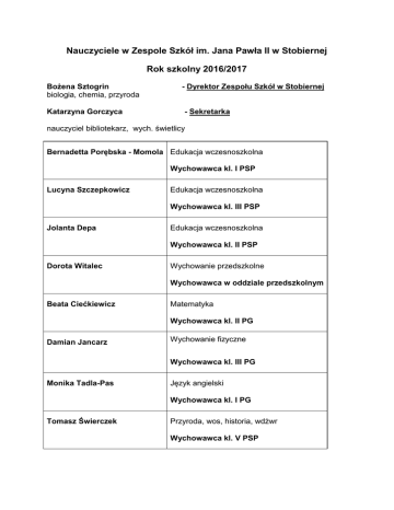 Nauczyciele w Zespole Szkół im. Jana Pawła II w Stobiernej Rok szkolny 2016/2017 Bożena Sztogrin biologia, chemia, przyroda Katarzyna Gorczyca - Dyrektor Zespołu Szkół w Stobiernej - Sekretarka nauczyciel bibliotekarz, wych. świetlicy Bernadetta Porębska - Momola Edukacja wczesnoszkolna Wychowawca kl. I PSP Lucyna Szczepkowicz Edukacja wczesnoszkolna Wychowawca kl. III PSP Jolanta Depa Edukacja wczesnoszkolna Wychowawca kl. II PSP Dorota Witalec Wychowanie przedszkolne Wychowawca w oddziale przedszkolnym Beata Ciećkiewicz Matematyka Wychowawca kl. II PG Damian Jancarz Wychowanie fizyczne Wychowawca kl. III PG Monika Tadla-Pas Język angielski Wychowawca kl. I PG Tomasz wierczek Przyroda, wos, historia, wdżwr Wychowawca kl. V PSP Anna Pondo Przyroda, geografia Wychowawca kl. VI PSP Ewa Strózik Język polski, logopeda Wychowawca kl. IV PSP Ks. Józef Książek Religia Ks. Piotr Paciorek Religia Bożena Wolano Język polski Elżbieta Iwan Zajęcia artystyczne, plastyka Anna Kędzior Matematyka, fizyka Marcin Nykiel Muzyka Maria Wilk Religia Sebastian Pluta Fizyka, zajęcia komputerowe, informatyka Alicja Jasińska Biologia Aneta Lipior Edukacja do bezpieczeństwa Agnieszka Matłok Język niemiecki Danuta Zborowska Zajęcia techniczne Katarzyna Bobulska Język angielski Jolanta Pa ko Pedagog szkolny