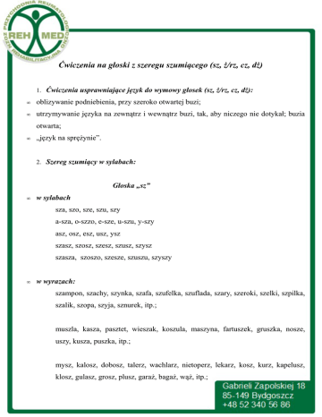 Ćwiczenia na głoski z szeregu szumiącego (sz, ż/rz, cz, dż) 1. Ćwiczenia usprawniające język do wymowy głosek (sz, ż/rz, cz, dż): • oblizywanie podniebienia, przy szeroko otwartej buzi; • utrzymywanie języka na zewnątrz i wewnątrz buzi, tak, aby niczego nie dotykał; buzia otwarta; • „język na sprężynie”. 2. Szereg szumiący w sylabach: Głoska „sz” • w sylabach sza, szo, sze, szu, szy a-sza, o-szzo, e-sze, u-szu, y-szy asz, osz, esz, usz, ysz szasz, szosz, szesz, szusz, szysz szasza, szoszo, szesze, szuszu, szyszy • w wyrazach: szampon, szachy, szynka, szafa, szufelka, szuflada, szary, szeroki, szelki, szpilka, szalik, szopa, szyja, sznurek, itp.; muszla, kasza, pasztet, wieszak, koszula, maszyna, fartuszek, gruszka, nosze, uszy, kusza, puszka, itp.; mysz, kalosz, dobosz, talerz, wachlarz, nietoperz, lekarz, kosz, kurz, kapelusz, klosz, gulasz, grosz, plusz, garaż, bagaż, wąż, itp.; • w wierszach: „Szajka myszy” Szajka myszy na paluszkach, Szuka groszku po garnuszkach. W szafie kaszę pałaszuje, I okruszków poszukuje! Szymek przerwał myszkowanie, Poszedł, kupił kota na nie. głoska „ ż/rz” • w sylabach: ża, żo, że, żu, ży a-ża, o-żo, e-że, u-żu, y-ży żaża, żożo, żeże, żużu, żyży żasz, żosz, żesz, żusz, żysz • w wyrazach: żaba, rzeka, żubr, żebra, żakiet, żarówka, żuk, żyrafa, żona, żuraw, żyła, żyto, żonkil, żółty, żyrandol, żurnal, rzemień, rząd, itp; korzenie, waży, wieża, warzywa, orzech, jarzyny, parzy, morze, wierzy, duży, boży, róże, różowe, jarzębina, itp.; • w wierszach: „Podróże żółwia żeglarza” Żółw – podróżnik żywo wierzy, Że żaglówką świat przemierzy. Różne plaże, rzeki mija. Duże morza żółw podbija. Żywa jednak to opinia, Że podróżnik wyolbrzymia. I te żółwie „morza duże” To nie morza, a kałuże. głoska „cz” • w sylabach: cza, czo, cze, czu, czy a-cza, o-czo, e-cze, u-czu, y-czy acz, ocz, ecz, ucz, ycz czacz, czocz, czecz, czucz, czycz czacza, czoczo, czecze, czuczu, czyczy w wyrazach: • czapka, czajnik, czubek, czekolada, czepek, czapla, czarny, czerwony, czołg, czółno, czek, czary, itp.; maczuga, pieczątka, pieczarka, boczek, haczyk, pączek, kaczka, beczka, taczka, wieczór, kurczak, koniczyna, tęcza, oczy, itp.; poręcz, palacz, trębacz, mecz, puchacz, włamywacz, królewicz, warkocz, klacz, klucz, mlecz, miecz, itp.; o w wierszach: „Leczo” „Kaczki” Cztery marchwie w kawałeczkach, Poczłapały cztery kaczki mąka, wody pół kubeczka. na pocztę we czwartek. Dwie papryczki i kabaczek; Miały wysłać paczkę Pieczeń pokrój w drobny maczek, i pocztową kartę. Deczko czili, keczup damy Paczki kaczki już wysłały, I na ucztę zapraszamy! Po czym usiadły I zaczęły coś czytać. głoska „dż” • w sylabach: dża, dżo, dże, dżu, dży a-dża, o-dżo, e-dże, u-dżu, y-dży dżadża, dżodżo, dżedże, dżudżu, dżydży dżacz, dżocz, dżecz, dżucz, dżycz • w wyrazac: dżungla, dżokej, dżentelmen, dżoker, dżuma, dżem, dżdżownica, dżdżysty, itp.; brydżysta, zadżumiony, wyjeż-dża, przyjeż-dża, itp.; • w wierszach: „Gramy w brydża” Pod Dżakartą - piękny, nowy, elitarny klub brydżowy. Ja, gdy wolne tylko mam, chętnie w brydża grywam tam. Król i radża w brydża grają jak dżem grę tę uwielbiają! I dżentelmen brydża lubi. Kiedy gra, dżokery gubi. Dżokej talię wydobywa... W brydża w piątkę nikt nie grywa!