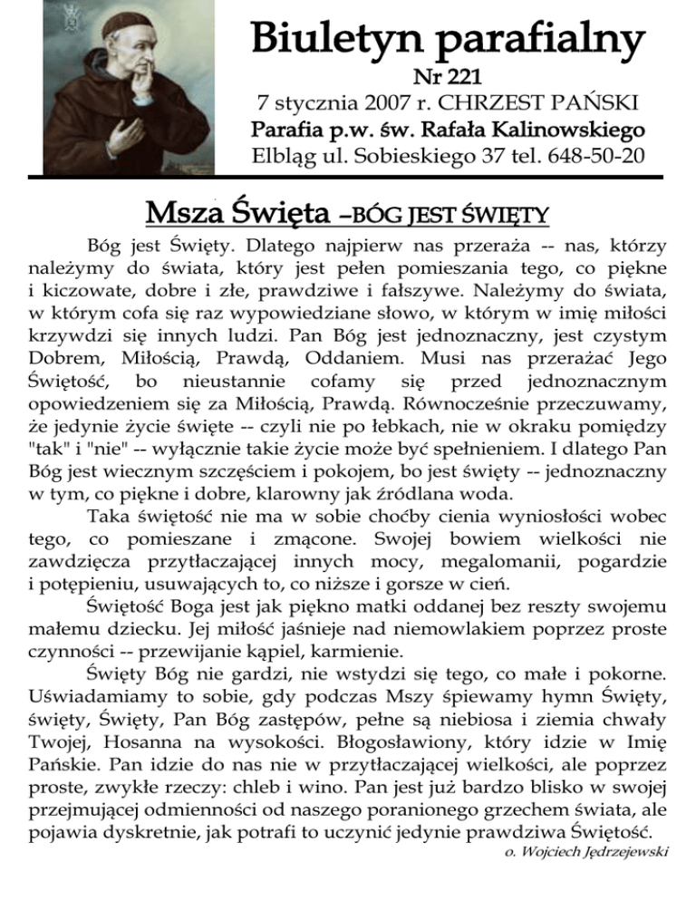 Biuletyn parafialny Nr 221 7 stycznia 2007 r. CHRZEST PAŃSKI Parafia p.w. św. Rafała Kalinowskiego Elbląg ul. Sobieskiego 37 tel. 648-50-20 Msza Święta –BÓG JEST ŚWIĘTY Bóg jest Święty. Dlatego najpierw nas przeraża -- nas, którzy należymy do świata, który jest pełen pomieszania tego, co piękne i kiczowate, dobre i złe, prawdziwe i fałszywe. Należymy do świata, w którym cofa się raz wypowiedziane słowo, w którym w imię miłości krzywdzi się innych ludzi. Pan Bóg jest jednoznaczny, jest czystym Dobrem, Miłością, Prawdą, Oddaniem. Musi nas przerażać Jego Świętość, bo nieustannie cofamy się przed jednoznacznym opowiedzeniem się za Miłością, Prawdą. Równocześnie przeczuwamy, że jedynie życie święte -- czyli nie po łebkach, nie w okraku pomiędzy "tak" i "nie" -- wyłącznie takie życie może być spełnieniem. I dlatego Pan Bóg jest wiecznym szczęściem i pokojem, bo jest święty -- jednoznaczny w tym, co piękne i dobre, klarowny jak źródlana woda. Taka świętość nie ma w sobie choćby cienia wyniosłości wobec tego, co pomieszane i zmącone. Swojej bowiem wielkości nie zawdzięcza przytłaczającej innych mocy, megalomanii, pogardzie i potępieniu, usuwających to, co niższe i gorsze w cień. Świętość Boga jest jak piękno matki oddanej bez reszty swojemu małemu dziecku. Jej miłość jaśnieje nad niemowlakiem poprzez proste czynności -- przewijanie kąpiel, karmienie. Święty Bóg nie gardzi, nie wstydzi się tego, co małe i pokorne. Uświadamiamy to sobie, gdy podczas Mszy śpiewamy hymn Święty, święty, Święty, Pan Bóg zastępów, pełne są niebiosa i ziemia chwały Twojej, Hosanna na wysokości. Błogosławiony, który idzie w Imię Pańskie. Pan idzie do nas nie w przytłaczającej wielkości, ale poprzez proste, zwykłe rzeczy: chleb i wino. Pan jest już bardzo blisko w swojej przejmującej odmienności od naszego poranionego grzechem świata, ale pojawia dyskretnie, jak potrafi to uczynić jedynie prawdziwa Świętość. o. Wojciech Jędrzejewski Ogłoszenia Parafialne 1. 2. 3. 4. 5. 6. 7. 8. 9. 10. Niedziela Chrztu Pańskiego kończy okres Bożego Narodzenia a rozpoczyna Okres Zwykły. Trwając w tradycji jeszcze do 2 lutego śpiewamy kolędy. Trwa wizyta duszpasterska w parafii. Dziękujemy tym, którzy składają przy tej okazji ofiary na budowę naszego kościoła. Bóg zapłać również za dzisiejsze ofiary przeznaczone na ten cel. Osoby pragnące stać się stałymi czytelnikami „Gościa Niedzielnego” – prosimy o dokonanie w zakrystii prenumeraty miesięcznej. Zapraszamy! Za tydzień Msza św. o godz. 15.00 dla rodziców dzieci przygotowujących się do I Komunii Świętej. Obecność obowiązkowa. W sprawach kancelaryjnych prosimy zgłaszać się w sobotę od godz. 10.30 do 12.00. Ewentualnie w sprawach pilnych w niedziele po Mszach św. Możliwość skorzystania z sakramentu spowiedzi w trakcie wizyty duszpasterskiej jest znacznie ograniczona. Dlatego zachęcamy do spowiedzi 15 min przed poranną Mszą św. Przypominamy kandydatom do sakramentu bierzmowania o spotkaniach w tym tygodniu według następującego porządku: poniedziałek grupa A godz. 16.00 grupa B godz. 17.00 wtorek grupa C godz. 16.00 grupa D godz. 17.00 Przed kaplicą możliwość nabycie prasy katolickiej „L’Osservattore Romano”, „Nasza Droga” oraz kalendarz na 2007 r. W tradycji przyjęte jest to, że podczas kolędy ministranci i lektorzy otrzymują ofiary, jako wyraz wdzięczności za posługę przy Ołtarzy Pańskim. W trakcie tegorocznej kolędy ofiary przez Was złożone, przeznaczone są na letni wyjazd w góry. Za okazane dobro składamy BÓG ZAPŁAĆ. Za tydzień przed kaplicą zbierane będą ofiary do puszki na potrzeby Wyższego Seminarium Duchownego w Elblągu. Numer Konta Parafialnego PKO BP 72 1020 1752 0000 0102 0069 6047 7 stycznia 2007r. NIEDZIELA CHRZEST PAŃSKI Łk 3, 15-16. 21-22 Śp. Zuzanna NOWAK w 7 r. śm. Śp. Czesława, Józef GIBAS Śp. Urszula i Jerzy ZASKALSCY (7 greg.) Z okazji 10 urodzin Jakuba z prośbą o zdrowie, opiekę, Boże błogosławieństwo 10.30 i potrzebne łaski w dojrzewaniu. 12.00 ZA PARAFIAN O potrzebne łaski dla Klubu Seniora przy Domu Kultury „Nad Jarem” oraz o Boże 15.00 błogosławieństwo na każdy dzień dla wszystkich seniorów. Śp. Zofia, Katarzyna, Józef KOZACZUK 18.00 Śp. Jan, Jadwiga, Ryszard WYSOCCY oraz Franciszek DOMALEWSKI 8 stycznia PONIEDZIAŁEK Mk 1,14-20 8.00 8.00 Śp. Urszula i Jerzy ZASKALSCY (8 greg.) 18.00 Śp. Eugenia SULEWSKA w 30 dzień po pogrzebie 9 stycznia WTOREK Mk 1, 21-28 8.00 8.00 Śp. Urszula i Jerzy ZASKALSCY (9 greg.) 18.00 Śp. Marian RZEŹNIKIEWICZ w 7 miesiąc po śm. 7.00 9.00 9.00 10 stycznia ŚRODA Mk 1, 29-39 8.00 8.00 Śp. Urszula i Jerzy ZASKALSCY (10 greg.) 18.00 W INTENCJI CZCICIELI MATKI BOŻEJ NIEUSTAJĄCEJ POMOCY 11 stycznia CZWARTEK Mk 1, 40-45 8.00 8.00 Śp. Urszula i Jerzy ZASKALSCY (11 greg.) 18.00 Śp. Tadeusz CZARNECKI w 17 r. śm. 12 stycznia PIĄTEK Mk 2, 1-12 8.00 8.00 Śp. Urszula i Jerzy ZASKALSCY (12 greg.) 18.00 Śp. Bogdan KUCHAREK w 30 dzień po pogrzebie 13 stycznia SOBOTA Mk 2,13-17 8.00 8.00 Śp. Urszula i Jerzy ZASKALSCY (13 greg.) Śp. Jerzy RUTKOWSKI w 14 r. śm. 18.00 Śp. Zofia BYZDRA w 1 r. śm. 14 stycznia II NIEDZIELA ZWYKŁA J 2, 1-12 7.00 Śp. Urszula i Jerzy ZASKALSCY (14 greg.) 9.00 Śp. Mieczysław ĆWIKLIŃSKI w 30 dzień po pogrzebie 10.30 Śp. Józef BUDKA w 4 miesiąc po śmierci 12.00 ZA PARAFIAN 15.00 Śp. Grażyna STANEK w 3 r. śm. oraz rodzice Stefania i Teodor 18.00 Śp. Piotr KARŻEWICZ w 4 r. śm. PROGRAM WIZYTY DUSZPASTERSKIEJ Poniedziałek 08.01. 2007r. od 16.00 Ul. Leszczyńskiego 22, 23, 24, 25 Ul. Leszczyńskiego 26, 27, 28, 29 Wtorek 09.01. 2007r. od 16.00 Ul. Leszczyńskiego 30, 31, Ul. Sobieskiego 2A, 2B domki 21, 23, 25 Środa 10.01. 2007r. od 16.00 Ul. Sobieskiego 2, 4, 6 Ul. Sobieskiego 8, 10, 12, 14 Czwartek 11.01. 2007r. od 16.00 Ul. Sobieskiego 1