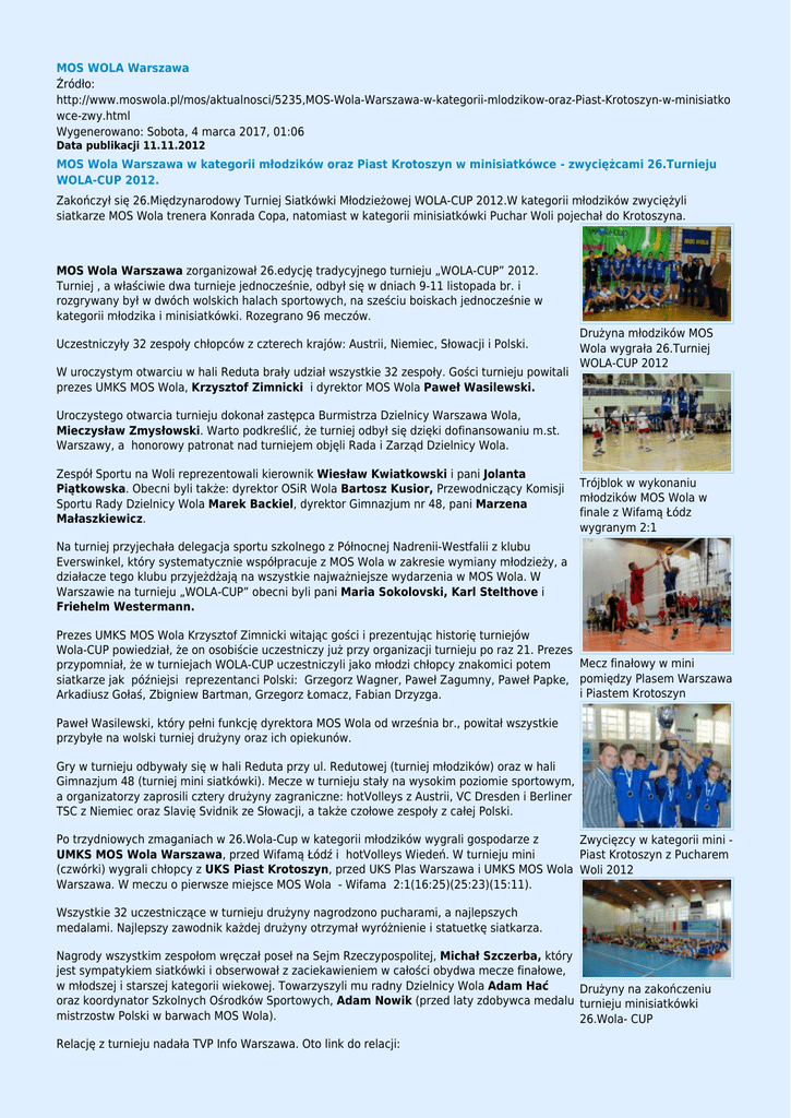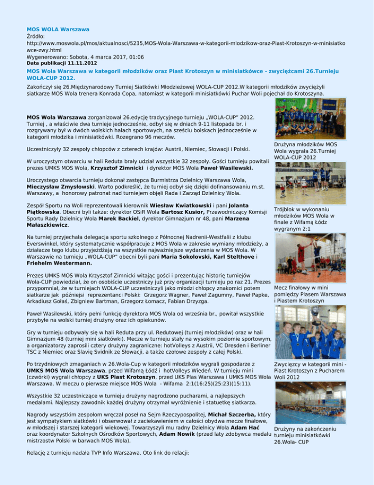MOS WOLA Warszawa Źródło: http://www.moswola.pl/mos/aktualnosci/5235,MOS-Wola-Warszawa-w-kategorii-mlodzikow-oraz-Piast-Krotoszyn-w-minisiatko wce-zwy.html Wygenerowano: Sobota, 4 marca 2017, 01:06 Data publikacji 11.11.2012 MOS Wola Warszawa w kategorii młodzików oraz Piast Krotoszyn w minisiatkówce - zwyciężcami 26.Turnieju WOLA-CUP 2012. Zakończył się 26.Międzynarodowy Turniej Siatkówki Młodzieżowej WOLA-CUP 2012.W kategorii młodzików zwyciężyli siatkarze MOS Wola trenera Konrada Copa, natomiast w kategorii minisiatkówki Puchar Woli pojechał do Krotoszyna. MOS Wola Warszawa zorganizował 26.edycję tradycyjnego turnieju „WOLA-CUP” 2012. Turniej , a właściwie dwa turnieje jednocześnie, odbył się w dniach 9-11 listopada br. i rozgrywany był w dwóch wolskich halach sportowych, na sześciu boiskach jednocześnie w kategorii młodzika i minisiatkówki. Rozegrano 96 meczów. Uczestniczyły 32 zespoły chłopców z czterech krajów: Austrii, Niemiec, Słowacji i Polski. W uroczystym otwarciu w hali Reduta brały udział wszystkie 32 zespoły. Gości turnieju powitali prezes UMKS MOS Wola, Krzysztof Zimnicki i dyrektor MOS Wola Paweł Wasilewski. Drużyna młodzików MOS Wola wygrała 26.Turniej WOLA-CUP 2012 Uroczystego otwarcia turnieju dokonał zastępca Burmistrza Dzielnicy Warszawa Wola, Mieczysław Zmysłowski. Warto podkreślić, że turniej odbył się dzięki dofinansowaniu m.st. Warszawy, a honorowy patronat nad turniejem objęli Rada i Zarząd Dzielnicy Wola. Zespół Sportu na Woli reprezentowali kierownik Wiesław Kwiatkowski i pani Jolanta Piątkowska. Obecni byli także: dyrektor OSiR Wola Bartosz Kusior, Przewodniczący Komisji Sportu Rady Dzielnicy Wola Marek Backiel, dyrektor Gimnazjum nr 48, pani Marzena Małaszkiewicz. Trójblok w wykonaniu młodzików MOS Wola w finale z Wifamą Łódz wygranym 2:1 Na turniej przyjechała delegacja sportu szkolnego z Północnej Nadrenii-Westfalii z klubu Everswinkel, który systematycznie współpracuje z MOS Wola w zakresie wymiany młodzieży, a działacze tego klubu przyjeżdżają na wszystkie najważniejsze wydarzenia w MOS Wola. W Warszawie na turnieju „WOLA-CUP” obecni byli pani Maria Sokolovski, Karl Stelthove i Friehelm Westermann. Prezes UMKS MOS Wola Krzysztof Zimnicki witając gości i prezentując historię turniejów Wola-CUP powiedział, że on osobiście uczestniczy już przy organizacji turnieju po raz 21. Prezes Mecz finałowy w mini przypomniał, że w turniejach WOLA-CUP uczestniczyli jako młodzi chłopcy znakomici potem siatkarze jak późniejsi reprezentanci Polski: Grzegorz Wagner, Paweł Zagumny, Paweł Papke, pomiędzy Plasem Warszawa i Piastem Krotoszyn Arkadiusz Gołaś, Zbigniew Bartman, Grzegorz Łomacz, Fabian Drzyzga. Paweł Wasilewski, który pełni funkcję dyrektora MOS Wola od września br., powitał wszystkie przybyłe na wolski turniej drużyny oraz ich opiekunów. Gry w turnieju odbywały się w hali Reduta przy ul. Redutowej (turniej młodzików) oraz w hali Gimnazjum 48 (turniej mini siatkówki). Mecze w turnieju stały na wysokim poziomie sportowym, a organizatorzy zaprosili cztery drużyny zagraniczne: hotVolleys z Austrii, VC Dresden i Berliner TSC z Niemiec oraz Slavię Svidnik ze Słowacji, a także czołowe zespoły z całej Polski. Po trzydniowych zmaganiach w 26.Wola-Cup w kategorii młodzików wygrali gospodarze z Zwycięzcy w kategorii mini UMKS MOS Wola Warszawa, przed Wifamą Łódź i hotVolleys Wiedeń. W turnieju mini Piast Krotoszyn z Pucharem (czwórki) wygrali chłopcy z UKS Piast Krotoszyn, przed UKS Plas Warszawa i UMKS MOS Wola Woli 2012 Warszawa. W meczu o pierwsze miejsce MOS Wola - Wifama 2:1(16:25)(25:23)(15:11). Wszystkie 32 uczestniczące w turnieju drużyny nagrodzono pucharami, a najlepszych medalami. Najlepszy zawodnik każdej drużyny otrzymał wyróżnienie i statuetkę siatkarza. Nagrody wszystkim zespołom wręczał poseł na Sejm Rzeczypospolitej, Michał Szczerba, który jest sympatykiem siatkówki i obserwował z zaciekawieniem w całości obydwa mecze finałowe, w młodszej i starszej kategorii wiekowej. Towarzyszyli mu radny Dzielnicy Wola Adam Hać Drużyny na zakończeniu oraz koordynator Szkolnych Ośrodków Sportowych, Adam Nowik (przed laty zdobywca medalu turnieju minisiatkówki mistrzostw Polski w barwach MOS Wola). 26.Wola- CUP Relację z turnieju nadała TVP Info Warszawa. Oto link do relacji: http://www.tvp.pl/warszawa/informacyjne/wiadomosci-sportowe/wideo/ 09112012-2200/9055004 O wrażenia i ocenę turnieju poprosiliśmy bezpośrednich organizatorów. Dyrektor MOS Wola Paweł Wasilewski powiedział: Mecz finałowy w kategorii młodzików MOS Wola To był bardzo udany, zarówno organizacyjnie, jak i sportowo turniej. Graliśmy w Warszawa - Wifama Łódź dwóch halach niezależne zawody, z udziałem ponad 300 zawodników w dwóch kategoriach 2:1 wiekowych. W przedsięwzięcie zaangażowanych było wiele osób: trenerów, rodziców oraz wolontariuszy. Dzięki temu udało się bezpiecznie przeprowadzić 26. edycję Wola Cup, bez większych problemów. Szczególne podziękowania należą się rodzicom naszych chłopców, którzy wspierali nas w sprawach organizacyjnych oraz przez wiele godzin każdego dnia turnieju Turniej dofinansowany pomagali w obydwu halach sportowych, przy Redutowej i Deotymy. przez m.st.Warszawę Ze względów ekonomicznych zdecydowaliśmy się zorganizować jeden turniej, ale dla dwóch kategorii wiekowych. Dzięki dofinansowaniu przez m.st. Warszawę, wsparciu władz dzielnicy i objęciu patronatem honorowym przez Radę i Zarząd Dzielnicy udało się zrealizować to przedsięwzięcie. Bardzo udanie wypadła inauguracja turnieju w OSIR Reduta. 3- sektorowa, profesjonalnie przygotowana hala świetnie spełniła swe zadanie, dzięki czemu sprawnie udało się przeprowadzić rozgrywki w kat. „młodzik”. Wspaniałą atmosferę stworzyła licznie zgromadzona publiczność, która głośnym do