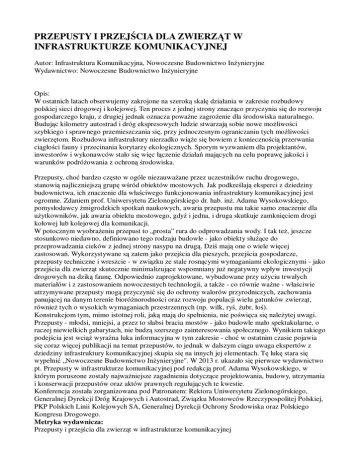 PRZEPUSTY I PRZEJŚCIA DLA ZWIERZĄT W INFRASTRUKTURZE KOMUNIKACYJNEJ Autor: Infrastruktura Komunikacyjna, Nowoczesne Budownictwo Inżynieryjne Wydawnictwo: Nowoczesne Budownictwo Inżynieryjne Opis: W ostatnich latach obserwujemy zakrojone na szeroką skalę działania w zakresie rozbudowy polskiej sieci drogowej i kolejowej. Ten proces z jednej strony znacząco przyczynia się do rozwoju gospodarczego kraju, z drugiej jednak oznacza poważne zagrożenie dla środowiska naturalnego. Budując kilometry autostrad i dróg ekspresowych ludzie stwarzają sobie nowe możliwości szybkiego i sprawnego przemieszczania się, przy jednoczesnym ograniczaniu tych możliwości zwierzętom. Rozbudowa infrastruktury nierzadko wiąże się bowiem z koniecznością przerwania ciągłości fauny i przecinania korytarzy ekologicznych. Sporym wyzwaniem dla projektantów, inwestorów i wykonawców stało się więc łączenie działań mających na celu poprawę jakości i warunków podróżowania z ochroną środowiska. Przepusty, choć bardzo często w ogóle niezauważane przez uczestników ruchu drogowego, stanowią najliczniejszą grupę wśród obiektów mostowych. Jak podkreślają eksperci z dziedziny budownictwa, ich znaczenie dla właściwego funkcjonowania infrastruktury komunikacyjnej jest ogromne. Zdaniem prof. Uniwersytetu Zielonogórskiego dr. hab. inż. Adama Wysokowskiego, pomysłodawcy żmigrodzkich spotkań naukowych, awaria przepustu ma takie samo znaczenie dla użytkowników, jak awaria obiektu mostowego, gdyż i jedna, i druga skutkuje zamknięciem drogi kołowej lub kolejowej dla komunikacji. W potocznym wyobrażeniu przepust to „prosta” rura do odprowadzania wody. I tak też, jeszcze stosunkowo niedawno, definiowano tego rodzaju budowle - jako obiekty służące do przeprowadzania cieków z jednej strony nasypu na drugą. Dziś mają one o wiele więcej zastosowań. Wykorzystywane są zatem jako przejścia dla pieszych, przejścia gospodarcze, przepusty techniczne i wreszcie - w związku ze stale rosnącymi wymaganiami ekologicznymi - jako przejścia dla zwierząt skutecznie minimalizujące wspomniany już negatywny wpływ inwestycji drogowych na dziką faunę. Odpowiednio zaprojektowane, wybudowane przy użyciu trwałych materiałów i z zastosowaniem nowoczesnych technologii, a także - co równie ważne - właściwie utrzymywane przepusty mogą przyczynić się do ochrony walorów przyrodniczych, zachowania panującej na danym terenie bioróżnorodności oraz rozwoju populacji wielu gatunków zwierząt, również tych o wysokich wymaganiach przestrzennych (np. wilk, ryś, żubr, łoś). Konstrukcjom tym, mimo istotnej roli, jaką mają do spełnienia, nie poświęca się należytej uwagi. Przepusty - młodsi, mniejsi, a przez to słabsi bracia mostów - jako budowle mało spektakularne, o raczej niewielkich gabarytach, nie budzą szerszego zainteresowania społecznego. Wynikiem takiego podejścia jest wciąż wyraźna luka informacyjna w tym zakresie - choć w ostatnim czasie pojawia się coraz więcej publikacji na temat przepustów, to jednak w dalszym ciągu uwaga ekspertów z dziedziny infrastruktury komunikacyjnej skupia się na innych jej elementach. Tę lukę stara się wypełnić „Nowoczesne Budownictwo Inżynieryjne". W 2013 r. ukazało się pierwsze wydawnictwo pt. Przepusty w infrastrukturze komunikacyjnej pod redakcją prof. Adama Wysokowskiego, w którym poruszone zostały najważniejsze zagadnienia dotyczące projektowania, budowy, utrzymania i konserwacji przepustów oraz aktów prawnych regulujących te kwestie. Konferencja została zorganizowana pod Patronatem: Rektora Uniwersytetu Zielonogórskiego, Generalnej Dyrekcji Dróg Krajowych i Autostrad, Związku Mostowców Rzeczypospolitej Polskiej, PKP Polskich Linii Kolejowych SA, Generalnej Dyrekcji Ochrony Środowiska oraz Polskiego Kongresu Drogowego. Metryka wydawnicza: Przepusty i przejścia dla zwierząt w infrastrukturze komunikacyjnej Wydanie: pierwsze Miejsce i data wydania: Kraków 2013 Wydawca: Nowoczesne Budownictwo Inżynieryjne Oprawa miękka, s. 256 ISBN 978-83-938649-0-4 Sprzedaż: tel. 12 292 70 70 e-mail: [email protected]
