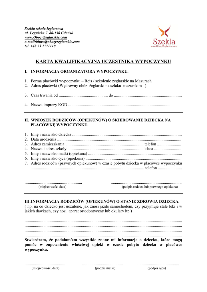 Szekla szkoła żeglarstwa ul. Legnicka 7 80-150 Gdańsk www.ObozyZeglarskie.com e-mail:[email protected] tel. +48 53 1771110 KARTA KWALIFIKACYJNA UCZESTNIKA WYPOCZYNKU I. INFORMACJA ORGANIZATORA WYPOCZYNKU. 1. Forma placówki wypoczynku – Rejs / szkolenie żeglarskie na Mazurach 2. Adres placówki (Wędrowny obóz żeglarski na szlaku mazurskim ) 3. Czas trwania od ............................................... do ................................................................. 4. Nazwa imprezy KOD ................................................................................................... II. WNIOSEK RODZICÓW (OPIEKUNÓW) O SKIEROWANIE DZIECKA NA PLACÓWKĘ WYPOCZYNKU. 1. 2. 3. 4. 5. 6. 7. Imię i nazwisko dziecka ......................................................................................................... Data urodzenia ....................................................................................................................... Adres zamieszkania ........................................................................... telefon ....................... Nazwa i adres szkoły ......................................................................... klasa .......................... Imię i nazwisko matki (opiekuna) .......................................................................................... Imię i nazwisko ojca (opiekuna) ............................................................................................ Adres rodziców (prawnych opiekunów) w czasie pobytu dziecka w placówce wypoczynku ............................................................................................................. telefon ....................... ....................................................... .................................................................... (miejscowość, data) (podpis rodzica lub prawnego opiekuna) III. INFORMACJA RODZICÓW (OPIEKUNÓW) O STANIE ZDROWIA DZIECKA. ( np. na co dziecko jest uczulone, jak znosi jazdę samochodem, czy przyjmuje stale leki i w jakich dawkach, czy nosi aparat ortodontyczny lub okulary itp.) ....................................................................................................................................................... ....................................................................................................................................................... ....................................................................................................................................................... ....................................................................................................................................................... Stwierdzam, że podałam/em wszystkie znane mi informacje o dziecku, które mogą pomóc w zapewnieniu właściwej opieki w czasie pobytu dziecka w placówce wypoczynku. ....................................... (miejscowość, data) ....................................... (podpis matki) ........................................ (podpis ojca) IV. ORZECZENIE LEKARSKIE. 1. Po zbadaniu dziecka stwierdzam rozpoznanie ....................................................................... ....................................................................................................................................................... ....................................................................................................................................................... 2. Dziecko może być uczestnikiem ............................................................................................ ....................................................................................................................................................... 3. Zalecenia dla wychowawcy ................................................................................................... ....................................................................................................................................................... 4. Zalecenia dla pielęgniarki ...................................................................................................... ....................................................................................................................................................... ....................................................................................................................................................... ....................................................... (miejscowość, data) .................................................................... (podpis lekarza) V. ZAŚWIADCZENIE DODATKOWE DO KARTY KWAKIFIKACYJNEJ. Po zbadaniu dziecka .................................................................................. jako kandydata/tki na obóz i zapoznaniu się z informacjami opiekunów o jej/jego stanie zdrowia, stwierdzam brak przeciwwskazań do uczestnictwa w specjalistycznych imprezach i obozach oraz uprawiania m.in. takich zajęć rekreacji ruchowej jak:, żeglarstwo, wspinaczka skałkowa, zajęcia linowe, speleologia, paintball, biegi na orientację, rafting, jazda konna, jazda na rowerze, żeglarstwo na śródlądziu i morzu, jachting motorowy, windsurfing, kajakarstwo, jazda na nartach, snowboardzie. ....................................................... (miejscowość, data) .................................................................... (podpis lekarza) Uwaga WAŻNE : Do Szkolenia na patent żeglarski wymagane jest zaświadczenie od lekarza na drukach Polskiego Związku Żeglarskiego !!! OŚWIADCZENIE O UMIEJĘTNOŚCI PŁYWANIA VI. Oświadczam iż mój syn/córka ……………………………………………. Potrafi / nie potrafi pływać. ....................................................... .................................................................... (miejscowość, data) (podpis rodzica ) VII. ZOBOWIĄZANIE RODZICÓW (OP