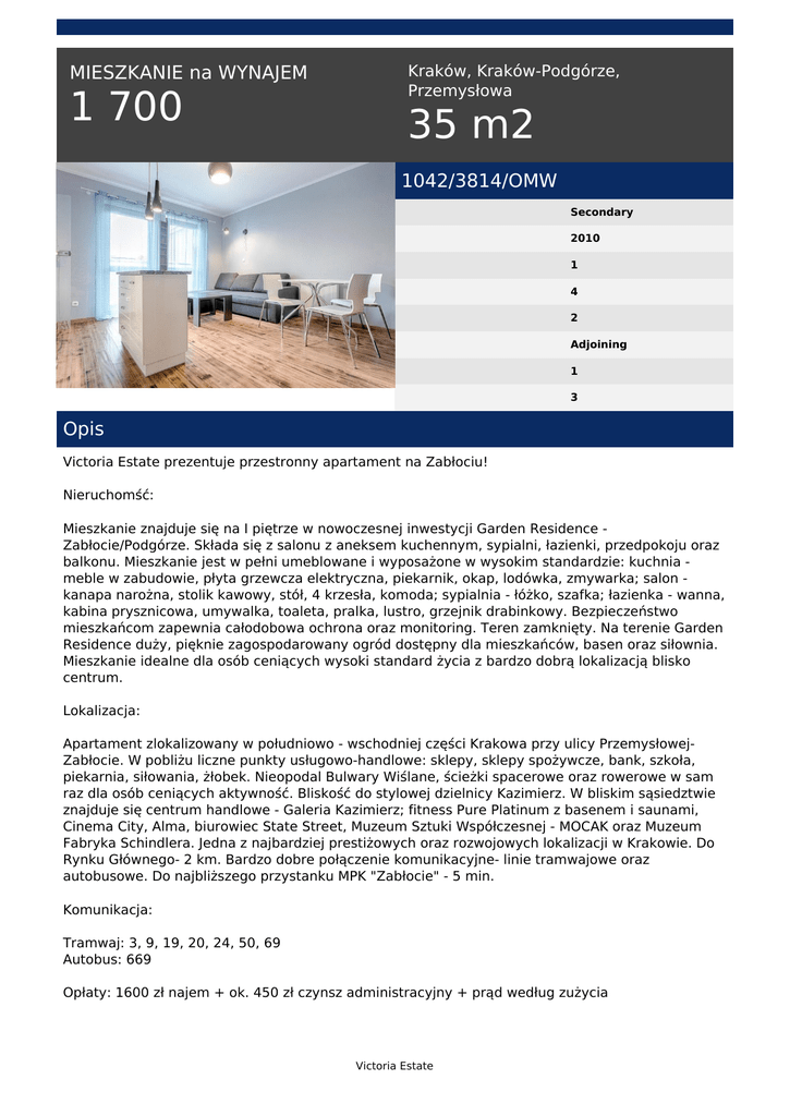 MIESZKANIE na WYNAJEM 1 700 Kraków, Kraków-Podgórze, Przemysłowa 35 m2 1042/3814/OMW Secondary 2010 1 4 2 Adjoining 1 3 Opis Victoria Estate prezentuje przestronny apartament na Zabłociu! Nieruchomść: Mieszkanie znajduje się na I piętrze w nowoczesnej inwestycji Garden Residence Zabłocie/Podgórze. Składa się z salonu z aneksem kuchennym, sypialni, łazienki, przedpokoju oraz balkonu. Mieszkanie jest w pełni umeblowane i wyposażone w wysokim standardzie: kuchnia meble w zabudowie, płyta grzewcza elektryczna, piekarnik, okap, lodówka, zmywarka; salon kanapa narożna, stolik kawowy, stół, 4 krzesła, komoda; sypialnia - łóżko, szafka; łazienka - wanna, kabina prysznicowa, umywalka, toaleta, pralka, lustro, grzejnik drabinkowy. Bezpieczeństwo mieszkańcom zapewnia całodobowa ochrona oraz monitoring. Teren zamknięty. Na terenie Garden Residence duży, pięknie zagospodarowany ogród dostępny dla mieszkańców, basen oraz siłownia. Mieszkanie idealne dla osób ceniących wysoki standard życia z bardzo dobrą lokalizacją blisko centrum. Lokalizacja: Apartament zlokalizowany w południowo - wschodniej części Krakowa przy ulicy PrzemysłowejZabłocie. W pobliżu liczne punkty usługowo-handlowe: sklepy, sklepy spożywcze, bank, szkoła, piekarnia, siłowania, żłobek. Nieopodal Bulwary Wiślane, ścieżki spacerowe oraz rowerowe w sam raz dla osób ceniących aktywność. Bliskość do stylowej dzielnicy Kazimierz. W bliskim sąsiedztwie znajduje się centrum handlowe - Galeria Kazimierz; fitness Pure Platinum z basenem i saunami, Cinema City, Alma, biurowiec State Street, Muzeum Sztuki Współczesnej - MOCAK oraz Muzeum Fabryka Schindlera. Jedna z najbardziej prestiżowych oraz rozwojowych lokalizacji w Krakowie. Do Rynku Głównego- 2 km. Bardzo dobre połączenie komunikacyjne- linie tramwajowe oraz autobusowe. Do najbliższego przystanku MPK "Zabłocie" - 5 min. Komunikacja: Tramwaj: 3, 9, 19, 20, 24, 50, 69 Autobus: 669 Opłaty: 1600 zł najem + ok. 450 zł czynsz administracyjny + prąd według zużycia Victoria Estate Serdecznie polecam i zapraszam do oglądania! Paulina Zajdel tel. +48 789 453 049 email: [email protected] Victoria Estate Powered by TCPDF (www.tcpdf.org)