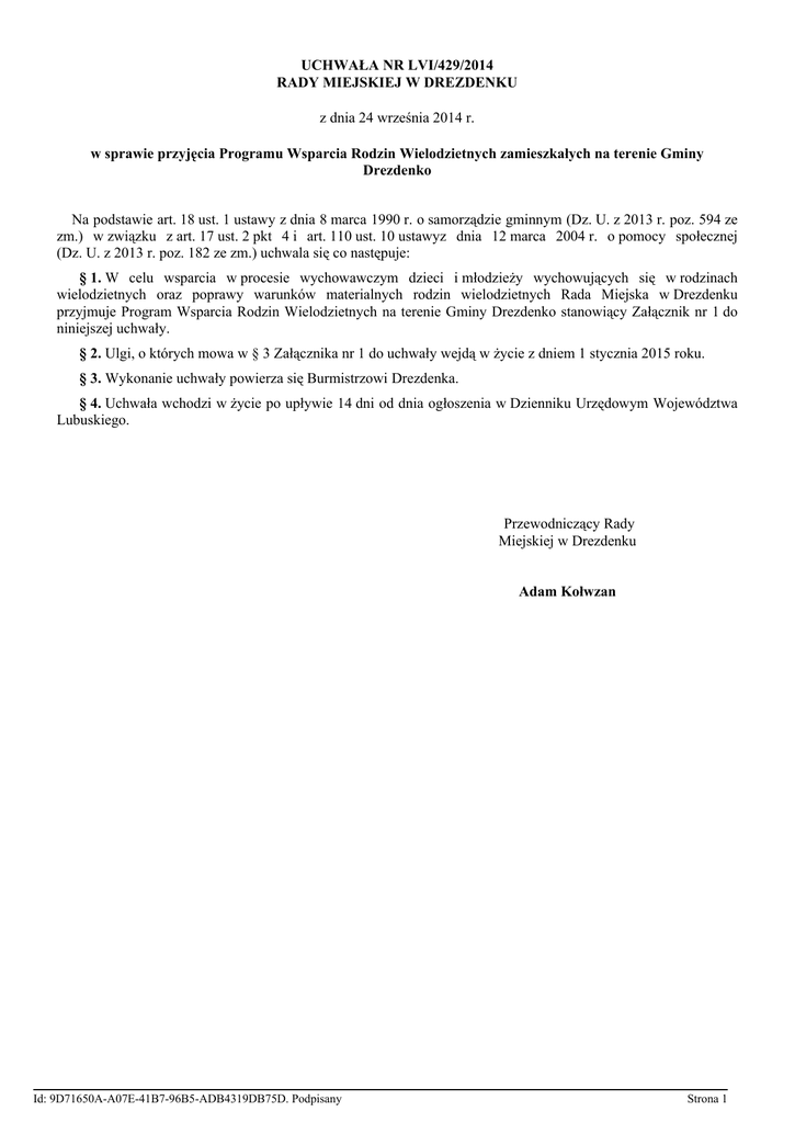 UCHWAŁA NR LVI/429/2014 RADY MIEJSKIEJ W DREZDENKU z dnia 24 września 2014 r. w sprawie przyjęcia Programu Wsparcia Rodzin Wielodzietnych zamieszkałych na terenie Gminy Drezdenko Na podstawie art. 18 ust. 1 ustawy z dnia 8 marca 1990 r. o samorządzie gminnym (Dz. U. z 2013 r. poz. 594 ze zm.) w związku z art. 17 ust. 2 pkt 4 i art. 110 ust. 10 ustawyz dnia 12 marca 2004 r. o pomocy społecznej (Dz. U. z 2013 r. poz. 182 ze zm.) uchwala się co następuje: § 1. W celu wsparcia w procesie wychowawczym dzieci i młodzieży wychowujących się w rodzinach wielodzietnych oraz poprawy warunków materialnych rodzin wielodzietnych Rada Miejska w Drezdenku przyjmuje Program Wsparcia Rodzin Wielodzietnych na terenie Gminy Drezdenko stanowiący Załącznik nr 1 do niniejszej uchwały. § 2. Ulgi, o których mowa w § 3 Załącznika nr 1 do uchwały wejdą w życie z dniem 1 stycznia 2015 roku. § 3. Wykonanie uchwały powierza się Burmistrzowi Drezdenka. § 4. Uchwała wchodzi w życie po upływie 14 dni od dnia ogłoszenia w Dzienniku Urzędowym Województwa Lubuskiego. Przewodniczący Rady Miejskiej w Drezdenku Adam Kołwzan Id: 9D71650A-A07E-41B7-96B5-ADB4319DB75D. Podpisany Strona 1 Załącznik Nr 1 do Uchwały Nr LVI/429/2014 Rady Miejskiej w Drezdenku z dnia 24 września 2014 r. Program Wsparcia Rodzin Wielodzietnych zamieszkałych na terenie Gminy Drezdenko § 1. Ilekroć w uchwale jest mowa: 1) o rodzinie wielodzietnej – należy przez to rozumieć rodzinę zamieszkałą na terenie Gminy Drezdenko (także rodzinę zastępczą), składającą się z rodziców (jednego rodzica) mających na utrzymaniu troje i więcej dzieci w wieku do 18 roku życia lub 25 roku życia w przypadku, gdy dziecko uczy się lub studiuje, bez ograniczeń wiekowych – w przypadku dzieci legitymujących się orzeczeniem o umiarkowanym lub znacznym stopniu niepełnosprawności; 2) o rodzinie zamieszkałej na terenie Gminy Drezdenko – należy rozumieć rodzinę, której wszyscy członkowie mieszkają na terenie gminy z wyjątkiem dzieci uczących się, które ze względu na miejsce pobierania nauki mogą okresowo mieszkać w innej miejscowości; 3) o Karcie Dużej Rodziny – należy przez to rozumieć dokument wydany na podstawie § 6 rozporządzenia Rady Ministrów z dnia 27 maja 2014 roku (Dz. U. z 2014 r. poz. 755), który pozwala korzystać z uprawnień wprowadzonych programem rządowym jaki również potwierdza prawo do korzystania z uprawnień przyznanych rodzinom wielodzietnym przez jednostkę samorządu terytorialnego. § 2. 1. Program Wsparcia Rodzin Wielodzietnych zamieszkałych na terenie Gminy Drezdenko ma na celu umacnianie i wspieranie realizacji funkcji rodziny wielodzietnej oraz poprawę warunków materialnych rodzin wielodzietnych. 2. Działania te są elementem polityki społecznej realizowanej w Gminie Drezdenko, które dają możliwość wsparcia rodzin wielodzietnych, promocji modelu rodziny wielodzietnej oraz kształtowanie pozytywnego jej wizerunku. 3. Prawo do korzystania z Programu przysługuje niezależnie od dochodu rodziny. § 3. Program, o którym mowa w § 2 będzie realizowany z wykorzystaniem następujących instrumentów: 1) umożliwienie dzieciom z rodziny wielodzietnej korzystania ze świadczeń Publicznego Przedszkola w Drezdenku, wykraczających poza podstawę programową wychowania przedszkolnego poprzez zastosowanie całkowitego zwolnienia z opłat za nauczanie, wychowanie i opiekę, prowadzone w czasie przekraczającym czas bezpłatnego nauczania, wychowania i opieki, ustalonym przez organ prowadzący; 2) dzieciom z rodziny wielodzietnej przysługuje obniżka opłaty za wyżywienie w Publicznym Przedszkolu w wysokości 50% miesięcznie; 3) dzieciom z rodziny wielodzietnej przysługuje obniżka opłaty za dożywianie w szkołach podstawowych i gimnazjach, dla których organem prowadzącym jest Gmina Drezdenko, w wysokości 50% miesięcznie; 4) rodzinom wielodzietnym przysługuje całkowite zwolnienie z opłaty za zajęcia płatne w Centrum Promocji Kultury w Drezdenku; 5) rodzinom wielodzietnym przysługuje całkowite zwolnienie z opłaty za bilety wstępu do Muzeum Puszczy Drawskiej i Noteckiej im. F. Grasia w Drezdenku; Id: 9D71650A-A07E-41B7-96B5-ADB4319DB75D. Podpisany Strona 2 6) rodziny wielodzietne wnoszą odpłatność w wysokości 50% kwoty miesięcznej od osoby za wywóz odpadów komunalnych; obniżka odpłatności przysługuje rodzinom wielodzietnym, które zadeklarowały sortowanie odpadów komunalnych oraz regulują terminowo opłaty za odbiór tych odpadów; 7) rodzinom wielodzietnym przysługuje obniżka opłaty za korzystanie z niektórych usług Hali Sportowo-Rehabilitacyjnej w wysokości 50% ceny usługi, katalog usług podlegających obniżce określony jest w Zarządzeniu Dyrektora Hali Sportowo-Rehabilitacyjnej. § 4. 1. Program będzie realizowany przez: 1) jednostki organizacyjne Gminy Drezdenko, 2) inne podmioty deklarujące chęć współpracy w ramach programu. 2. Przedsiębiorcy i instytucje nie będące jednostkami organizacyjnymi gminy działające na terenie Gminy Drezdenko mogą włączyć się w realizację Programu Wsparcia Rodzin Wielodzietnych wypełniając deklarację stanowiącą Załącznik do niniejszego Programu w której określą zakres i wysokość stosowanych ulg. 3. Informacja o podmiotach i instytucjach, które przystąpią do Programu będzie publikowana na stronach internetowych Gminy Drezdenko oraz w „Gazecie Drezdeneckiej”. § 5. 1. Potwierdzeniem uprawnień do korzystania z instrumentów opisanych w § 3 jest Karta Dużej Rodziny. 2. Karta Dużej Rodziny wydawana jest rodzinom wielodzietnym, o których mowa w § 1 pkt 1 na podstawie złożonego wniosku w Ośrodku Pomocy Społecznej w Drezdenku w terminie do 30 dni od złożenia wniosku. 3. Kartę Dużej Rodziny otrzymuje każdy członek rodziny wielodzietnej. § 6. 1. Jednostką koordynującą realizację Programu jest Ośrodek Pomocy Społecznej w Drezdenku. 2. O