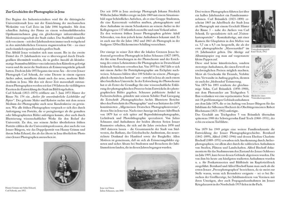 Zur Geschichte der Photographie in Jena Der Beginn des Industriezeitalters wird für die thüringische Universitätsstadt Jena mit der Einrichtung der mechanischen Werkstätte von Carl Zeiss im Jahr 1846 begründet. Mit dem schnellen Aufstieg der Firma zu einem weltmarktführenden Optikunternehmen ging ein gleichzeitiger infrastruktureller Modernisierungsschub der Stadt einher. Das Stadtbild wandelte sich von einem – seit drei Jahrhunderten immer noch weitgehend in den mittelalterlichen Grenzen stagnierendem Ort – zu einer auch räumlich expandierenden großen Stadt. Das Abbild Jenas verändert sich nun rasant. Bis in das zweite Drittel des 19. Jahrhunderts war es überwiegend durch Druckgrafiken übermittelt worden, die in großer Anzahl als kleinformatige Stammbuchblätter von einheimischen Künstlern gefertigt waren und die meist die Studenten als Erinnerungstücke gekauft hatten. Doch im Jahr 1853 begann eine neue Ära – der erste Jenaer Photograph Carl Schenk, der seine Dienste in einem eigenen Atelier anbot, installierte damit auch das neue, moderne Bildmedium in Jena. Mit den seit dieser Zeit massenhaft entstandenen Photographien werden seit fast 150 Jahren die vielfältigsten Facetten der Entwicklung der Stadt im Bild festgehalten. Carl Schenk (1813–1874) eröffnete am 7. Juni 1853 Hinter der Rinne Nr. 154 ein „Atelier für unveränderliche Lichtbilder auf Papier“. Der gelernte Maler und Kolorist suchte mit dem neuen Medium der Photographie auch neue Kundenkreise zu gewinnen. Wie alle frühen Photographen versprach er sich dies durch Anfertigung von Porträts, die er preisgünstiger als die gemalten oder lithographierten Bilder anfertigen konnte, aber auch durch Illustrierung wissenschaftlicher Werke für den Bedarf der Universität. Zu den, aus seinem Atelier überlieferten frühen Porträts zählen die der Universitätsprofessoren, aber auch die von Jenaer Bürgern, wie das Doppelporträt von Hanny Grimm und ihrem Sohn Eduard, das als das älteste in Jena überlieferte Photo eines Jenaer Photographen anzusehen ist. Hanni Grimm mit Sohn Eduard, Carl Schenk, um 1852 Der seit 1858 in Jena ansässige Photograph Johann Friedrich Wilhelm Julius Müller erregte im Jahr 1869 mit einem Situationsbild sogar behördliches Aufsehen, als er eine Gruppe Studenten, die eine Karzerstrafe verbüßen mußten, photographierte und diese Aufnahme in einem Schaukasten an seinem Atelier in der Kollegiengasse 137 öffentlich ausstellte und zum Verkauf anbot. Zu den weiteren frühen Jenaer Photographen gehörte Adolf Schwenker, von dem jedoch keine Aufnahmen bekannt sind. Er ist auch nur für die Jahre 1862 und 1863 als Photograph in der Saalgasse 328 bei Bäckermeister Schilling verzeichnet. Der einzige in seiner Zeit über die lokalen Grenzen Jenas bedeutend gewordene Photograph ist Julius Schnauss (1827-1895), der für seine Forschungen in der Photochemie und der Errichtung des ersten Lehrinstitutes für Photographen in Deutschland bleibende Verdienste erworben hat. Von 1855 bis 1867 läßt er sich mit einem Atelier für Porträtphotographie am Eichplatz nachweisen. Schnauss bildete über 100 Schüler in seinem „Photographisch-chemischen Institut“ aus – sowohl in Jena als auch extern über brieflichen Unterricht. In der Erforschung der Photochemie hat er als Erster die Grundlage für eine wissenschaftliche Erklärung der photographischen Prozesse beim Entwickeln des photographischen Bildes gegeben. Schnauss publizierte Artikel in Fachzeitschriften, gründete mit seinem Schüler Paul Liesegang die Zeitschrift „Photographisches Archiv. Illustrierte Berichte über den Fortschritt der Photographie“ und war Initiator des 1858 konstituierten „Allgemeinen Deutschen Photographenvereins“, dessen Sitz in Jena war. Nach einer Anzeige im Jenaer Adreßbuch von 1879 hat er sich später auf Reproduktionsphotographie, Lichtdruck und Photolithographie spezialisiert. Von Julius Schnauss sind Aufnahmen der beiden ältesten Serien Jenaer Baumotive erhalten, die sich auf die Jahre zwischen 1858 und 1865 datieren lassen – die Gesamtansicht der Stadt von Südwesten, das Rathaus, das Griesbachsche Auditorium, das neuerrichtete Denkmal des Hanfried sowie der Burgkeller. Allen Motiven ist gemeinsam, daß sie sich als Erinnerungsbilder eigneten und sicher Absatz bei Studenten und Besuchern der Jubiläumsfeiern fanden, die in diesen Jahren begangen wurden. Jena von Osten Julius Schnauss, um 1860 Drei weitere Photographen führten fast über ein halbes Jahrhundert ein Familienunternehmen. Carl Bräunlich (1823–1890) erscheint 1865 im Adreßbuch der Stadt Jena als Photograph mit einem Geschäft Hinter der Rinne 3 – nahe des Ateliers von Carl Schenk. Er spezialisierte sich auf „Visitenkartenporträts“ – Kontaktabzüge, mit einer Kamera für Glasplatten in den Maßen von ca. 5,7 cm x 8,5 cm hergestellt, die als der erste photographische „Massenartikel“ im Visitenkartenporträt 19. Jahrhundert gelten. Die Abzüge auf Emil Tesch, 1912 Albuminpapier zog man auf vorgestanzte kleine Pappen auf. Diese sind keine künstlerischen, sondern stereotype Aufnahmen, die einen Erwerb zu erschwinglichen Preisen möglich machten. Meist als Geschenke für Freunde, Verlobte bzw. Verwandte in Auftrag gegeben, dienten sie auch der „bleibenden“ Erinnerung. Von 1879 bis 1893 residierte der gleichnamige Sohn, Carl Bräunlich (1850–1900), mit dem Photoatelier am Teichgraben 5. eines Ihm verdanken wir eine repräsentative Serie Rückseite Visitenkartenporträts mit 18 großformatigen Gebäudeaufnahmen aus dem Jahr 1879, die er im Auftrag von Jenaer Bürgern für das Jubiläum der Silbernen Hochzeit des Oberbürgermeisters Robert Blochmann (1823–1902) anfertigte. Das Geschäft am Teichgraben 5 von Bräunlich übernahm spätestens 1900 der Schwiegersohn Emil Tesch (1860–1931), der es bis zu seinem Tod führte. Von 1879 bis 1949 prägte eine weitere Familiendynastie die Entwicklung der Jenaer Photographieges