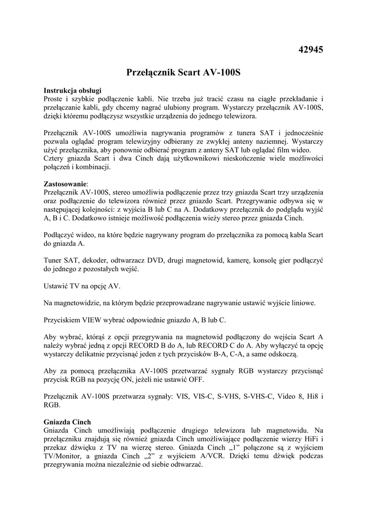 42945 Przełącznik Scart AV-100S Instrukcja obsługi Proste i szybkie podłączenie kabli. Nie trzeba juŜ tracić czasu na ciągłe przekładanie i przełączanie kabli, gdy chcemy nagrać ulubiony program. Wystarczy przełącznik AV-100S, dzięki któremu podłączysz wszystkie urządzenia do jednego telewizora. Przełącznik AV-100S umoŜliwia nagrywania programów z tunera SAT i jednocześnie pozwala oglądać program telewizyjny odbierany ze zwykłej anteny naziemnej. Wystarczy uŜyć przełącznika, aby ponownie odbierać program z anteny SAT lub oglądać film wideo. Cztery gniazda Scart i dwa Cinch dają uŜytkownikowi nieskończenie wiele moŜliwości połączeń i kombinacji. Zastosowanie: Przełącznik AV-100S, stereo umoŜliwia podłączenie przez trzy gniazda Scart trzy urządzenia oraz podłączenie do telewizora równieŜ przez gniazdo Scart. Przegrywanie odbywa się w następującej kolejności: z wyjścia B lub C na A. Dodatkowy przełącznik do podglądu wyjść A, B i C. Dodatkowo istnieje moŜliwość podłączenia wieŜy stereo przez gniazda Cinch. Podłączyć wideo, na które będzie nagrywany program do przełącznika za pomocą kabla Scart do gniazda A. Tuner SAT, dekoder, odtwarzacz DVD, drugi magnetowid, kamerę, konsolę gier podłączyć do jednego z pozostałych wejść. Ustawić TV na opcję AV. Na magnetowidzie, na którym będzie przeprowadzane nagrywanie ustawić wyjście liniowe. Przyciskiem VIEW wybrać odpowiednie gniazdo A, B lub C. Aby wybrać, którąś z opcji przegrywania na magnetowid podłączony do wejścia Scart A naleŜy wybrać jedną z opcji RECORD B do A, lub RECORD C do A. Aby wyłączyć ta opcję wystarczy delikatnie przycisnąć jeden z tych przycisków B-A, C-A, a same odskoczą. Aby za pomocą przełącznika AV-100S przetwarzać sygnały RGB wystarczy przycisnąć przycisk RGB na pozycję ON, jeŜeli nie ustawić OFF. Przełącznik AV-100S przetwarza sygnały: VIS, VIS-C, S-VHS, S-VHS-C, Video 8, Hi8 i RGB. Gniazda Cinch Gniazda Cinch umoŜliwiają podłączenie drugiego telewizora lub magnetowidu. Na przełączniku znajdują się równieŜ gniazda Cinch umoŜliwiające podłączenie wierzy HiFi i przekaz dźwięku z TV na wierzę stereo. Gniazda Cinch „1” połączone są z wyjściem TV/Monitor, a gniazda Cinch „2” z wyjściem A/VCR. Dzięki temu dźwięk podczas przegrywania moŜna niezaleŜnie od siebie odtwarzać. Wymiary: 14 cm x 15 cm x 5 cm Waga: 300 g