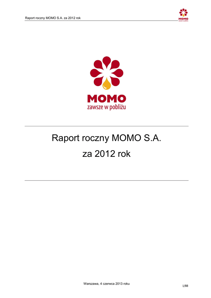 Raport roczny MOMO S.A. za 2012 rok Raport roczny MOMO S.A. za 2012 rok Warszawa, 4 czerwca 2013 roku 1/88 Raport roczny MOMO S.A. za 2012 rok Spis treści I. Pismo Zarządu Emitenta .................................................................................... 3 II. Wybrane dane finansowe ................................................................................... 4 III. Oświadczenia Zarządu Emitenta........................................................................ 5 IV. Oświadczenie o stosowaniu Dobrych Praktyk Spółek Notowanych na NewConnect ...................................................................................................... 6 V. Załączniki ......................................................................................................... 11 V.1. Sprawozdanie z działalności Emitenta V.2. Roczne sprawozdanie finansowe (wraz z wynagrodzeniem Członków Zarządu oraz ............................................................. 11 Rady Nadzorczej MOMO S.A. w 2012 roku) .......................................................... 11 V.3. Opinia i raport podmiotu uprawnionego do badania sprawozdań finansowych z badania rocznego sprawozdania finansowego .............................................................. 11 2/88 Raport roczny MOMO S.A. za 2012 rok I. Pismo Zarządu Emitenta 3/88 Raport roczny MOMO S.A. za 2012 rok II. Wybrane dane finansowe Aktywa trwałe Rzeczowe aktywa trwałe Aktywa obrotowe Należności krótkoterminowe Inwestycje krótkoterminowe Kapitały własne Zobowiązania i rezerwy na zobowiązania Przychody netto ze sprzedaży Koszty działalności operacyjnej Pozostałe koszty operacyjne Zysk / strata rok 2012 okres od 2012-01-01 do 2012-12-31 PLN EUR* 3 561 651,19 871 202,78 554 888,82 135 729,37 1 284 307,50 314 149,87 132 618,00 32 439,22 1 038 687,68 254 069,68 3 523 214,65 861 800,95 1 322 744,04 323 551,70 10 360 276,23 2 482 335,69 10 882 212,62 2 607 392,33 542 688,96 130 028,98 -1 093 366,69 -261 972,08 Warszawa, 28 czerwca 2012 roku 4/88 Raport roczny MOMO S.A. za 2012 rok III. Oświadczenia Zarządu Emitenta 5/88 Raport roczny MOMO S.A. za 2012 rok IV. Oświadczenie o stosowaniu Dobrych Praktyk Spółek Notowanych na NewConnect 6/88 Raport roczny MOMO S.A. za 2012 rok 7/88 Raport roczny MOMO S.A. za 2012 rok 8/88 Raport roczny MOMO S.A. za 2012 rok 9/88 Raport roczny MOMO S.A. za 2012 rok 10/88 Raport roczny MOMO S.A. za 2012 rok V. Załączniki V.1.Sprawozdanie z działalności Emitenta (wraz z wynagrodzeniem Członków Zarządu oraz Rady Nadzorczej MOMO S.A. w 2012 roku) V.2.Roczne sprawozdanie finansowe V.3.Opinia i raport podmiotu uprawnionego do badania sprawozdań finansowych z badania rocznego sprawozdania finansowego 11/88 Raport roczny MOMO S.A. za 2012 rok MOMO Spółka Akcyjna adres: Mokotowska 4/6 00-641 Warszawa tel: +48 22 378 11 60 fax: +48 22 378 10 97 e-mail: [email protected] www.momo.com.pl 12/88 Raport roczny MOMO S.A. za 2012 rok Załącznik V.1. Sprawozdanie z działalności Emitenta (wraz z wynagrodzeniem Członków Zarządu oraz Rady Nadzorczej MOMO S.A. w 2012 roku) Sprawozdanie Zarządu MOMO S.A. z działalności Spółki za okres 01.01 – 31.12.2012 13/88 Sprawozdanie Zarządu MOMO S.A. z działalności Spółki za okres 1.01 – 31.12.2012 I. PODSTAWOWE INFORMACJE O SPÓŁCE Firma, forma prawna, rejestr Spółki i posiadane oddziały. I.1. W dniu 1 czerwca 2010 dokonano rejestracji Spółki w rejestrze przedsiębiorców prowadzonym przez Sąd Rejonowy dla m.st. Warszawy XII Wydział Gospodarczy Krajowego Rejestru Sądowego pod nr KRS 0000357798. Dnia 10 czerwca 2010 roku Naczelnik Trzeciego Urzędu Skarbowego Warszawa Śródmieście wydał decyzje nadająca spółce numer identyfikacji podatkowej 7010237061. Spółka została wpisana do Krajowego Rejestru Urzędowego Podmiotów Gospodarki Narodowej pod numerem REGON 142403995 w dniu 14 czerwca 2010 roku. W dniu 22 czerwca 2010 roku spółka dokonała zgłoszenia rejestracyjnego w zakresie podatku od towarów i usług VAT. Spółka nie posiada oddziałów, a swoją działalność od września 2010 do 31 stycznia 2012 roku prowadziła w Warszawie przy ul. Świętej Barbary 1. 1 lutego 2012 MOMO S.A. przeniosła swoją siedzibę na ul. Mokotowską 4/6 w Warszawie, gdzie prowadzi swoją działalność do dziś. Siedziba została zmieniona w KRS w tym samym dniu. Zezwolenia i przedmiot przedsiębiorstwa. I.2. 15 grudnia 2010 MOMO S.A. uzyskało pozwolenie na użytkowanie Automatycznej Stacji Paliw MOMO od Powiatowego Inspektora Budowlanego w Powiecie Grodziskim. Decyzją Prezesa Urzędu Regulacji Energetyki z dnia 17 grudnia 2010 roku Spółka uzyskała 10 letnią koncesję na obrót paliwami ciekłymi w zakresie: Obrotu benzynami silnikowymi innymi niż benzyny lotnicze, Obrotu olejami napędowymi na stacji paliw płynnych, MOMO S.A. w dalszym ciągu dąży do utworzenia sieci automatycznych stacji paliw MOMO. Swoją działalność Spółka koncentruje głównie na obszarze województwa mazowieckiego, choć nie wyklucza ekspansji w innych rejonach kraju w przypadku pozyskania atrakcyjnej lokalizacji. Głównymi źródłami przewagi konkurencyjnej MOMO jak udowodnił 2011 rok są przede wszystkim: Szybkość i jakość obsługi, Jakość i ograniczona ilość produktów (ON, PB95, PB98 tylko od hurtowników gwarantujących wysoką jakość), Lokalizacja i zorientowanie na klienta lokalnego, Polityka zakupowa polegająca na obserwowaniu zjawisk makroekonomicznych i prognozowaniu hurtowych cen paliw, Akcje marketingowe trafiające w potrzeby klienta lokalnego, Zgodnie ze statutem przedmiotem działalności przedsiębiorstwa jest: 14/88 Sprawozdanie Zarządu MOMO S.A. z działalności Spółki za okres 1.01 – 31.12.2012 Sprzedaż hurtowa części i akcesoriów do pojazdów samochodowych, z wyłączeniem motocykli (PKD 45.31.Z), Sprzedaż detaliczna części i akcesoriów do pojazdów samochodowych, z wyłączeniem motocykli (PKD 45.3
