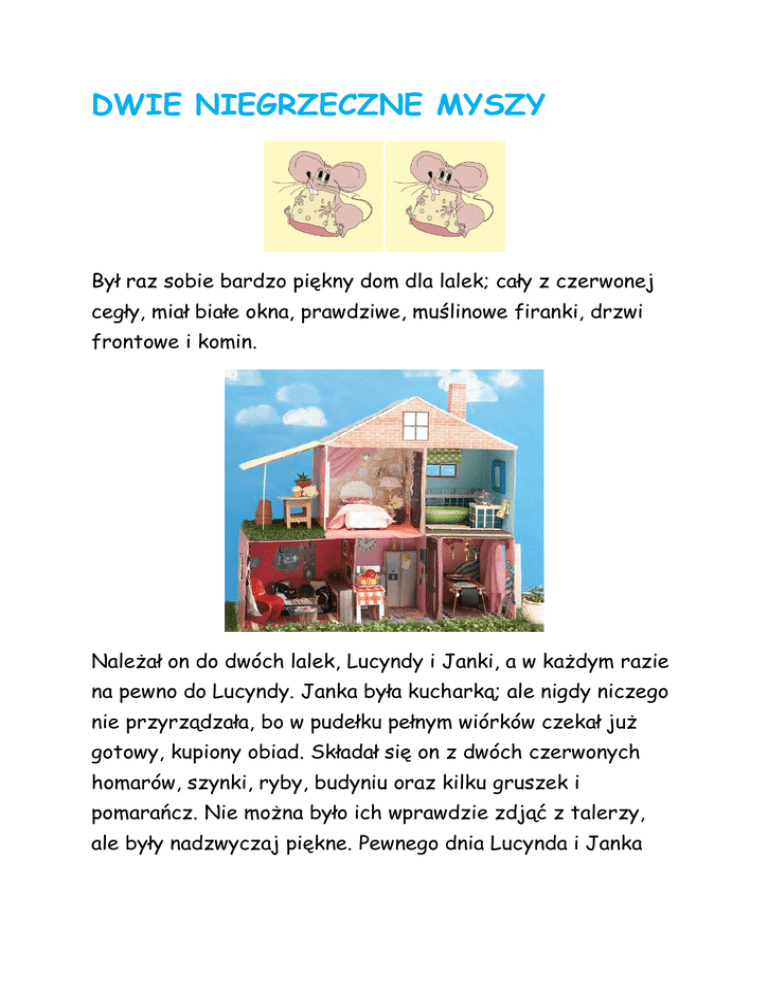 DWIE NIEGRZECZNE MYSZY Był raz sobie bardzo piękny dom dla lalek; cały z czerwonej cegły, miał białe okna, prawdziwe, muślinowe firanki, drzwi frontowe i komin. Należał on do dwóch lalek, Lucyndy i Janki, a w każdym razie na pewno do Lucyndy. Janka była kucharką; ale nigdy niczego nie przyrządzała, bo w pudełku pełnym wiórków czekał już gotowy, kupiony obiad. Składał się on z dwóch czerwonych homarów, szynki, ryby, budyniu oraz kilku gruszek i pomarańcz. Nie można było ich wprawdzie zdjąć z talerzy, ale były nadzwyczaj piękne. Pewnego dnia Lucynda i Janka wybrały się wózeczkiem na przejażdżkę. W pokoju dziecinnym zrobiło się cicho i pusto. Naraz dało się słyszeć nieznaczne szuranie i skrobanie w kącie opodal kominka, tam gdzie pod listwą podłogi była dziura. Wścibek na chwilę wystawił łepek, po czym znów go schował. Wścibek był myszą. W chwilę potem Gryzikruszka, jego żona, wystawiła łepek, a kiedy zobaczyła, że w pokoju dziecinnym nikogo nie ma, odważyła się wyjść zza skrzyni na węgiel. Dom lalek stał po drugiej stronie kominka. Wścibek i Gryzikruszka chyłkiem przemknęli po dywanie. Pchnęli frontowe drzwi domku – nie były mocno zamknięte. Wścibek i Gryzikruszka weszli na górę po schodach i zajrzeli do jadalni. Aż pisnęli z radości! Ach jak rozkoszny obiad postawiono na stole! A do tego były tam cynowe łyżki, ołowiane noże i widelce i dwa malutkie krzesła – wszystko w sam raz! Nie czekając, Wścibek wziął się do krojenia szynki. Była piękna, lśniąco żółta, w czerwone paski. Nóż wygiął się i skaleczył go w palec. Wścibek włożył palec do pyszczka. - Nie dość dobrze ugotowana; jest twarda. Spróbuj ty, Gryzikruszko. Gryzikruszka stanęła na swym krześle i zamierzyła się na szynkę innym ołowianym nożem. - Jest twarda jak kamień – orzekła. Szynka odłupała się raptem od talerza i potoczyła pod stół. - Zostaw ją – rzekł Wścibek – Podaj mi rybę Gryzikruszko! Gryzikruszka próbowała zdjąć rybę z półmiska, lecz ta nie dawała za wygraną. Nie pomogły cynowe łyżeczki. Wtedy Wścibek stracił cierpliwość. Położył szynkę na środku pokoju i walił w nią to szczypcami, to łopatą – bum, bum, trach, trach! Szynka rozleciała się na kawałki. Pod lśniącą farbą, zrobiona była po prostu z gipsu! Nie było końca złości i rozczarowaniu. Wścibek i Gryzikruszka pokruszyli budyń, homary, gruszki i pomarańcze. Ponieważ ryby nie można było zdjąć z półmiska, wsadzili ją w kuchni do ognia, zrobionego z czerwonej, marszczonej bibułki; lecz ryba się nie paliła. Wścibek wspiął się kuchennym kominem i wyjrzał – nie było tam sadzy. Gdy Wścibek był w kominie, Gryzikruszka przeżyła jeszcze jedno rozczarowanie. Znalazła na kredensie kilka cynowych puszek z naklejkami: - Ryż, Kawa, Mąka – a kiedy odwróciła je dnem do góry wysypały się z nich tylko czerwone i niebieskie paciorki. Wtedy myszy zaczęły psocić, jak tylko mogły – szczególnie Wścibek. Wyjął ubrania Janki z komody w jej sypialni i wyrzucił je przez okno z najwyższego piętra. Gryzikruszka miała praktyczną naturę. Gdy już wypuściła połowę puchu z poduszki Lucyndy, przypomniała sobie, że zawsze chciała sypiać w puchowym łożu. Za pomocą Wścibka staszczyła poduszkę schodami w dół, a potem przeciągnęła ją po dywanie. Trudno było wcisnąć poduszkę do mysiej dziury; ale jakoś się uporali. Następnie Gryzikruszka wróciła po krzesło, biblioteczkę, klatkę dla ptaków i sporo różnych drobiazgów. Biblioteczka i klatka dla ptaków nie chciały się zmieścić w mysiej dziurze. Gryzikruszka zostawiła je za skrzynką na węgiel i zaczęła taszczyć kołyskę. Gryzikruszka wracała właśnie z kolejnym krzesłem, gdy nagle dały się słyszeć głosy na półpiętrze. Myszy pognały z powrotem do swojej dziury, a w pokoju dziecinnym pojawiły się lalki. Cóż za widok okazał się oczom Janki i Lucyndy! Lucynda opadła na wywrócony piec kuchenny i wytrzeszczała oczy; a Janka – z zamarłym uśmiechem, oparła się o kuchenny kredens – lecz żadna z nich nie uczyniła najmniejszej uwagi. Biblioteczka i klatka dla ptaków zostały wydobyte zza skrzynki na węgiel – ale kołyska i kilka ubranek Lucyndy zostały u Gryzikruszki. Nie mówiąc o garnkach, rondlach i innych rzeczach. Dziewczynka, do której należał dom dla lalek, rzekła: - Wolałabym lalkę w stroju policjanta! Ale niania powiedziała: - Nastawię łapkę na myszy! Oto cała historia dwóch niegrzecznych myszy, - lecz nie były one aż tak bardzo, bardzo nieznośne. A do tego Wścibek zapłacił za wszystko co popsuł. Znalazł on pod dywanikiem pogiętą monetę; w Wigilię Bożego Narodzenia wraz z Gryzikruszką włożyli pieniążek do jednej z pończoch Lucyndy i Janki. A każdego ranka, bardzo wcześnie – zanim ktokolwiek się obudzi – Gryzikruszka zjawia się ze śmietniczką i miotłą, by pozamiatać w domu lalek.