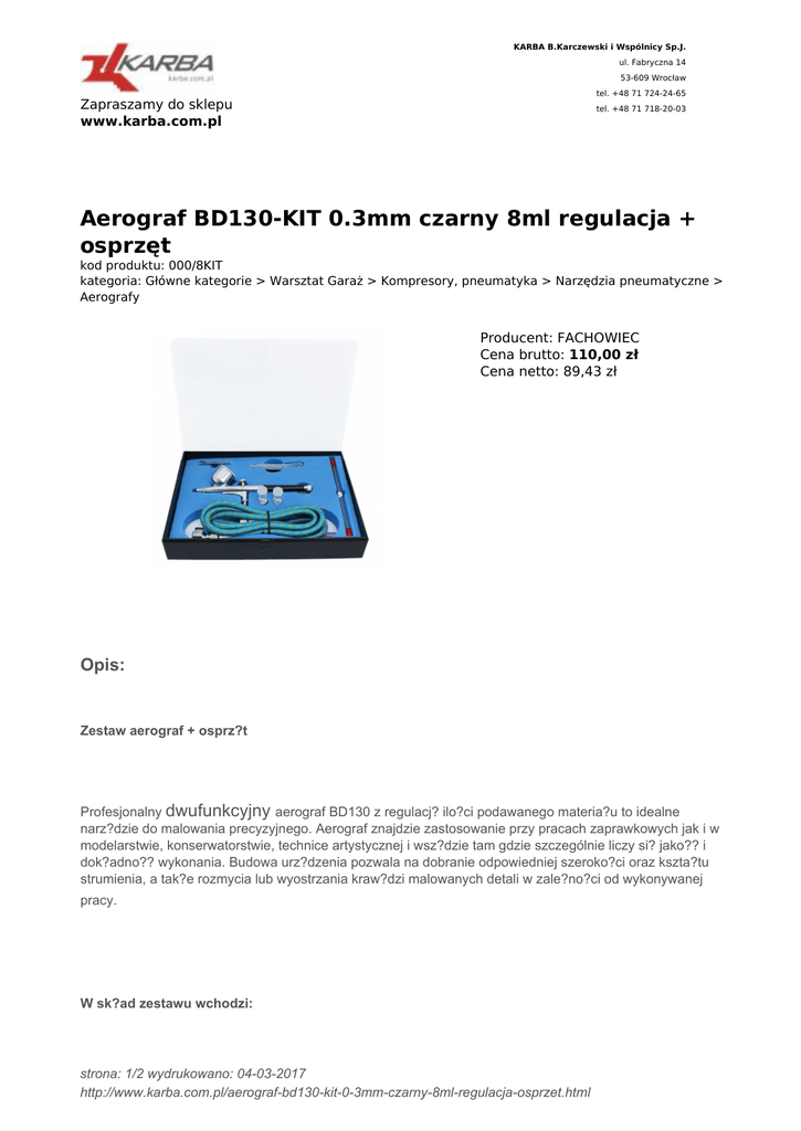 KARBA B.Karczewski i Wspólnicy Sp.J. ul. Fabryczna 14 53-609 Wrocław tel. +48 71 724-24-65 Zapraszamy do sklepu www.karba.com.pl tel. +48 71 718-20-03 Aerograf BD130-KIT 0.3mm czarny 8ml regulacja + osprzęt kod produktu: 000/8KIT kategoria: Główne kategorie > Warsztat Garaż > Kompresory, pneumatyka > Narzędzia pneumatyczne > Aerografy Producent: FACHOWIEC Cena brutto: 110,00 zł Cena netto: 89,43 zł Opis: Zestaw aerograf + osprz?t Profesjonalny dwufunkcyjny aerograf BD130 z regulacj? ilo?ci podawanego materia?u to idealne narz?dzie do malowania precyzyjnego. Aerograf znajdzie zastosowanie przy pracach zaprawkowych jak i w modelarstwie, konserwatorstwie, technice artystycznej i wsz?dzie tam gdzie szczególnie liczy si? jako?? i dok?adno?? wykonania. Budowa urz?dzenia pozwala na dobranie odpowiedniej szeroko?ci oraz kszta?tu strumienia, a tak?e rozmycia lub wyostrzania kraw?dzi malowanych detali w zale?no?ci od wykonywanej pracy. W sk?ad zestawu wchodzi: strona: 1/2 wydrukowano: 04-03-2017 http://www.karba.com.pl/aerograf-bd130-kit-0-3mm-czarny-8ml-regulacja-osprzet.html - aerograf BD130 - przewód do aerografu 2 mb z redukcj? 1/4" GW - dodatkowa dysza z iglic? 0,2 i 0,5 mm - klucz serwisowy - pipeta DANE TECHNICZNE: ?rednica dyszy [mm] 0,3 Pojemno?? zbiornika [ml] 8 Przep?yw powietrza [l/min] 10 Max ci?nienie [bar] 2,2 Przy??cze 1/8" GZ D?ugo?? [mm] 145 Waga [g] 96 strona: 2/2 wydrukowano: 04-03-2017 http://www.karba.com.pl/aerograf-bd130-kit-0-3mm-czarny-8ml-regulacja-osprzet.html