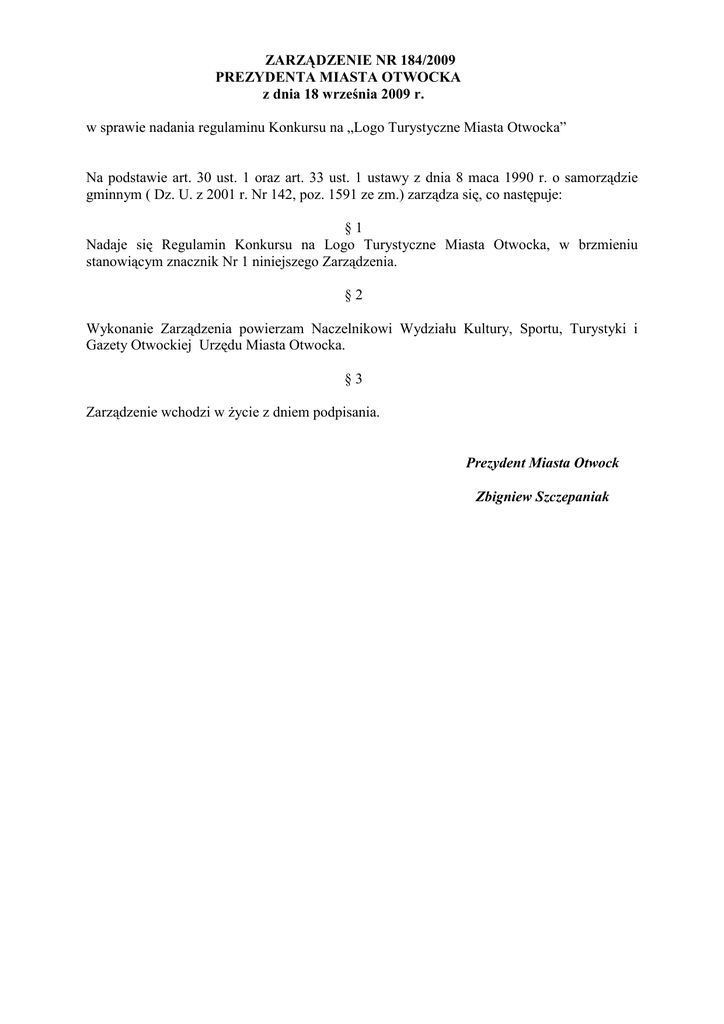 ZARZĄDZENIE NR 184/2009 PREZYDENTA MIASTA