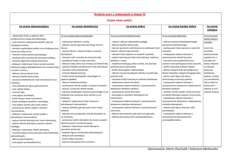 Kryteria ocen z matematyki w klasie IV Uczeń musi umieć: na ocenę dopuszczającą - odejmowad liczby w zakresie 100 z przekroczeniem progu dziesiątkowego, - znad kolejnośd wykonywania działao, gdy nie występuję nawiasy, - odczytad współrzędne punktu na osi liczbowej oraz zaznaczad liczby na osi, - rozumied istotę systemu pozycyjnego, - stosowad cyfry rzymskie do oznaczania wieków, - stosowad algorytmy działao pisemnych, - dodawad i odejmowad liczby z przekroczeniem kolejnych progów dziesiątkowych oraz mnożyd liczby z zerami na koocu, - obliczad różnicę danych liczb, - wskazad dzielnik danej liczby, - zaznaczad wielokrotności liczb naturalnych na osi liczbowej, - znad podstawowe figury geometryczne, - znad rodzaje kątów, - zmierzyd kąty, - znad pojęcie prostokąta, - kreślid okrąg o danym promieniu, - kreślid przekątne kwadratu i prostokąta, - znad pojęcie ułamka jako części całości, - porównywad ułamki zwykłe o równych mianownikach, - dodawad i odejmowad ułamki zwykłe o jednakowych mianownikach, - zapisad ułamek dziesiętny bez kreski ułamkowej, - zapisad ułamek dziesiętny w postaci ułamka zwykłego, - dodawad i odejmowad ułamki dziesiętne, - rozumied pojęcie miary pola jako liczby kwadratów jednostkowych, - obliczad pole kwadratu, - znad pojęcie prostopadłościanu. na ocenę dostateczną na ocenę dobrą na ocenę bardzo dobrą To co na ocenę dopuszczającą plus: To co na ocenę dostateczną plus: To co na ocenę dobrą plus: - wykonywad dzielenie z resztą, - obliczad czynnik, gdy dany jest drugi czynnik i iloczyn, - zapisad cyframi i słowami liczby w systemie dziesiętnym, - stosowad cyfry rzymskie do oznaczenia dat, - powiększad liczbę o liczbę naturalną, - obliczad liczbę cztery razy mniejszą od danej liczby, - wskazad wspólne wielokrotności liczb naturalnych, - stosowad cechy podzielności, - zmierzyd długośd łamanej, - kreślid proste prostopadłe i równoległe na papierze gładkim, - obliczad obwód prostokąta, - porównywad ułamki zwykłe o równych licznikach, - skracad i rozszerzad ułamki zwykłe, - odczytad współrzędne ułamka zaznaczonego na osi liczbowej oraz zaznaczyd dany ułamek na osi liczbowej, - dodawad i odejmowad liczby mieszane o jednakowych mianownikach, - obliczad składnik, gdy dana jest suma i drugi składnik, - odczytad oraz przedstawid ułamek dziesiętny na osi liczbowej, - zastosowad ułamki dziesiętne do zmiany wyrażeo dwumianowych na jednomianowe, - dodawad i odejmowad ułamki dziesiętne sposobem pisemnym, - budowad figury z kwadratów jednostkowych, - obliczad pole prostokąta, - kreślid siatkę sześcianu, - obliczad pole powierzchni sześcianu. - zapisad i obliczyd odpowiednią potęgę, - obliczad kwadrat danej liczby, - tworzyd wyrażenie arytmetyczne na podstawie treści zadania i obliczyd jego wartośd, - odczytad liczby zapisane w systemie rzymskim, - zapisad najmniejszą liczbę czterocyfrową i wykonad dzielenie z resztą, - znajdowad brakującą cyfrę w liczbie, tak aby była podzielna przez daną liczbę, - kreślid poszczególne rodzaje kątów, - obliczad rzeczywistą długośd odcinka na podstawie podanej skali, - zamieniad liczbę mieszaną na ułamek niewłaściwy, - odejmowad ułamek od całości, - rozwiązywad zadania tekstowe z zastosowaniem dodawania ułamków zwykłych, - porównywad ułamki dziesiętne, - dostrzegad w ułamkach dziesiętnych zer nieistotnych, - rozwiązywad zadania tekstowe z zastosowaniem dodawania ułamków dziesiętnych, - rozwiązywad zadania tekstowe na porównywanie różnicowe, - obliczad bok kwadratu, gdy dane jest jego pole, - obliczyd pole powierzchni prostopadłościanu. - obliczad wartośd wielodziałaniowego wyrażenia arytmetycznego, - porównywad liczby zapisane w systemie rzymskim, - rozwiązywad zadania tekstowe z zastosowaniem działao łącznych, - stosowad cechy podzielności przy szukaniu liczb spełniających dany warunek, - kreślid czworokąt o danych kątach, - obliczad długośd boku prostokąta przy danym obwodzie i długości drugiego boku, - opisad części figury lub zbioru skooczonego za pomocą ułamka, - rozwiązywad zadania tekstowe z zastosowaniem dodawania i odejmowania ułamków zwykłych, - zamienid ułamki zwykłe i liczby mieszane na ułamki dziesiętne poprzez rozszerzanie, - rozwiązywad zadania tekstowe z zastosowaniem dodawania i odejmowania ułamków dziesiętnych, - obliczad pole figury złożonej z kilku prostokątów, - rozwiązywad zadania tekstowe z zastosowaniem pól powierzchni prostopadłościanów. na ocenę celującą To co na ocenę bardzo dobrą a ponadto: Uczeo zna wszystkie dotychczasowe zagadnienia, a ponadto jest bardzo aktywny na lekcjach, wykonuje dodatkowe zadania, rozwija się samodzielnie, bierze udział w konkursach i zajmuje w nich czołowe miejsca. Opracowanie: Marta Chocholak i Katarzyna Markowska Kryteria ocen z matematyki w klasie V Uczeń musi umieć: na ocenę dopuszczającą - porównywad liczby naturalne, - dodawad, odejmowad, mnożyd i dzielid liczby naturalne sposobem pisemnym, - rozumied pojęcie ułamka jako wyniku podziału całości na równe części, - dodawad ułamki zwykłe o tych samych mianownikach, - porównywad ułamki zwykłe o równych mianownikach, - znad algorytm mnożenia ułamka przez liczbę naturalną, - mnożyd ułamek zwykły przez ułamek zwykły, - podad liczbę odwrotną do danej, - znad pojęcia równoległoboku i rombu, - określid rodzaj narysowanego trójkąta, - znad sumy miar kątów wewnętrznych trójkąta, - porównywad ułamki dziesiętne, - mnożyd i dzielid ułamek dziesiętny przez 10, - znad algorytm dodawania i mnożenia ułamków dziesiętnych, - rozumied pojęcie pola jako liczby figur jednostkowych, - obliczad pole kwadratu, - obliczad pole prostokąta, - znad pojęcie liczb przeciwnych, - obliczad sumy liczb ujemnych, - zaznaczad liczby całkowite ujemne na osi liczbowej oraz odczytywad współrzędne zaznaczonej licz