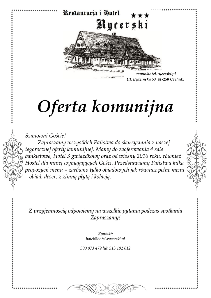 www.hotel-rycerski.pl Ul. Będzińska 53, 41-250 Czeladź Oferta komunijna Szanowni Goście! Zapraszamy wszystkich Państwa do skorzystania z naszej tegorocznej oferty komunijnej. Mamy do zaoferowania 4 sale bankietowe, Hotel 3 gwiazdkowy oraz od wiosny 2016 roku, również Hostel dla mniej wymagających Gości. Przedstawiamy Państwu kilka propozycji menu – zarówno tylko obiadowych jak również pełne menu – obiad, deser, z zimną płytą i kolacją. Z przyjemnością odpowiemy na wszelkie pytania podczas spotkania Zapraszamy! Kontakt: [email protected] 500 073 479 lub 513 102 612 Propozycja nr 1 Zupa: Rosół z makaronem lub inna zupa/krem Główne danie: wieloporcjowo Deser: Rolada wołowa z sosem pieczeniowym Schab z pieczarkami i serem zapiekany Kotlet de volaille Kluski białe / kluski szare Ziemniaki z wody Czerwona kapusta z boczkiem na ciepło Zestawy surówek Lody czekoladowe z sosem malinowym Napoje: Kawa / herbata Soki owocowe w dzbankach Kompot owocowy Woda niegazowana z cytryną w dzbankach – bez ograniczeń Koszt na 1 os. = 80 zł Propozycja nr 2 Zupa: Rosół z makaronem Główne danie: wieloporcjowo Rolada wołowa w sosie pieczeniowym Filet drobiowy zapiekany serem z pieczarkami i suszonymi pomidorami Schab panierowany Kluski białe/ kluski szare Ziemniaki z wody Kapusta biała zasmażana Zestaw surówek Deser: Puchar lodów waniliowych na prażonych jabłkach Napoje: Kawa / herbata Soki owocowe w dzbankach Kompot owocowy Woda niegazowana z cytryną w dzbankach – bez ograniczeń Koszt na 1 os. = 85 zł Propozycja nr 3 Zupa: Rosół z makaronem Główne danie: wieloporcjowo Rolada wołowa w sosie pieczeniowym Schab zapiekany z pieczarkami i serem Kotlet de volaille Polędwiczki wieprzowe z sosem grzybowym Kluski białe/ kluski szare Ziemniaki z wody Sałatka z buraczków Zestaw surówek Deser: Puchar lodowy z bitą śmietaną i owocami Napoje: Kawa / herbata Soki owocowe w dzbankach Kompot owocowy Woda niegazowana z cytryną w dzbankach – bez ograniczeń Koszt na 1 os. = 90 zł Propozycja nr 4 Zupa: Rosół z makaronem Główne danie: wieloporcjowo Deser: Rolada wołowa z sosem pieczeniowym Schab z pieczarkami i serem zapiekany Kotlet de volaille Kluski białe / kluski szare Ziemniaki z wody Czerwona kapusta z boczkiem na ciepło Zestawy surówek Lody czekoladowe z sosem malinowym Napoje i owoce: Kawa / herbata Soki owocowe w dzbankach – 0,5l/os. Woda niegazowana z cytryną w dzbankach – bez ograniczeń Owoce sezonowe Zimna płyta: Półmiski mięs pieczonych o Schab pieczony ze śliwką/ z morelą o Schab nadziewany kiełbasą o Polędwiczki wieprzowe na ostro o Pierś z kurczaka faszerowana szpinakiem o Karkówka pieczona Dechy serów z bakaliami Pasztety swojskie Tymbaliki drobiowe Jaja faszerowane trzema pastami twarogowymi Śledzie w śmietanie z kwaśnym jabłkiem Sałatka warstwowa Sałatka Rycerska Pieczywo mieszane Koszt na 1 os. = 135 zł Propozycja nr 5 Zupa: Rosół z makaronem Główne danie: wieloporcjowo Deser: Rolada wołowa w sosie pieczeniowym Udziec z indyka pieczony tradycyjnie Schab panierowany Kluski białe/ kluski szare Ziemniaki z wody Kapusta biała zasmażana Zestaw surówek Puchar lodów waniliowych na prażonych jabłkach Napoje i owoce: Kawa / herbata Soki owocowe w dzbankach – 0,5l/os. Woda niegazowana z cytryną w dzbankach – bez ograniczeń Owoce sezonowe Zimna płyta: Półmiski mięs pieczonych o Schab pieczony ze śliwką/ z morelą o Schab nadziewany kiełbasą o Polędwiczki wieprzowe na ostro o Pierś z kurczaka faszerowana szpinakiem o Karkówka pieczona Dechy serów z bakaliami Pasztety swojskie Tymbaliki drobiowe Jaja faszerowane trzema pastami twarogowymi Śledzie w śmietanie z kwaśnym jabłkiem Sałatka warstwowa Sałatka Rycerska Pieczywo mieszane Koszt na 1 os. = 130 zł Propozycja nr 6 Zupa: Rosół z makaronem Główne danie: wieloporcjowo Deser: Rolada wołowa w sosie pieczeniowym Schab z pieczarkami zapiekany serem Kotlet de volaille Polędwiczki wieprzowe otulone boczkiem Kluski białe/ kluski szare Ziemniaki z wody Sałatka z buraczków Zestaw surówek Puchar lodowy z bitą śmietaną i owocami Napoje i owoce: Kawa / herbata Soki owocowe w dzbankach 0,5l/os. Woda niegazowana z cytryną w dzbankach – bez ograniczeń Owoce sezonowe Zimna płyta: Półmiski mięs pieczonych o Schab pieczony ze śliwką/ z morelą o Schab nadziewany kiełbasą o Polędwiczki wieprzowe na ostro o Pierś z kurczaka faszerowana szpinakiem o Karkówka pieczona Dechy serów z bakaliami Pasztety swojskie Tymbaliki drobiowe Jaja faszerowane trzema pastami twarogowymi Śledzie w śmietanie z kwaśnym jabłkiem Sałatka warstwowa Sałatka Rycerska Pieczywo mieszane Koszt na 1 os. = 145 zł Propozycja nr 7 Zupa: Rosół z makaronem Główne danie: wieloporcjowo Deser: Rolada wołowa z sosem pieczeniowym Schab z pieczarkami i serem zapiekany Kotlet de volaille Kluski białe / kluski szare Ziemniaki z wody Czerwona kapusta z boczkiem na ciepło Zestawy surówek Lody czekoladowe z sosem malinowym Napoje i owoce: Kawa / herbata Soki owocowe w dzbankach – 0,5l/os. Woda niegazowana z cytryną w dzbankach – bez ograniczeń Owoce sezonowe Zimna płyta: Półmiski mięs pieczonych o Schab pieczony ze śliwką/ z morelą o Schab nadziewany kiełbasą o Polędwiczki wieprzowe na ostro o Pierś z kurczaka faszerowana szpinakiem o Karkówka pieczona Dechy serów z bakaliami Pasztety swojskie Tymbaliki drobiowe Jaja faszerowane trzema pastami twarogowymi Śledzie w śmietanie z kwaśnym jabłkiem Sałatka warstwowa Sałatka Rycerska Pieczywo mieszane Kolacja: Barszcz czerwony z uszkami Koszt na 1 os. = 145 zł Propozycja nr 8 Zupa: Rosół z makaronem Główne danie: wieloporcjowo Rolada wołowa w sosie pieczeniowym Filet drobiowy zapiekany serem z pieczarkami i suszonymi pomidorami Schab panierowany Kluski białe/ kluski szare Ziemniaki z wody Kapusta biała zasmażana Zestaw surówek Deser: Puchar lodów waniliowych na prażonych jabłk