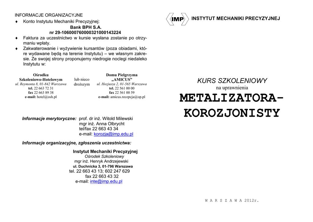 INFORMACJE ORGANIZACYJNE Konto Instytutu Mechaniki Precyzyjnej: Bank BPH S.A. nr 29-106000760000321000143224 Faktura za uczestnictwo w kursie wysłana zostanie po otrzymaniu wpłaty. Zakwaterowanie i wyżywienie kursantów (poza obiadami, które wydawane będą na terenie Instytutu) – we własnym zakresie. Ze swojej strony proponujemy niedrogie noclegi niedaleko Instytutu w: Ośrodku Szkoleniowo-Hotelowym ul. Reymonta 8, 01-842 Warszawa tel. 22 663 72 31 fax 22 663 89 38 e-mail: [email protected] lub nieco droższym Domu Pielgrzyma „AMICUS” ul. Hozjusza 2, 01-565 Warszawa tel. 22 561 00 00 fax 22 561 00 59 e-mail: [email protected] Informacje merytoryczne: prof. dr inż. Witold Milewski mgr inż. Anna Olbrycht tel/fax 22 663 43 34 e-mail: [email protected] INSTYTUT MECHANIKI PRECYZYJNEJ KURS SZKOLENIOWY na uprawnienia METALIZATORAKOROZJONISTY Informacje organizacyjne, zgłoszenia uczestnictwa: Instytut Mechaniki Precyzyjnej Ośrodek Szkoleniowy mgr inż. Henryk Andrzejewski ul. Duchnicka 3, 01-796 Warszawa tel. 22 663 43 13; 602 247 629 fax 22 663 43 32 e-mail: [email protected] W A R S Z A W A 2012r. Sposoby przeprowadzania szkolenia Instytut Mechaniki Precyzyjnej w Warszawie uprzejmie zaprasza na kursy szkoleniowe pozwalające uzyskać uprawnienia METALIZATORAKOROZJONISTY zgodnie z wymaganiami normy PN-EN ISO 14918 Instytut Mechaniki Precyzyjnej jest jedyną w kraju jednostką, która od 65 lat prowadzi szkolenia pracowników przemysłu umożliwiające uzyskanie uprawnień do uprawiania zawodu metalizatora lub instruktora metalizacji natryskowej. Obecnie w krajach Unii Europejskiej obowiązuje ścisła specjalizacja przewidziana normą PN-EN ISO 14918 uzależniona od rodzaju prac prowadzonych przy użyciu tej metody, przy czym zgodnie z wymaganiami obowiązującymi w UE zleceniodawcy coraz częściej wymagają od wykonawcy udokumentowania odpowiedniego wykształcenia i doświadczenia pracowników wykonujących zleconą pracę. Ponieważ obecnie obserwuje się duże zapotrzebowanie zgłaszane przez przedsiębiorstwa krajowe i zagraniczne na przeszkolonych operatorów sprzętu do natryskiwania cieplnego powłok antykorozyjnych, Instytut Mechaniki Precyzyjnej podejmuje szeroką akcję szkolenia metalizatorów - korozjonistów. Dla ułatwienia podjęcia szkolenia przez pracowników małych i średnich przedsiębiorstw proponujemy wybór jednego z dwóch sposobów przeprowadzenia szkolenia Sposób 1 – przewidziany dla małych (do 4 osób) grup szkoleniowych lub pracowników indywidualnych - szkolenie oparte jest na częściowym samokształceniu - pracodawca/kandydat przesyła do IMP zgłoszenie na udział w tym sposobie szkolenia - Instytut potwierdza to zgłoszenie, a pracodawca/kandydat wpłaca na konto IMP opłatę wstępną 500,- zł - Instytut w terminie 10 dni przesyła zgłaszającemu materiały szkoleniowe wraz z zestawem przewidzianych pytań podczas egzaminu teoretycznego - po przyswojeniu przez kandydata wiedzy podanej w materiałach szkoleniowych zgłasza on gotowość do podjęcia szkolenia praktycznego - Instytut w przeciągu 10 dni ustala z kandydatem termin szkolenia praktycznego, a on wpłaca na konto IMP dodatkowo 2000,- zł - szkolenie praktyczne odbywa się na terenie Instytutu i trwa 4 dni robocze. Obejmuje ono budowę i konserwację sprzętu oraz naukę praktycznej obsługi nowoczesnych pistoletów łukowych do natryskiwania cieplnego. Podczas tych 4 dni przewidzianych jest również 10h wykładów, podczas których zostaną omówione najważniejsze zagadnienia dotyczące technologii natryskiwania powłok antykorozyjnych. W razie konieczności istnieje możliwość przeprowadzenia szkolenia praktycznego w dwóch dwudniowych sesjach - ostatniego dnia zostaną przeprowadzone egzaminy praktyczny i teoretyczny zgodnie z normą PN-EN ISO 14918 i po ich pozytywnym wyniku wręczenie zaświadczeń do uprawiania zawodu metalizatora-korozjonisty Sposób 2 – przewidziany dla przedsiębiorstw zgłaszających potrzebę przeszkolenia większej liczby pracowników (powyżej 10 osób) - - szkolenie teoretyczne i praktyczne trwa 8 dni (4+4) lub 6 dni o przedłużonym czasie zajęć (w godz. 8-18) zleceniodawca zapewni salę wykładową, hale warsztatowe oraz sprzęt i materiały konieczne do przeprowadzenia ćwiczeń oraz zakwaterowanie dla 3 wykładowców. po uzgodnieniu terminu szkolenia i uzyskaniu niezbędnych szczegółów następuje podpisanie umowy i zleceniodawca wpłaca na konto IMP należność w wysokości 2000,- zł od szkolonej osoby. W ustalonym terminie zostanie przeprowadzone szkolenie według wymagań normy PN-EN ISO 14918 zakończone egzaminem praktycznym oraz teoretycznym i wydaniem zaświadczeń. Sposoby przeprowadzania szkolenia Instytut Mechaniki Precyzyjnej w Warszawie uprzejmie zaprasza na kursy szkoleniowe pozwalające uzyskać uprawnienia METALIZATORAKOROZJONISTY zgodnie z wymaganiami normy PN-EN ISO 14918 Instytut Mechaniki Precyzyjnej jest jedyną w kraju jednostką, która od 65 lat prowadzi szkolenia pracowników przemysłu umożliwiające uzyskanie uprawnień do uprawiania zawodu metalizatora lub instruktora metalizacji natryskowej. Obecnie w krajach Unii Europejskiej obowiązuje ścisła specjalizacja przewidziana normą PN-EN ISO 14918 uzależniona od rodzaju prac prowadzonych przy użyciu tej metody, przy czym zgodnie z wymaganiami obowiązującymi w UE zleceniodawcy coraz częściej wymagają od wykonawcy udokumentowania odpowiedniego wykształcenia i doświadczenia pracowników wykonujących zleconą pracę. Ponieważ obecnie obserwuje się duże zapotrzebowanie zgłaszane przez przedsiębiorstwa krajowe i zagraniczne na przeszkolonych operatorów sprzętu do natryskiwania cieplnego powłok antykorozyjnych, Instytut Mechaniki Precyzyjnej podejmuje szeroką akcję szkolenia metalizatorów - korozjonistów. Dla ułatwienia podjęcia szkolenia przez pracowników małych i średnich przedsiębiorstw proponujemy wybór jednego z dwóch sposobów
