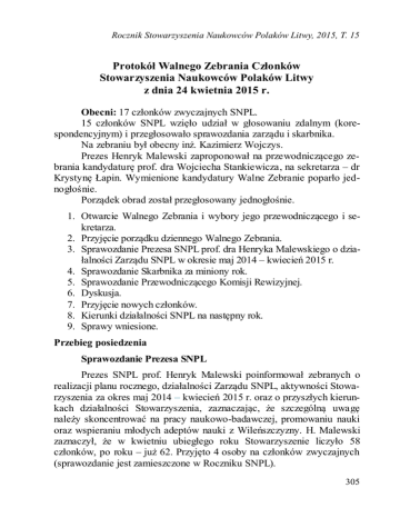 Rocznik Stowarzyszenia Naukowców Polaków Litwy, 2015, T. 15 Protokół Walnego Zebrania Członków Stowarzyszenia Naukowców Polaków Litwy z dnia 24 kwietnia 2015 r. Obecni: 17 członków zwyczajnych SNPL. 15 członków SNPL wzięło udział w głosowaniu zdalnym (korespondencyjnym) i przegłosowało sprawozdania zarządu i skarbnika. Na zebraniu był obecny inż. Kazimierz Wojczys. Prezes Henryk Malewski zaproponował na przewodniczącego zebrania kandydaturę prof. dra Wojciecha Stankiewicza, na sekretarza – dr Krystynę Łapin. Wymienione kandydatury Walne Zebranie poparło jednogłośnie. Porządek obrad został przegłosowany jednogłośnie. 1. Otwarcie Walnego Zebrania i wybory jego przewodniczącego i sekretarza. 2. Przyjęcie porządku dziennego Walnego Zebrania. 3. Sprawozdanie Prezesa SNPL prof. dra Henryka Malewskiego o działalności Zarządu SNPL w okresie maj 2014 – kwiecień 2015 r. 4. Sprawozdanie Skarbnika za miniony rok. 5. Sprawozdanie Przewodniczącego Komisji Rewizyjnej. 6. Dyskusja. 7. Przyjęcie nowych członków. 8. Kierunki działalności SNPL na następny rok. 9. Sprawy wniesione. Przebieg posiedzenia Sprawozdanie Prezesa SNPL Prezes SNPL prof. Henryk Malewski poinformował zebranych o realizacji planu rocznego, działalności Zarządu SNPL, aktywności Stowarzyszenia za okres maj 2014 – kwiecień 2015 r. oraz o przyszłych kierunkach działalności Stowarzyszenia, zaznaczając, że szczególną uwagę należy skoncentrować na pracy naukowo-badawczej, promowaniu nauki oraz wspieraniu młodych adeptów nauki z Wileńszczyzny. H. Malewski zaznaczył, że w kwietniu ubiegłego roku Stowarzyszenie liczyło 58 członków, po roku – już 62. Przyjęto 4 osoby na członków zwyczajnych (sprawozdanie jest zamieszczone w Roczniku SNPL). 305 Kronika SNPL Następnie przystąpiono do dyskusji nad sprawozdaniem prezesa. Prof. dr hab. R. Brazisa interesowała kwestia członkostwa SNPL w Europejskiej Federacji Polonijnych Stowarzyszeń Naukowo-Technicznych. H. Malewski stwierdził, że SNPL zostało przyjęte do tej organizacji jesienią 2014 roku i podtrzymuje regularne kontakty z Sekretariatem Generalnym EFPSNT, a także zaznaczył, że Stowarzyszenie otrzymało zaproszenie na spotkanie organizacji do Londynu, planowane jest majowe spotkanie z Przewodniczącym Rady Europy Donaldem Tuskiem, zaproszenie do udziału w konkursie Laur Innowacyjności, do NOT-u etc. Przewodniczący zebrania prof. dr W. Stankiewicz podziękował prezesowi prof. dr Henrykowi Malewskiemu za przygotowane sprawozdanie i poprosił o zabranie głosu skarbnika dr Katarzynę Mikszę. Sprawozdanie Skarbnika SNPL Skarbnik dr K. Miksza przedstawiła sprawozdanie o stanie finansowym SNPL. Stwierdziła, że działalność finansowa SNPL jest zgodna z ustawodawstwem litewskim oraz ze Statutem Stowarzyszenia. Wszystkie przychody i wydatki są udokumentowane (sprawozdanie jest zamieszczone w Roczniku SNPL). Pytań do skarbnika nie było. Sprawozdanie Przewodniczącego Komisji Rewizyjnej Przewodniczący Komisji Rewizyjnej prof. R. Burda poinformował, że Komisja Rewizyjna sprawdziła przychody i wydatki Stowarzyszenia, dokumentację finansową oraz obecnie posiadane środki i konstatuje, że żadnych uchybień nie stwierdzono oraz zaproponował zatwierdzić sprawozdanie skarbnika. Dyskusja Prof. Wojciech Stankiewicz poprosił uczestników zebrania nie tylko o aktywny udział w dyskusji, ale też o propozycje na rok następny oraz refleksje o roku minionym. Prof. dr hab. Romuald Brazis pozytywnie ocenił zmiany w Statucie, które służą poszerzeniu zakresu oddziaływania społecznego SNPL i pozyskiwaniu młodych członków Zaproponował kandydatów na członków honorowych: prof. Edwarda Szpilewskiego, prof. Zbigniewa Oziewicza. Zgłosił propozycję pozytywnej oceny działalności Zarządu oraz skarbnika, a także zatwierdzenia sprawozdania. Szereg osób poparło propozycję prof. Romualda Brazisa. 306 Rocznik Stowarzyszenia Naukowców Polaków Litwy, 2015, T. 15 Zatwierdzenie sprawozdań Przewodniczący zebrania poddał pod głosowanie sprawozdania Zarządu, skarbnika i Komisji Rewizyjnej. 1) W sprawie sprawozdania Zarządu wszyscy uczestnicy zebrania jednogłośnie głosowali „za”, tak jak i biorący udział w korespondencyjnym głosowaniu. W sumie 32 głosami sprawozdanie Zarządu SNPL zostało zatwierdzone. 2) W sprawie sprawozdania skarbnika SNPL i Komisji Rewizyjnej wszyscy uczestnicy zebrania jednogłośnie głosowali „za”, tak jak i biorący udział w korespondencyjnym głosowaniu. W sumie 32 głosami sprawozdania skarbnika SNPL oraz Komisji Rewizyjnej zostały zatwierdzone. Przyjęcie nowych członków Przewodniczący oznajmił, że nowych podań o wstąpieniu do stowarzyszenia w danym okresie nie było. Kierunki działalności na następny rok Prof. R. Brazis zaproponował zorganizowanie, jak i w roku ubiegłym, XIX konferencji „Nauka a jakość życia” z sympozjum SNPL. Przedstawił podstawowe założenia i tematykę konferencji, potencjalnych uczestników, miejsce i termin jej przeprowadzenia. Dr hab. Henryka Ilgiewicz zwróciła się do zebranych o przysyłanie do Rocznika nie tylko artykułów naukowych, lecz też recenzji i innych informacji, które będą zamieszczane w Kronice SNPL. Uczestnicy zebrania poparli propozycje i zobowiązali Zarząd SNPL do opracowania planu działania na rok następny. Propozycja została przyjęta przez aklamację. Gość zebrania walnego inż. Kazimierz Wojczys pozytywnie ocenił pracę Zarządu SNPL, wspomniał o początkach działalności Stowarzyszenia, a także opowiedział o swojej działalności naukowej i inżynierskiej w kraju i za granicą. Przewodniczący zebrania Sekretarz zebrania prof. dr Wojciech Stankiewicz dr Krystyna Moroz-Łapin 307