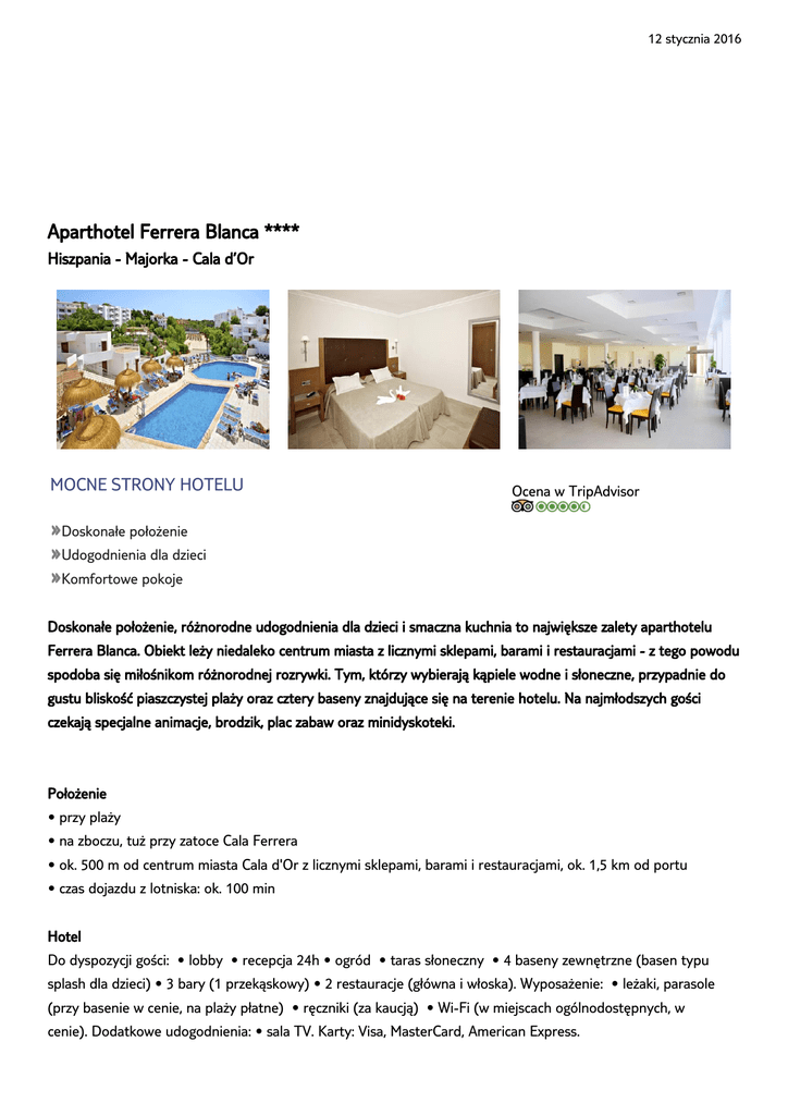 12 stycznia 2016 Aparthotel Ferrera Blanca **** Hiszpania - Majorka - Cala d’Or MOCNE STRONY HOTELU Ocena w TripAdvisor »Doskonałe położenie »Udogodnienia dla dzieci »Komfortowe pokoje Doskonałe położenie, różnorodne udogodnienia dla dzieci i smaczna kuchnia to największe zalety aparthotelu Ferrera Blanca. Obiekt leży niedaleko centrum miasta z licznymi sklepami, barami i restauracjami - z tego powodu spodoba się miłośnikom różnorodnej rozrywki. Tym, którzy wybierają kąpiele wodne i słoneczne, przypadnie do gustu bliskość piaszczystej plaży oraz cztery baseny znajdujące się na terenie hotelu. Na najmłodszych gości czekają specjalne animacje, brodzik, plac zabaw oraz minidyskoteki. Położenie • przy plaży • na zboczu, tuż przy zatoce Cala Ferrera • ok. 500 m od centrum miasta Cala d'Or z licznymi sklepami, barami i restauracjami, ok. 1,5 km od portu • czas dojazdu z lotniska: ok. 100 min Hotel Do dyspozycji gości: • lobby • recepcja 24h • ogród • taras słoneczny • 4 baseny zewnętrzne (basen typu splash dla dzieci) • 3 bary (1 przekąskowy) • 2 restauracje (główna i włoska). Wyposażenie: • leżaki, parasole (przy basenie w cenie, na plaży płatne) • ręczniki (za kaucją) • Wi-Fi (w miejscach ogólnodostępnych, w cenie). Dodatkowe udogodnienia: • sala TV. Karty: Visa, MasterCard, American Express. 0MG^FETSOSNÐ[183. Kategoria lokalna: 4 gwiazdki. Wyżywienie 2 posiłki: • śniadanie • obiad • posiłki w formie bufetu. All inclusive: • śniadanie • obiad • kolacja • posiłki w formie bufetu • napoje bezalkoholowe i lokalne napoje alkoholowe (11.00-23.00) • przekąski (11.00-18.00) • show cooking • lody dla dzieci (10.30-22.00) • kawa, herbata, ciastka (15.30-17.00). Sport i Wellness W cenie: • piłka nożna. Płatne: • tenis • wypożyczenie rowerów • sporty wodne (w ofercie lokalnych firm) • minigolf. Dla dzieci • specjalne animacje • brodzik • plac zabaw • minidyskoteki • menu dla dzieci • łóżeczka (na zapytanie, w cenie) • wysokie krzesełka Rozrywka • animacje wieczorne Pokoje Pokój 2-osobowy superior (DZX1): • 1-3 os. • ok. 30 m2 • umeblowany balkon • prysznic z hydromasażem • minibar • WC • klimatyzacja • TV sat. • tel. • suszarka do włosów • sejf (płatny). Suita (SUX1): • 2-4 os. • ok. 40 m2 • pokój dzienny • sypialnia • balkon • prysznic z hydromasażem • WC • klimatyzacja • TV sat. • tel. • sejf (płatny) • suszarka do włosów • minibar. Pokój ekonomiczny (DZZ1): Pokoje ekonomiczne to dobry wybór dla osób, którym zależy na pobycie w hotelu w najniższej możliwej cenie. Pokoje mogą różnić się wielkością, lokalizacją lub wyposażeniem od tych znajdujących się w regularnej ofercie danego obiektu. 2ie ma możliwości wymiany pokoju ekonomicznego na inny.