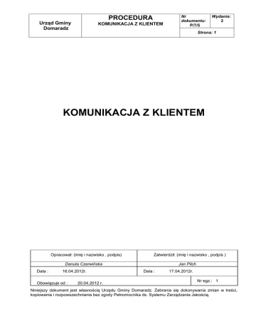 PROCEDURA Urząd Gminy Domaradz KOMUNIKACJA Z KLIENTEM Nr dokumentu: P/7/5 Wydanie: 2 Strona: 1 KOMUNIKACJA Z KLIENTEM Opracował: (imię i nazwisko , podpis) Zatwierdził: (imię i nazwisko , podpis ) Danuta Czerwińska Data : 16.04.2012r. Obowiązuje od : 20.04.2012 r. Jan Pilch Data : 17.04.2012r. Nr egz.: 1 Niniejszy dokument jest własnością Urzędu Gminy Domaradz. Zabrania się dokonywania zmian w treści, kopiowania i rozpowszechniania bez zgody Pełnomocnika ds. Systemu Zarządzania Jakością. PROCEDURA Urząd Gminy Domaradz KOMUNIKACJA Z KLIENTEM Nr dokumentu: P/7/5 Wydanie: 2 Strona: 2 1. CEL PROCEDURY Celem procedury jest zapewnienie sprawnej komunikacji z Klientami Urzędu oraz pomiar ich zadowolenia z poziomu świadczonych usług. 2. Podział odpowiedzialności Za całość działań objętych niniejszą procedurą odpowiada Wójt. Odpowiedzialność poszczególnych osób została określona w pkt 3 niniejszej procedury. 3. Opis sposobu postępowania Lp Osoba odpowiedzialn a Zadanie Komunikacja pośrednia 1 Sekretarz Pracownik odp. za obsługę sekretariatu Pracownik odp. za promocję, administrator systemu informat. 2 Pracownik ds. obsługi sekretariatu Sekretarz Przygotowuje informacje prasowe w ramach bieżących potrzeb Urzędu Gminy. Archiwizacja informacji następuje zgodnie z P/4/1 (Nadzór nad dokumentacją i zapisami). Opracowuje oraz aktualizuje w ramach bieżących potrzeb materiały informacyjne oraz informacje zawarte w BIP dotyczące funkcjonowania Urzędu, na podstawie informacji otrzymywanych od poszczególnych pracowników merytorycznych oraz kierowników jednostek organizacyjnych Gminy. Materiały te są dostępne dla Klientów w sekretariacie, oraz na stronie internetowej Gminy Domaradz W budynku Urzędu Gminy znajdują się następujące tablice informacyjne: A. informacje dla klientów dotyczące poszczególnych stanowisk pracy B. tablica z oznaczeniem nr pokoi zajmowanych przez poszczególne stanowiska pracy UG i jednostki organizacyjne mające siedzibę w budynku C. ogólna tablica informacyjna D. informacja o godzinach pracy urzędu (dostępna z zewnątrz budynku przy głównym wejściu) Aktualizacja informacji umieszczonych na tablicach dotyczących poszczególnych pracowników oraz informacji umieszczonych na pozostałych tablicach jest dokonywana przez wyznaczonego pracownika właściwego merytorycznie. Na tablicach informacyjnych budynków umieszczone są informacje dotyczące sposobu przyjmowania Klientów w sprawach skarg i wniosków. Każde pomieszczenie posiada oznaczenie zawierające: nazwę stanowiska 3 Sekretarz pracy wraz z imieniem i nazwiskiem pracownika. Komunikacja bezpośrednia Komunikacja bezpośrednia realizowana jest przez poszczególnych pracowników Urzędu podczas przyjmowania wniosków, podań itp. Udziela informacji dotyczących działalności Urzędu Gminy przedstawicielom 5 Wójt prasy lub innych mediów. Jest odpowiedzialny za organizację i zwoływanie konferencji prasowych. Skargi i wnioski Klientów 4 Wszyscy pracownicy Przyjmowanie Klientów w sprawach skarg i wniosków odbywa się zgodnie z przepisami Działu VIII Kodeksu postępowania administracyjnego oraz 6 zgodnie z zasadami określonymi w Regulaminie Organizacyjnym Urzędu Gminy Domaradz Pomiar zadowolenia Klienta Wójt, Sekretarz, Informacje dotyczące satysfakcji lub braku satysfakcji klienta są wskaźnikiem funkcjonowania systemu zarządzania jakością w Urzędzie. Na podstawie tego wskaźnika w sposób ciągły jest Zapis Urząd Gminy Domaradz PROCEDURA KOMUNIKACJA Z KLIENTEM Nr dokumentu: P/7/5 Wydanie: 2 Strona: 3 monitorowana skuteczność wdrożonego systemu zarządzania jakością i jakość obsługi klienta, pozwalająca wyeliminować i zapobiec przyczynom mogącym powodować złe funkcjonowanie systemu. Pełnomocnik ds. Systemu Opracowuje „Ankietę zadowolenia klienta” (F1), która pozwala określić na ile 7 Zarządzania klient jest zadowolony z oferowanych usług. Ankietę zatwierdza Wójt. Jakością Udostępniają Klientowi formularz ankiety, po załatwieniu sprawy oraz udzielają informacji co do sposobu jej wypełnienia oraz miejsca Wszyscy pozostawienia wypełnionych ankiet. Formularze ankiet dostępne są również 8 pracownicy na stronie www.domaradz.pl Wypełnione przez Klientów ankiety umieszczane są w specjalnie do tego celu przeznaczonych skrzynkach znajdujących się w budynku Urzędu Gminy. Przynajmniej 2 razy w roku, na początek każdego półrocza, po zwrocie ankiet/części ankiet przez Klientów, opracowuje „Protokół z badania Pełnomocnik zadowolenia Klienta” (F2), w którym jest zawarty m.in. sposób opracowania ds. Systemu zebranych danych oraz jeżeli istnieje taka potrzeba, uruchamia działania 9 Zarządzania zapobiegawcze lub przeprowadza audity w zagrożonych obszarach. Jakością Przynajmniej raz w roku dokonuje analizy ankiet. Jeżeli istnieje taka potrzeba uruchamia działania zapobiegawcze lub przeprowadza audity w obszarach zagrożonych. Analiza wyników komunikacji 10 Kierownictwo Podczas Przeglądu systemu zarządzania jakością na podstawie przygotowanych materiałów, w celu poprawy komunikacji z Klientami, dokonuje oceny funkcjonowania tego systemu, poprzez ustosunkowanie się do złożonych wniosków, analiz oraz działań korygujących i zapobiegawczych. 4. ZAŁĄCZNIKI - F1-P/7/5 – Ankieta zadowolenia klienta KONIEC F1 Urząd Gminy Domaradz PROCEDURA KOMUNIKACJA Z KLIENTEM Nr dokumentu: P/7/5 Wydanie: 2 Strona: 4 Ankieta oceny pracy urzędu i urzędnika (anonimowa) F-1 –P-7-5 Szanowni Państwo, opinie naszych interesantów o funkcjonowaniu Urzędu są bardzo ważnym źródłem informacji o zadowoleniu państwa z naszej pracy i posłużą do podnoszenia jej jakości. Uprzejmie proszę więc o uczestnictwo w ankiecie . Wójt Gminy Domaradz Jan Pilch Rodzaj sprawy załatwianej w Urzędzie: ……………………………………………………………………………………………