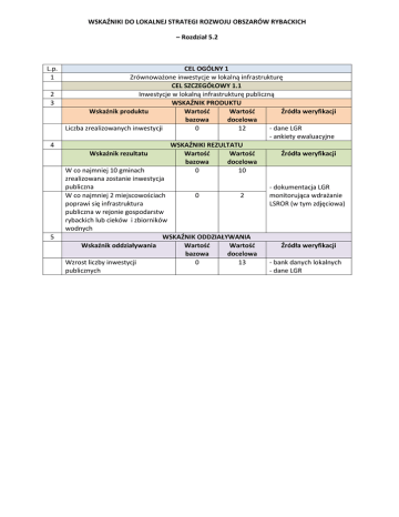 WSKAŹNIKI DO LOKALNEJ STRATEGI ROZWOJU OBSZARÓW RYBACKICH – Rozdział 5.2 L.p. 1 2 3 4 5 CEL OGÓLNY 1 Zrównoważone inwestycje w lokalną infrastrukturę CEL SZCZEGÓŁOWY 1.1 Inwestycje w lokalną infrastrukturę publiczną WSKAŹNIK PRODUKTU Wskaźnik produktu Wartość Wartość Źródła weryfikacji bazowa docelowa Liczba zrealizowanych inwestycji 0 12 - dane LGR - ankiety ewaluacyjne WSKAŹNIKI REZULTATU Wskaźnik rezultatu Wartość Wartość Źródła weryfikacji bazowa docelowa W co najmniej 10 gminach 0 10 zrealizowana zostanie inwestycja publiczna - dokumentacja LGR monitorująca wdrażanie W co najmniej 2 miejscowościach 0 2 LSROR (w tym zdjęciowa) poprawi się infrastruktura publiczna w rejonie gospodarstw rybackich lub cieków i zbiorników wodnych WSKAŹNIK ODDZIAŁYWANIA Wskaźnik oddziaływania Wartość Wartość Źródła weryfikacji bazowa docelowa Wzrost liczby inwestycji 0 13 - bank danych lokalnych publicznych - dane LGR L.p. 1 2 3 4 5 CEL OGÓLNY 1 Zrównoważone inwestycje w lokalną infrastrukturę CEL SZCZEGÓŁOWY 1.2 Rozwijanie bazy edukacyjnej i turystycznej WSKAŹNIK PRODUKTU Wskaźnik produktu Wartość Wartość Źródła weryfikacji bazowa docelowa Liczba obiektów 0 5 wyremontowanych Liczba obiektów spełniających 0 1 funkcje edukacyjne - dane LGR Liczba obiektów spełniających 0 1 funkcje rekreacyjno-turystyczne Liczba obiektów doposażonych w 0 5 niezbędny sprzęt WSKAŹNIKI REZULTATU Wskaźnik rezultatu Wartość Wartość Źródła weryfikacji bazowa docelowa - min. 5 obiektów 0 5 wyremontowanych w celu adaptacji do lepszego wykorzystania ich w konstruowaniu oferty spędzania wolnego czasu - min. 1 nowy obiekt spełniający 0 1 - dokumentacja LGR funkcje edukacyjne dla całego monitorująca wdrażanie obszaru LGR LSROR (w tym zdjęciowa) - min. 1 nowy obiekt spełniający 0 1 funkcje rekreacyjno - turystyczne dla całego obszaru LGR - min. 5 obiektów doposażonych w 0 5 niezbędny sprzęt WSKAŹNIK ODDZIAŁYWANIA Wskaźnik oddziaływania Wartość Wartość Źródła weryfikacji bazowa docelowa Wzrost liczby obiektów publicznych 0 13 - dane LGR pełniących funkcje edukacyjne, - bank danych lokalnych społeczno-kulturalne, sportowe i rekreacyjne L.p. 1 2 3 4 5 CEL OGÓLNY 1 Zrównoważone inwestycje w lokalną infrastrukturę CEL SZCZEGÓŁOWY 1.3 Poszerzenie oferty usług dla mieszkańców i gości WSKAŹNIK PRODUKTU Wskaźnik produktu Wartość Wartość Źródła weryfikacji bazowa docelowa Liczba podmiotów 0 15 uruchamiających działalność - dane LGR usługową Liczba nowych miejsc pracy 0 20 WSKAŹNIKI REZULTATU Wskaźnik rezultatu Wartość Wartość Źródła weryfikacji bazowa docelowa - min. 15 podmiotów uruchomi 0 15 albo rozwinie działalność usługową w zakresie wyżywienia, opieki - dokumentacja LGR zdrowotnej, handlu detalicznego, monitorująca wdrażanie rozrywki, edukacji, sportu i LSROR (w tym zdjęciowa) rekreacji - w sektorze usług powstanie min. 0 20 20 miejsc pracy dla mieszkańców obszaru WSKAŹNIK ODDZIAŁYWANIA Wskaźnik oddziaływania Wartość Wartość Źródła weryfikacji bazowa docelowa Wzrost liczby nowych miejsc pracy 0 23 w sektorze rybactwa i poza tym - bank danych lokalnych sektorem - dane LGR Wzrost liczby przedsiębiorstw na 0 16 obszarze działania LGR L.p. 1 2 3 4 5 CEL OGÓLNY 2 Wsparcie dla sektora rybackiego CEL SZCZEGÓŁOWY 2.1 Zwiększenie dochodowości ze sprzedaży tradycyjnych produktów rybactwa WSKAŹNIK PRODUKTU Wskaźnik produktu Wartość Wartość Źródła weryfikacji bazowa docelowa Liczba uczestnictw lokalnych 0 2 - dokumenty producentów ryb w targach potwierdzające uczestnictwo w Liczba zorganizowanych imprez 0 5 wydarzeniach związanych z popularyzacją branżowych (listy lokalnych produktów rybactwa obecności) - dane LGR Liczba utworzonych sprzedaży 0 2 - dane LGR bezpośrednich WSKAŹNIKI REZULTATU Wskaźnik rezultatu Wartość Wartość Źródła weryfikacji bazowa docelowa - uczestnictwo lokalnych 0 2 producentów ryb w min. 2 ogólnopolskich/ regionalnych targach - dokumentacja LGR - współorganizowanie na terenie 0 5 monitorująca wdrażanie LGR min. 5 imprez związanych z LSROR (w tym zdjęciowa) popularyzacją lokalnych produktów rybactwa z udziałem zaproszonych gości spoza obszaru i turystów Unowocześnienie sprzedaży 0 2 bezpośredniej WSKAŹNIK ODDZIAŁYWANIA Wskaźnik oddziaływania Wartość Wartość Źródła weryfikacji bazowa docelowa Wzrost liczby imprez na których 0 9 - dane LGR przedstawiane będą lokalne - bank danych lokalnych produkty rybactwa L.p. 1 2 3 4 5 CEL OGÓLNY 2 Wsparcie dla sektora rybackiego CEL SZCZEGÓŁOWY 2.2 Inwestycje melioracyjne dla zrównoważonego rozwoju rybactwa WSKAŹNIK PRODUKTU Wskaźnik produktu Wartość Wartość Źródła weryfikacji bazowa docelowa Liczba zrealizowanych inwestycji 0 3 - dane LGR WSKAŹNIKI REZULTATU Wskaźnik rezultatu Wartość Wartość Źródła weryfikacji bazowa docelowa Rekultywacja zbiorników wodnych 0 2 lub regulacja linii brzegowej – min. - dokumentacja LGR 2 inwestycje monitorująca wdrażanie Niwelowanie szkół powstałych w 0 1 LSROR (w tym zdjęciowa) wyniku powodzi, wystąpienie chorób ryb, działania szkodników rybackich WSKAŹNIK ODDZIAŁYWANIA Wskaźnik oddziaływania Wartość Wartość Źródła weryfikacji bazowa docelowa Wzrost liczby działań 0 4 - bank danych lokalnych poprawiających gospodarkę wodną - dane LGR L.p. 1 2 3 4 5 CEL OGÓLNY 2 Wsparcie dla sektora rybackiego CEL SZCZEGÓŁOWY 2.3 Poszerzenie oferty gospodarstw rybackich WSKAŹNIK PRODUKTU Wskaźnik produktu Wartość Wartość Źródła weryfikacji bazowa docelowa Liczba poprawionych i 0 2 poszerzonych działalności rybackich - dane LGR Liczba poszerzonych działalności 0 5 rybackich o dodatkowe działalności WSKAŹNIKI REZULTATU Wskaźnik rezultatu Wartość Wartość Źródła weryfikacji bazowa docelowa Poprawa warunków prowadzenia 0 2 i/lub poszerzenia dotychczasowej - dokumentac