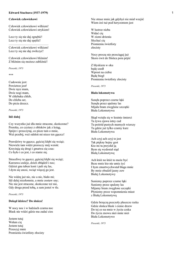 1 Edward Stachura (1937-1979) Człowiek człowiekowi Człowiek człowiekowi wilkiem! Człowiek człowiekowi strykiem! Lecz ty się nie daj zgnębić! Lecz ty się nie daj spętlić! ………………………………… Człowiek człowiekowi wilkiem! Lecz ty się nie daj zwilczyć! Człowiek człowiekowi bliźnim! Z bliźnim się możesz zabliźnić! Piosenki, 1973 *** Cudownie jest: Powietrze jest! Dwie ręce mam, Dwie nogi mam, W chlebaku chleb, Do chleba ser, Do picia deszcz. Piosenki, 1973 Idź dalej Czy wszystko już dla mnie stracone, skończone? Proroku, co czytasz z obłoków jak z ksiąg, Spójrz i przeczytaj, co pisze tam o mnie, Weź przebij, weź odsłoń mi nieco ten gąszcz! Prawdziwy to gąszcz, gęściej kłębi się wciąż; Niewiele tam widzi proroczy mój wzrok: Krzyżują się drogi i gmatwa się czas: Co było i co jest, i co stanie się. Straszliwy to gąszcz, gęściej kłębi się wciąż; Kurzawa szaleje, dzień zbłądził i noc; Gdzieś gna tabun koni i pali się las, I dym się unosi, wciąż więcej go jest. Nie widzę już nic, nic a nic, biało mi; Idź dalej niezłomnie, a mnie zostaw sny; Nic nie jest stracone, skończone też nie, Gdy droga przed tobą, a sam jesteś w tle. Piosenki, 1973 Dokąd idziesz? Do słońca! W nocy noc i w ludziach czarna noc Blask nie widzi gdzie ma zadać cios Jestem tutaj Wołam cię Jestem tutaj Przeszyj mnie Promieniu świetlisty złocisty Nie strasz mnie jak gdybyś nie miał wzejść Wiem żeś tuż pod horyzontem jest W lustrze nieba Widać cię W ziemi drżeniu Słychać cię Promieniu świetlisty złocisty Nocy proszę nie przeciągaj już Skoro świt do Słońca pora pójść Z błyskiem w oku będę szedł Wprost na ciebie Będę biegł Promieniu świetlisty złocisty Piosenki, 1973 Biała lokomotywa Sunęła poprzez czarne łąki Sunęła przez spalony las Mijała bram zwęglone szczątki Biała Lokomotywa Skąd wzięła się w krainie śmierci Ta żywa zjawa istny cud Tu pośród pustych marnych wierszy Tu gdzie już tylko czarny kurz Biała Lokomotywa Ach czyj ach czyj to jest Tak piękny hojny gest Kto mi tu przysłał ją Bym się wydostał stąd Białą Lokomotywę Ach któż no któż to może być Beze mnie kto nie umie żyć I bym zmartwychwstał błaga mnie By mnie obudził jasny zew Białej Lokomotywy Suniemy poprzez czarne łąki Suniemy przez spalony las Mijamy bram zwęglone szczątki Płyniemy przez wspomnienia miast z Białą Lokomotywą Gdzie brzęczą pszczoły pluszcze rzeka Gdzie słońca blask i cienie drzew Do tej co na mnie w życiu czeka Do życia znowu nieś mnie nieś Biała Lokomotywo Piosenki, 1973 2 Edward Stachura (1937-1979) Gloria Prefacja Chwała najsampierw komu Komu gloria na wysokościach Zaprawdę godnym i sprawiedliwym Słusznym i zbawiennym jest Śmieć się głośno Płakać cicho Deszcz ustaje sady kwitną I tego trzymać się trzeba Chwała najsampierw tobie Trawo przychylna każdemu Kraino na dół od Edenu Gloria! Gloria! Chwała teraz tobie, słońce Odyńcu ty samotny Co wstajesz rano z trzęsawisk nocnych I w górę bieżysz, w niebo sam się wzbijasz I chmury czarne białym kłem przebijasz I to wszystko bezkrwawo – brawo, brawo I to wszystko złociście, i nikogo nie boli Gloria! Gloria! Gloria in excelsis soli! Z słońcem pochwalonym teraz pędźmy razem Na nim, na odyńcu, galopujmy dalej Chwała teraz tobie, wietrze Wieczny młodziku Sieroto świata, ulubieńcze losu Od złego ratuj i kąkoli w zbożu Łagodnie kołysz tych co są na morzu Gloria! Gloria! Gloria in excelsis soli! Z wiatrem pochwalonym teraz pędźmy społem Na nim, na koniku, galopujmy polem Chwała wam ptaszki śpiewające Chwała wam ryby pluskające Chwała wam zające na łące Zakochane w biedronce Chwała wam: zimy wiosny lata i jesienie Chwała temu co bez gniewu idzie Poprzez śniegi deszcze blaski oraz cienie W piersi pod koszulą – całe jego mienie Gloria! Gloria! Gloria! Z cyklu (poematu): Missa pagana, 1978 Komunia I jeżeli spontaniczna to rzecz I jeżeli oczywista to rzecz I jeżeli naturalna to rzecz Weź To co się tu daje W imię słońca I jego gońca: Skowronka gwiżdżącego, amen Z cyklu (poematu): Missa pagana, 1978 Zaprawdę godnym i sprawiedliwym Słusznym i zbawiennym jest Iść i padać Z-padłych-wstawać Przeszła wojna Wstaje trawa I tego trzymać się trzeba Zaprawdę godnym i sprawiedliwym Słusznym i zbawiennym jest Śledzić gwiazdy Grać na skrzypcach Astronomia I muzyka I tego trzymać się trzeba Zaprawdę godnym i sprawiedliwym Słusznym i zbawiennym jest Być uważnym Pełnym pasji Dobra wasza Gwiżdżą ptaki I tego trzymać się trzeba Zaprawdę godnym i sprawiedliwym Słusznym i zbawiennym jest Żeby człowiek w życiu onym Sprawiedliwym Był i godnym Żeby człowiek Był człowiekiem Lecą liście Szumi w lesie Wiatr z obłoków Warkocz plecie I tego trzymać się trzeba Z cyklu (poematu): Missa pagana, 1978