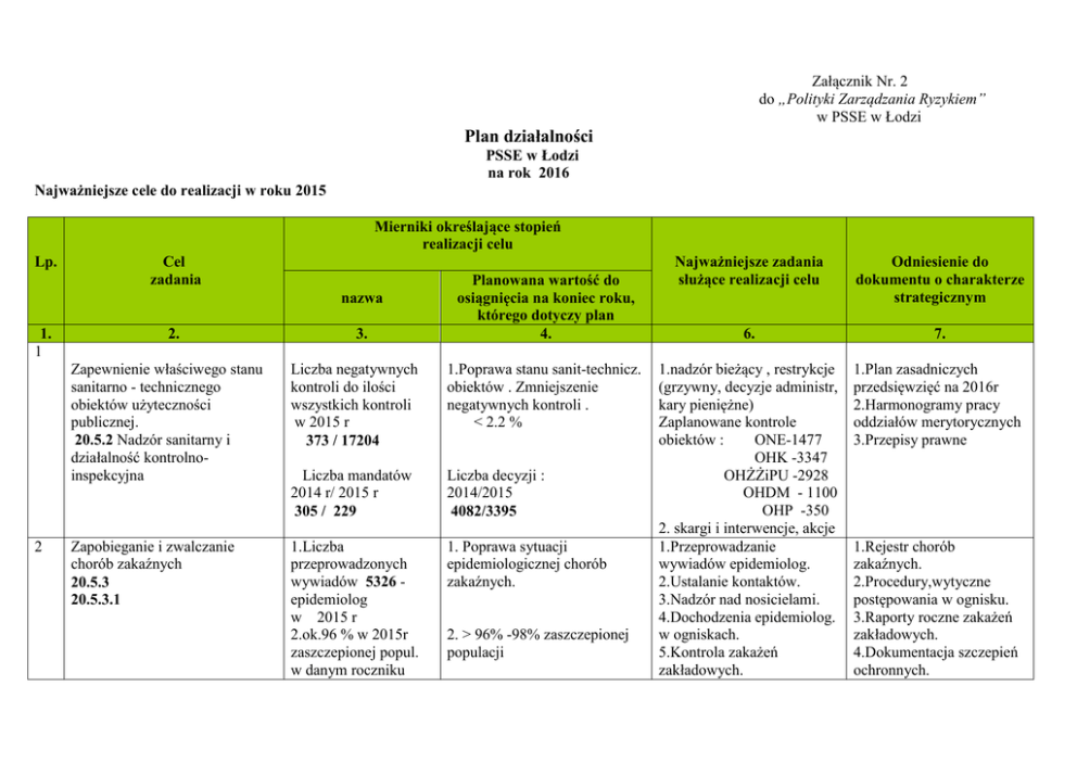 Załącznik Nr. 2 do „Polityki Zarządzania Ryzykiem” w PSSE w Łodzi Plan działalności PSSE w Łodzi na rok 2016 Najważniejsze cele do realizacji w roku 2015 Mierniki określające stopień realizacji celu Lp. Cel zadania nazwa 1. 1 2 2. 3. Planowana wartość do osiągnięcia na koniec roku, którego dotyczy plan 4. Zapewnienie właściwego stanu sanitarno - technicznego obiektów użyteczności publicznej. 20.5.2 Nadzór sanitarny i działalność kontrolnoinspekcyjna Liczba negatywnych kontroli do ilości wszystkich kontroli w 2015 r 373 / 17204 1.Poprawa stanu sanit-technicz. obiektów . Zmniejszenie negatywnych kontroli . < 2.2 % Liczba mandatów 2014 r/ 2015 r 305 / 229 Liczba decyzji : 2014/2015 4082/3395 Zapobieganie i zwalczanie chorób zakaźnych 20.5.3 20.5.3.1 1.Liczba przeprowadzonych wywiadów 5326 epidemiolog w 2015 r 2.ok.96 % w 2015r zaszczepionej popul. w danym roczniku 1. Poprawa sytuacji epidemiologicznej chorób zakaźnych. 2. > 96% -98% zaszczepionej populacji Najważniejsze zadania służące realizacji celu Odniesienie do dokumentu o charakterze strategicznym 6. 7. 1.nadzór bieżący , restrykcje (grzywny, decyzje administr, kary pieniężne) Zaplanowane kontrole obiektów : ONE-1477 OHK -3347 OHŻŻiPU -2928 OHDM - 1100 OHP -350 2. skargi i interwencje, akcje 1.Przeprowadzanie wywiadów epidemiolog. 2.Ustalanie kontaktów. 3.Nadzór nad nosicielami. 4.Dochodzenia epidemiolog. w ogniskach. 5.Kontrola zakażeń zakładowych. 1.Plan zasadniczych przedsięwzięć na 2016r 2.Harmonogramy pracy oddziałów merytorycznych 3.Przepisy prawne 1.Rejestr chorób zakaźnych. 2.Procedury,wytyczne postępowania w ognisku. 3.Raporty roczne zakażeń zakładowych. 4.Dokumentacja szczepień ochronnych. 3.liczba opornych środowisk 291- 2013r 242- 2014r 487 rodziców – 2015r 3.praca nad opornymi środowisk. uchylającymi się od szczepień ochr.zmniejszenie liczby nie zaszczepionych dzieci. 6.Wymazy czystościowe w podmiotach leczniczych. 7.Dystrybucja szczepionek 5.Program dystrybucji szczepionek. ESNDS 6.Przepisy prawne Interwencje Programowe GIS, Narodowy Program zdrowia , WHO Sytuacja epidemiologiczna chorób zakaźnych , Aktualne potrzeby społeczne. 3 Oświata Zdrowotna -Promocja Zdrowia i Profilaktyka 20.5.1 1.Liczba osób objęta programami zdrowotnymi lub uczestnicząca w akcjach prozdrowotnych w 2015r – 104 000 1. Objęcie programami większej liczby osób < 105 000 2.Dotarcie z programami profilaktycznymi do innych (oprócz wszyst. typów szkół ,przedszkoli) instytucji, stowarzyszeń, zrzeszeń, świetlic środowiskowych, klubów i największej liczby mieszkańców 2-ch powiatów. 1.Realizacja programów edukac-zdrowot. po przez: -warsztaty, akcje, zabawy, pogadanki , konkursy plastyczne, formy teatralne, festiwale, zawody, mitingi 2.Uczestniczenie czynne w ważnych wydarzeniach miasta, powiatu, gminy. 4 Zapobiegawczy nadzór sanitarnyInwestycyjny 20.5.2.3 1.Liczba spraw dotycz. nowych inwestycji 2015 r - 1148 2.liczba odbiorów budowlanych (z art. 56) i sanitarnych. w 2015 r - 491 Wyrażanie opinii na temat nowych obiektów ,modernizacji pomieszczeń ,modernizacji instalacyjnych, przekształceń w obiektach już istniejących; projektów, nowych inwestycji, wypowiadanie się co do raportów oddziaływania na środowisko nowych inwestycji PPIS nie ma wpływu na ilość nowych spraw inwestycyjnychtrudno zaplanować wartości do realizacji. 1.Uczestniczenie 1.Przepisy prawne pracowników ONZ w 2.Wytyczne GIS odbiorach i opiniowaniu do celów rejestracyjnych obiektów nadzorowanych przez HDM,ONE, OHŻŻiPU 2. Opiniowanie planów zagospodarowania przestrzennego i dokument.projektowej 3.Oceny oddziaływania na środowisko 5 Ochrona zdrowia przed szkodliwym wpływem czynników Środowiskowych 20.5.4 20.5.4.6 1.Liczba badań zakwestionowan. do wykonanych w 2015 r. dla Łodzi i Powiatu Łódzkiego Wsch. 536 / 20647 -2,5% 2,4% -2014 * PPIS ma pośredni wpływ na jakość wody. Istnieje możliwość zmniejszenia miernika < 7%. np. poprzez nadzór nad jakością instalacji wody ciepłej , urządzeń wodociągowych ,czy nadzór nad basenami. 6 Realizacja planu finansowego na 2015 r. 99,95% planu finansowego w 2015r. 7 Inwestycje w infrastrukturę i wyposażenie 2-ch budynków PSSE w Łodzi 1.Naprawy, remonty, modernizacje własnym sposobem gospodarczym. Wydatki ok. 58 197 tys.zł w 2015 r 100 % 1.Dalsza modernizacja nowej siedziby PSSE na ul. Pomorskiej 96 .-zmiana statusu na trwały zarząd ; pozyskanie funduszy na wymianę okien. 2.Kapitalny remont chłodni szczepionek 2.Cd.modernizacji archiwum 3.podjazd dla niepełnosprawnych 4.Naprawy bieżące . * (wzrost) badania w kierunku Legionelli w wodzie cieplej badania diagnostyczne SS u ludzi Łódź 29.01.2016 1. Badania laboratoryjne dostarczonych próbek przez próbkobiorców PSSE w Łodzi i innych powiatów. 2.Dyspozycyjność czasowa w sytuacjach awaryjnych. 3. Dyżury w razie potrzeb 1.Przepisy prawne. 2.Dokumentacja systemu zarządzania . 3. PN-EN ISO/IEC 17025:2005 1.Płynne funkcjonowanie 2-budynków powiatowej stacji (działalność laboratorium, mienie stacji) 2.Zabezpieczenie finansowe działań oddziałów merytorycznych. (materiały biur; transport ,bhp, media) 3.Zobowiązania,windykacja 1.Monitorowanie sprawy trwałego zarządu. 2. generalny remont chłodni szczepionek 5. malowanie ,uzupełnianie ubytków ,malowanie pokoi biurowych, korytarza, wymiana wykładzin podłogowych na korytarzu i sali konferencyjnej . Ustawa o PIS Ustawa o Finansach Publicz. Ustawa o rachunkowości Plan finansowy Przepisy BHP, Kodeks Pracy Przepisy dotyczące podmiotów leczniczych. Sporządził :Państwowy Powiatowy Inspektor Sanitarny w Łodzi Urszula Jędrzejczyk