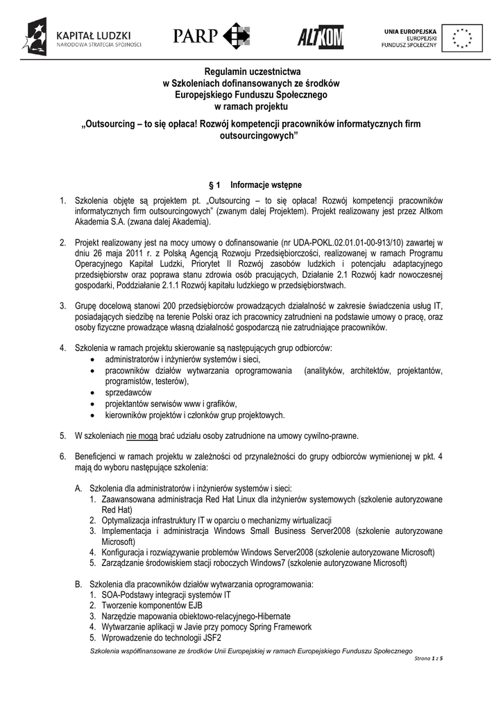 Regulamin uczestnictwa w Szkoleniach dofinansowanych ze środków Europejskiego Funduszu Społecznego w ramach projektu „Outsourcing – to się opłaca! Rozwój kompetencji pracowników informatycznych firm outsourcingowych” §1 Informacje wstępne 1. Szkolenia objęte są projektem pt. „Outsourcing – to się opłaca! Rozwój kompetencji pracowników informatycznych firm outsourcingowych” (zwanym dalej Projektem). Projekt realizowany jest przez Altkom Akademia S.A. (zwana dalej Akademią). 2. Projekt realizowany jest na mocy umowy o dofinansowanie (nr UDA-POKL.02.01.01-00-913/10) zawartej w dniu 26 maja 2011 r. z Polską Agencją Rozwoju Przedsiębiorczości, realizowanej w ramach Programu Operacyjnego Kapitał Ludzki, Priorytet II Rozwój zasobów ludzkich i potencjału adaptacyjnego przedsiębiorstw oraz poprawa stanu zdrowia osób pracujących, Działanie 2.1 Rozwój kadr nowoczesnej gospodarki, Poddziałanie 2.1.1 Rozwój kapitału ludzkiego w przedsiębiorstwach. 3. Grupę docelową stanowi 200 przedsiębiorców prowadzących działalność w zakresie świadczenia usług IT, posiadających siedzibę na terenie Polski oraz ich pracownicy zatrudnieni na podstawie umowy o pracę, oraz osoby fizyczne prowadzące własną działalność gospodarczą nie zatrudniające pracowników. 4. Szkolenia w ramach projektu skierowanie są następujących grup odbiorców: administratorów i inżynierów systemów i sieci, pracowników działów wytwarzania oprogramowania (analityków, architektów, projektantów, programistów, testerów), sprzedawców projektantów serwisów www i grafików, kierowników projektów i członków grup projektowych. 5. W szkoleniach nie mogą brać udziału osoby zatrudnione na umowy cywilno-prawne. 6. Beneficjenci w ramach projektu w zależności od przynależności do grupy odbiorców wymienionej w pkt. 4 mają do wyboru następujące szkolenia: A. Szkolenia dla administratorów i inżynierów systemów i sieci: 1. Zaawansowana administracja Red Hat Linux dla inżynierów systemowych (szkolenie autoryzowane Red Hat) 2. Optymalizacja infrastruktury IT w oparciu o mechanizmy wirtualizacji 3. Implementacja i administracja Windows Small Business Server2008 (szkolenie autoryzowane Microsoft) 4. Konfiguracja i rozwiązywanie problemów Windows Server2008 (szkolenie autoryzowane Microsoft) 5. Zarządzanie środowiskiem stacji roboczych Windows7 (szkolenie autoryzowane Microsoft) B. Szkolenia dla pracowników działów wytwarzania oprogramowania: 1. SOA-Podstawy integracji systemów IT 2. Tworzenie komponentów EJB 3. Narzędzie mapowania obiektowo-relacyjnego-Hibernate 4. Wytwarzanie aplikacji w Javie przy pomocy Spring Framework 5. Wprowadzenie do technologii JSF2 Szkolenia współfinansowane ze środków Unii Europejskiej w ramach Europejskiego Funduszu Społecznego Strona 1 z 5 C. Szkolenia dla projektantów serwisów www i grafików: 1. MYSQL-Bazy danych w serwisach internetowych 2. PHP-Tworzenie aplikacji internetowych 3. Adobe Photoshop-Obróbka cyfrowa zdjęć i publikowanie w Internecie 4. Adobe Flash-Dynamiczne elementy stron WWW 5. CMS+XHTML+CSS – najlepsza droga do profesjonalnego serwisu WWW D. Szkolenia dla kierowników projektów i członków grup projektowych: 1. MS Project-Harmonogramowanie i kontrola realizacji projektów 2. SharePoint-Organizacja portalu intranetowego i obiegu dokumentów 7. Szczegółowe programy szkoleń dostępne są na stronie www.altkom.pl. §2 Zgłoszenie 1. Wstępne zgłoszenie uczestnictwa w szkoleniach oferowanych przez Akademię odbywa się przez wypełnienie, podpisanie oraz przesłanie Karty Zgłoszenia. Dokument stanowi zbiór podstawowych informacji dotyczących Przedsiębiorcy oraz szkoleń będących przedmiotem jego zainteresowania oraz jest jednocześnie wnioskiem o przyznanie pomocy de minimis zgodnie Rozporządzeniem Ministra Rozwoju Regionalnego z dnia 15 grudnia 2010 r. w sprawie udzielania pomocy publicznej w ramach Programu Operacyjnego Kapitał Ludzki. 2. Karta Zgłoszenia powinna być podpisana przez osobę uprawnioną do reprezentowania przedsiębiorstwa. 3. Zgłoszenia można przesyłać do Akademii na trzy sposoby: a) za pośrednictwem strony internetowej (www.altkom.pl/outefs) wypełniając zamieszony na tej stronie formularz oraz załączając Kartę Zgłoszenia. b) pocztą elektroniczną w formie skanu Karty Zgłoszenia na adres na adres [email protected] c) w przypadku braku możliwości dokonania zgłoszenia poprzez stronę internetową oraz pocztą elektroniczną, należy Kartę Zgłoszenia przesłać faksem na numer 22 460 99 90 4. Przesłana Karta Zgłoszenia nie gwarantuje uczestnictwa w wybranym szkoleniu. §3 Rekrutacja 1. W przypadku przesłania poprawnie wypełnionej Karty Zgłoszenia i spełnieniu wymogów udziału w szkoleniach dokonywana jest analiza potrzeb szkoleniowych. 2. Na podstawie nadesłanych Kart Zgłoszenia stanowiących deklarację uczestnictwa Przedsiębiorcy w projekcie oraz na podstawie przeprowadzonej analizy potrzeb szkoleniowych dokonany zostanie wybór zgłoszeń. 3. W imieniu Akademii wyboru zgłoszeń, o którym mowa powyżej powołana w ramach projektu Komisja Rekrutacyjna, kierując się założeniami i celami projektu. 4. Akademia zastrzega sobie prawo zaproponowania innych warunków szkolenia, bądź odmowy przeprowadzenia szkolenia wskazanego w Karcie Zgłoszenia. 5. Informacja o kwalifikacji oraz warunkach przeprowadzania szkolenia zostanie przekazana Przedsiębiorcy pocztą elektroniczną (e-mail) na adres wskazany na Karcie Zgłoszenia lub, w przypadku braku powyższego, telefonicznie pod numer wskazany tamże. 6. Akademia zamyka nabór na dane szkolenia w terminie 15 dni przed planowanym rozpoczęciem danego szkolenia. Szkolenia współfinansowane ze środków Unii Europejskiej w ramach Europejskiego Funduszu Społecznego Strona 2 z 5 §4 Wysokość dofinansowania 1. Pomoc udzielana jest w formie pomocy de minimis na 100% wartości udzielonego wsparcia