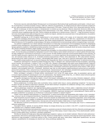 Szanowni Państwo „(…) Chłopcy, przestańcie, bo się źle bawicie! Dla was to jest igraszką, nam idzie o życie”. Biskup Ignacy Krasicki „Chłopcy i żaby” Pod koniec stycznia Jednostka Badań Klimatycznych na Uniwersytecie Wschodniej Anglii opublikowała wyniki badań, z których wynika, że temperatury na świecie przestały rosnąć w 1994 roku. Możemy się spodziewać, że nastąpi powrót do niskich temperatur podobnych do tych, jakie panowały podczas tak zwanej Małej Epoki Lodowcowej z XVII wieku. Trwała ona około 70 lat. Zamarzała wówczas Tamiza. Wyniki te wskazują, że trend wzrostowy w temperaturach na świecie już się zakończył. Obecnie aktywność słoneczna zbliża się do ,,wielkiego minimum”, po okresie nadzwyczajnej emisji obserwowanej w XX wieku. Zdaniem naukowców czekają nas ostrzejsze zimy i skrócenie okresu wegetatywnego dla roślin. Słońce znajduje się według nich w okresie szczytu „Cyklu 24” – z tego też powodu zorze polarne były dostrzegalne dużo dalej od biegunów niż to zwykle ma miejsce. Jednakże ów szczyt jest dużo mniej spektakularny niż podobne z wcześniejszych lat. Potwierdzają to badania NASA. Specjaliści spierają się, co do roli gazów cieplarnianych w tym procesie. Część z nich uważa, że ich obecność osłabi ochłodzenie spowodowane spadającą aktywnością słońca. Inni twierdzą, że brak wzrostu temperatur od 1994 roku i spodziewane ich obniżenie są dowodem na nieważność teorii globalnego ocieplenia, jako skutku ludzkiej działalności. Stawiałoby to pod znakiem zapytania ambitną politykę klimatyczną Unii Europejskiej, przyprawiającą o ból głowy przedstawicieli konwencjonalnego sektora energetycznego i przemysłu. Czy jednak te wątpliwości są w stanie wpłynąć rzeczywiście na zmianę tego zaczarowania Unii Europejskiej nieustannie potępiającej krytyków branży ekologicznej, uszczypliwie porównywanych do kreacjonistów i nazywanych „negacjonistami”? I to mimo tego, że związki łączące globalne ocieplenie z działalnością ludzką są bardzo mało widoczne, podobnie zresztą jak skutki tak bardzo drastycznych starań, aby obniżyć produkcję dwutlenku węgla wydając na to ogromne sumy. Fachowcy i eksperci polskiej Krajowej Izby Gospodarczej ostrzegają, że unijna polityka klimatyczna to zagrożenie dla polskiego przemysłu. Za trzy lata polscy przedsiębiorcy będą płacić rocznie 5 mld zł więcej z tytułu działań wdrożonych w ramach pakietu klimatycznego. W ciągu następnych 15 lat koszty te wzrosną do 13 mld zł rocznie. W wielu działach przemysłu wzrost kosztów będzie na tyle znaczący, że stanowić będzie poważne zagrożenie dla rentowności produkcji, a to oznacza zagrożenie dla prowadzenia tego rodzaju produkcji w Polsce. Jak wykazały analizy dotyczy to ok. 10 działów produkcji przemysłowej w Polsce, która odpowiada ok. 40% całej wartości dodanej, generowanej przez sektor przemysłu w Polsce i zatrudniającej 800 tysięcy ludzi, więc jest to ogromna potencjalna skala zagrożenia – wynika z badań przeprowadzonych na zlecenie Krajowej Izby Gospodarczej. Może to oznaczać likwidację nawet 10 sektorów przemysłu. Dodatkowe zobowiązania w dziedzinie polityki klimatycznej, które w ubiegłym roku zaproponowała Komisja Europejska, spowodują wzrost kosztów dla przemysłu o kolejne 9 mld zł od 2030 roku. Eksperci przestrzegają rząd polski przed podejmowaniem kolejnych zobowiązań. - Przewodniczący Komitetu ds. Pakietu Klimatyczno-Energetycznego Krajowej Izby Gospodarczej Herbert Leopold Gabryś surowo ocenia propozycje zawarte w unijnej Mapie Drogowej 2050, przewidujące zaostrzenia ograniczenia emisji średnio o 80% dla gospodarki, a dla energetyki około 90%. Powiedział: „Wzywamy rząd, aby na czas przyjęcia międzynarodowych porozumień po zaniknięciu porozumień protokołu z Kioto, wstrzymał się od nierozważnych, nieszacowanych, bez należytego uświadomienia społeczeństwa decyzji, które ze skutków politycznych przeniosą się na ogromne koszty dla przemysłu i dla społeczeństw.” Efekty wynikające z przyjęcia w Europie bardzo restrykcyjnych norm emisji CO2 będą zerowe, żeby nie powiedzieć ujemne, jeśli w innych krajach podobnych restrykcyjnych norm nie zastosowano. Tam będzie wzrost emisji CO2, a w efekcie utrata konkurencyjności europejskiego przemysłu i emigracji tego przemysłu poza granice Unii Europejskiej. Te sygnały ostrzegawcze zderzają się niejako z innymi informacjami wskazującymi jak silne są więzy interesów wiążących „zielony przemysł” czy „zielone lobby” z naukowcami, doradcami i instytutami, których stanowiska zależą od prawdziwości teorii spowodowanego przez człowieka globalnego ocieplenia. Można podejrzewać, że istnieje także wielu eurokratów, którzy znaleźli sobie niszę w „branży globalnego ocieplenia”. Ta nisza służy im także nie tylko do robienia znakomitych interesów, ale jest także świetnym narzędziem do osłabiania wolnego runku, zwiększania roli państwa, a także tworzenia tak wielu narzędzi korupcji. „Branża globalnego ocieplenia” jest najpotężniejszą gałęzią gospodarki XXI wieku. Al Gore, jeden z najbardziej znanych ekowojowników, przyznał niedawno, że jest partnerem w firmie, która zainwestowała ponad miliard dolarów w kampanię promującą eko-energię. A ilu lobbystów, polityków, biurokratów z Unii Europejskiej, UNESCO, organizacji ekologicznych i pozarządowych chętnie jeździ za pieniądze podatników na sympozja czy konferencje w luksusowych hotelach w ciepłych krajach? Często można napotkać hasła głoszące, że „inwestowanie” w zielone technologie ocali gospodarkę wielu krajów, w tym i amerykańską, i przyczyni się do zmniejszenia bezrobocia. Są jednak przykłady wskazujące na skutki, jakie są wynikiem realizacji takich poglądów. Rząd hiszpański przyznał oficjalnie, że „z