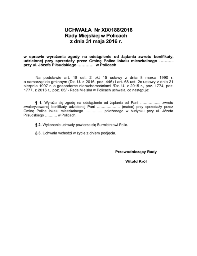 UCHWAŁA Nr XIX/188/2016 Rady Miejskiej w Policach z dnia 31 maja 2016 r. w sprawie wyrażenia zgody na odstąpienie od żądania zwrotu bonifikaty, udzielonej przy sprzedaży przez Gminę Police lokalu mieszkalnego ……….. przy ul. Józefa Piłsudskiego ………… w Policach Na podstawie art. 18 ust. 2 pkt 15 ustawy z dnia 8 marca 1990 r. o samorządzie gminnym (Dz. U. z 2016, poz. 446) i art. 68 ust. 2c ustawy z dnia 21 sierpnia 1997 r. o gospodarce nieruchomościami /Dz. U. z 2015 r., poz. 1774, poz. 1777, z 2016 r., poz. 65/ - Rada Miejska w Policach uchwala, co następuje: § 1. Wyraża się zgodę na odstąpienie od żądania od Pani …………….. zwrotu zwaloryzowanej bonifikaty udzielonej Pani ………………. (matce) przy sprzedaży przez Gminę Police lokalu mieszkalnego ………….. położonego w budynku przy ul. Józefa Piłsudskiego ………. w Policach. § 2. Wykonanie uchwały powierza się Burmistrzowi Polic. § 3. Uchwała wchodzi w życie z dniem podjęcia. Przewodniczący Rady Witold Król Uzasadnienie Projekt niniejszej uchwały przedkłada Burmistrz Polic. W dniu 04-03-2011 r. Gmina Police sprzedała na rzecz pani ………… (wówczas ………) lokal mieszkalny o pow. 31,80 m2, położony przy ul. Józefa Piłsudskiego ……. w Policach, udzielając jej bonifikaty od ceny zbycia w kwocie 63.312,12 zł. Przedmiotowy lokal został następnie przekazany w dniu 01-09-2014 r. umową darowizny na rzecz córki, pani …………. . W dniu 04-11-2014 r. pani ………………. sprzedała to mieszkanie osobie trzeciej za kwotę 130.000,00 zł. Środki uzyskane ze sprzedaży mieszkalnia pani ……… (wraz z mężem) w całości przeznaczyła na zakup nowego mieszkania o pow. 66,11 m2, znajdującego się przy ul. Robotniczej ……. w Policach. Zakup nowego mieszkania miał miejsce dnia 01-12-2014 r. a cena zakupu wyniosła 240.000,00 zł. W związku ze zbyciem przez panią ……. lokalu przy ul. Józefa Piłsudskiego ……, na zakup którego jej matka uzyskała wcześniej od Gminy Police bonifikatę, Gmina zwróciła się do pani ……… z żądaniem zwrotu udzielonej bonifikaty po jej waloryzacji w kwocie 66.542,73 zł. W ustawie o gospodarce nieruchomościami Ustawodawca wprowadził przepisy chroniące przed praktykami wykorzystywania preferencyjnych warunków nabycia mieszkania w celu osiągnięcia osobistego zysku. Jednym z nich jest zapis art. 68 ust. 2 mówiący o tym, że osoba, która nabyła lokal mieszkalny zakupiony wcześniej od gminy przy zastosowaniu bonifikaty, a następnie zbyła go przed upływem 5 lat licząc od daty pierwotnego nabycia, jest zobowiązana do zwrotu kwoty równej udzielonej bonifikacie po jej waloryzacji. Jednocześnie w art. 68 ust. 2a sprecyzowano wyjątki od ogólnej zasady dotyczącej zwrotu bonifikaty zawartej w art. 68 ust. 2. Jednym z tych wyjątków, pozwalających na uniknięcie zwrotu bonifikaty jest sprzedaż lokalu mieszkalnego nabytego uprzednio od Gminy i przeznaczenie uzyskanych z jego sprzedaży środków finansowych, w ciągu 12 miesięcy od zbycia, na nabycie innej nieruchomości lokalowej przeznaczonej lub wykorzystanej na cele mieszkaniowe (art. 68 ust. 2a pkt 5). Pani ………. była świadoma tego zapisu i dochowała jego postanowień, przeznaczając środki ze sprzedaży jednego mieszkania na zakup drugiego po upływie 1 miesiąca. Jednakże Gmina Police zastosowała w tym przypadku wykładnię, według której wyłączenia w art. 68 ust. 2a pkt 5 nie stosuje się do osoby bliskiej, a jedynie do pierwotnego nabywcy mieszkania, wysuwając w konsekwencji żądanie zwrotu bonifikaty uzyskanej przez matkę pani ……….. . Kwestia żądania zwrotu bonifikaty w tego typu przypadkach była w ostatnich latach przedmiotem rozlicznych postępowań, budząc przy okazji wiele kontrowersji. Wspomniane przepisy zostały bowiem skonstruowane w taki sposób, że bardzo łatwo można odnieść wrażenie, że wachlarz wyłączeń zawartych w art. 68 ust. 2a stosuje się także do osób bliskich, tym bardziej, że ustęp 2b tegoż artykułu stwierdza: „Przepis ust. 2 stosuje się odpowiednio do osoby bliskiej, która zbyła lub wykorzystała nieruchomość na inne cele uzasadniające udzielenie bonifikaty, przed upływem 10 lat, a w przypadku nieruchomości stanowiącej lokal mieszkalny przed upływem 5 lat, licząc od dnia pierwotnego nabycia.” Przepisem tym kierowało się wiele osób, które nabrało przekonania, że wyłączenia zawarte w art. 68 ust. 2a dotyczą także ich, jako osób bliskich wobec pierwotnych nabywców. Niemniej jednak na skutek kilku wyroków w tego typu sprawach zaczęło dominować orzecznictwo, według którego wspomniane wyłączenia dotyczą tylko pierwotnych nabywców, ponieważ z art. 68 ust. 2b wynika nakaz odpowiedniego stosowania wyłącznie art. 68 ust. 2, a nie także art. 68 ust. 2a. W rezultacie osoby, które w dobrej wierze podeszły do obowiązków wynikających z ustawy stanęły w obliczu żądań zwrotu bonifikaty uzyskanej przez pierwotnych nabywców. Jednocześnie ustawodawca, mając na uwadze możliwość wystąpienia w praktyce bardzo różnorodnych sytuacji, których nie sposób przewidzieć w przepisach ustawy, dał właściwym organom możliwość indywidualnej oceny każdej sytuacji i podejmowania decyzji o sposobie jej rozwiązywania, na podstawie art. 68 ust. 2c ustawy o gospodarce nieruchomościami. Zapis ten stanowi, że: „Właściwy organ może odstąpić od żądania zwrotu udzielonej bonifikaty, w innych przypadkach, niż określone w ust. 2a, za zgodą odpowiednio wojewody, rady lub sejmiku.” Zgodnie z tym zapisem Rada Miejska w Policach może odstąpić od żądania zwrotu udzielonej bonifikaty, również w innych przypadkach niż określone w art. 68 ust. 2a. Podjęcie takiej decyzji wobec pani …………………………. jest uzasadnione. Pani ……….. wykorzystała środki uzyskane ze sprzedaży lokalu mieszkalnego (nabytego przez
