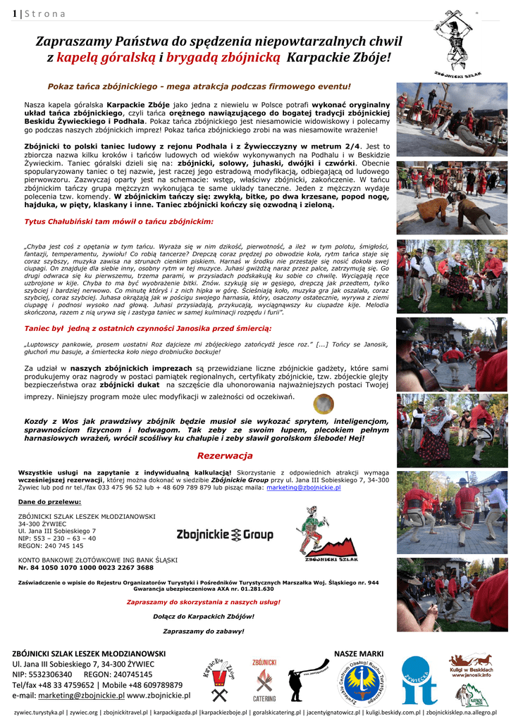 1|Strona Zapraszamy Państwa do spędzenia niepowtarzalnych chwil z kapelą góralską i brygadą zbójnicką Karpackie Zbóje! Pokaz tańca zbójnickiego - mega atrakcja podczas firmowego eventu! Nasza kapela góralska Karpackie Zbóje jako jedna z niewielu w Polsce potrafi wykonać oryginalny układ tańca zbójnickiego, czyli tańca orężnego nawiązującego do bogatej tradycji zbójnickiej Beskidu Żywieckiego i Podhala. Pokaz tańca zbójnickiego jest niesamowicie widowiskowy i polecamy go podczas naszych zbójnickich imprez! Pokaz tańca zbójnickiego zrobi na was niesamowite wrażenie! Zbójnicki to polski taniec ludowy z rejonu Podhala i z Żywiecczyzny w metrum 2/4. Jest to zbiorcza nazwa kilku kroków i tańców ludowych od wieków wykonywanych na Podhalu i w Beskidzie Żywieckim. Taniec góralski dzieli się na: zbójnicki, solowy, juhaski, dwójki i czwórki. Obecnie spopularyzowany taniec o tej nazwie, jest raczej jego estradową modyfikacją, odbiegającą od ludowego pierwowzoru. Zazwyczaj oparty jest na schemacie: wstęp, właściwy zbójnicki, zakończenie. W tańcu zbójnickim tańczy grupa mężczyzn wykonująca te same układy taneczne. Jeden z mężczyzn wydaje polecenia tzw. komendy. W zbójnickim tańczy się: zwykłą, bitke, po dwa krzesane, popod nogę, hajduka, w pięty, klaskany i inne. Taniec zbójnicki kończy się ozwodną i zieloną. Tytus Chałubiński tam mówił o tańcu zbójnickim: „Chyba jest coś z opętania w tym tańcu. Wyraża się w nim dzikość, pierwotność, a ileż w tym polotu, śmigłości, fantazji, temperamentu, żywiołu! Co robią tancerze? Drepczą coraz prędzej po obwodzie koła, rytm tańca staje się coraz szybszy, muzyka zawisa na strunach cienkim piskiem. Harnaś w środku nie przestaje się nosić dokoła swej ciupagi. On znajduje dla siebie inny, osobny rytm w tej muzyce. Juhasi gwiżdżą naraz przez palce, zatrzymują się. Go drugi odwraca się ku pierwszemu, trzema parami, w przysiadach podskakują ku sobie co chwilę. Wyciągają ręce uzbrojone w kije. Chyba to ma być wyobrażenie bitki. Znów. szykują się w gęsiego, drepczą jak przedtem, tylko szybciej i bardziej nerwowo. Co minutę któryś i z nich hipka w górę. Ścieśniają koło, muzyka gra jak oszalała, coraz szybciej, coraz szybciej. Juhasa okrążają jak w pościgu swojego harnasia, który, osaczony ostatecznie, wyrywa z ziemi ciupagę i podnosi wysoko nad głową. Juhasi przysiadają, przykucają, wyciągnąwszy ku ciupadze kije. Melodia skończona, razem z nią urywa się i zastyga taniec w samej kulminacji rozpędu i furii”. Taniec był jedną z ostatnich czynności Janosika przed śmiercią: „Luptowscy pankowie, prosem uostatni Roz dajcieze mi zbójeckiego zatońcydź jesce roz.” [...] Tońcy se Janosik, głuchoń mu basuje, a śmiertecka koło niego drobniućko bockuje! Za udział w naszych zbójnickich imprezach są przewidziane liczne zbójnickie gadżety, które sami produkujemy oraz nagrody w postaci pamiątek regionalnych, certyfikaty zbójnickie, tzw. zbójeckie glejty bezpieczeństwa oraz zbójnicki dukat na szczęście dla uhonorowania najważniejszych postaci Twojej imprezy. Niniejszy program może ulec modyfikacji w zależności od oczekiwań. Kozdy z Wos jak prawdziwy zbójnik będzie musioł sie wykozać sprytem, inteligencjom, sprawnościom fizycnom i łodwagom. Tak zeby ze swoim łupem, plecokiem pełnym harnasiowych wrażeń, wrócił scośliwy ku chałupie i zeby sławił gorolskom ślebode! Hej! Rezerwacja Wszystkie usługi na zapytanie z indywidualną kalkulacją! Skorzystanie z odpowiednich atrakcji wymaga wcześniejszej rezerwacji, której można dokonać w siedzibie Zbójnickie Group przy ul. Jana III Sobieskiego 7, 34-300 Żywiec lub pod nr tel./fax 033 475 96 52 lub + 48 609 789 879 lub pisząc maila: [email protected] Dane do przelewu: ZBÓJNICKI SZLAK LESZEK MŁODZIANOWSKI 34-300 ŻYWIEC Ul. Jana III Sobieskiego 7 NIP: 553 – 230 – 63 – 40 REGON: 240 745 145 KONTO BANKOWE ZŁOTÓWKOWE ING BANK ŚLĄSKI Nr. 84 1050 1070 1000 0023 2267 3688 Zaświadczenie o wpisie do Rejestru Organizatorów Turystyki i Pośredników Turystycznych Marszałka Woj. Śląskiego nr. 944 Gwarancja ubezpieczeniowa AXA nr. 01.281.630 Zapraszamy do skorzystania z naszych usług! Dołącz do Karpackich Zbójów! Zapraszamy do zabawy! ZBÓJNICKI SZLAK LESZEK MŁODZIANOWSKI Ul. Jana III Sobieskiego 7, 34-300 ŻYWIEC NIP: 5532306340 REGON: 240745145 Tel/fax +48 33 4759652 | Mobile +48 609789879 e-mail: [email protected] www.zbojnickie.pl NASZE MARKI zywiec.turystyka.pl | zywiec.org | zbojnickitravel.pl | karpackigazda.pl |karpackiezboje.pl | goralskicatering.pl | jacentyignatowicz.pl | kuligi.beskidy.com.pl | zbojnickisklep.na.allegro.pl