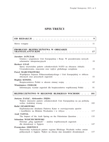 Przegl¹d Strategiczny 2015, nr 8 SPIS TREŒCI OD REDAKCJI . . S³owo wstêpne . . . . . . . . . . . . . . . . . . . . . . . . . . . . 9 . . . . . . . . . . . 11 PROBLEMY BEZPIECZEÑSTWA W OBSZARZE TRANSATLANTYCKIM . . . . . . . . . . . . . . . . 17 Jaros³aw JAÑCZAK Granica i pogranicze Unii Europejskiej i Rosji. W poszukiwaniu nowych schematów interpretacyjnych . . . . . . . . . . . . . . . . 19 Herbert GNAŒ Spory terytorialne pañstw cz³onkowskich NATO na obszarze Arktyki. Uwarunkowania, znaczenie oraz wp³yw globalnego ocieplenia . . . . 33 Pawe³ MARCINKOWSKI Wspó³praca Sojuszu Pó³nocnoatlantyckiego i Unii Europejskiej w obliczu obecnych oraz przysz³ych zagro¿eñ . . . . . . . . . . . . . 53 Bogdan KOSZEL Bezpieczeñstwo Polski w okresie zimnej wojny 65 . . . . . . . . . W³odzimierz FEHLER Informacyjny wymiar zagro¿eñ dla bezpieczeñstwa wspó³czesnej Polski . . 81 BEZPIECZEÑSTWO W REGIONIE BLISKIEGO WSCHODU . . . 101 Justyna ZAJ¥C, Aleksandra ZIÊBA Wp³yw interesów pañstw cz³onkowskich Unii Europejskiej na jej politykê wobec Arabskiej wiosny . . . . . . . . . . . . . . . . . 103 Rafa³ O¯AROWSKI Dyplomatyczne dzia³ania Pañstwa Katar w rozwi¹zywaniu sporów i konfliktów na Bliskim Wschodzie i w Afryce . . . . . . . . . 117 Asad TAFFAL The Impact of the Arab Spring on the Palestinian Question . . . . . 135 Sebastian WOJCIECHOWSKI Dziesiêæ „plag egipskich” – analiza wspó³czesnych zagro¿eñ dla demokracji w Egipcie . . . . . . . . . . . . . . . . 147 Przemys³aw OSIEWICZ Stanowiska wybranych pañstw regionu Bliskiego Wschodu wobec zmian politycznych w Egipcie. Wp³yw na obecny stan stosunków dwustronnych . . 157 4 Spis treœci Ronnie AZOULAY The Power of Ideas. The Influence of Hassan Al-Banna and Sayyid Qutb on the Muslim Brotherhood Organization . . . . . . . . . 171 Marcin STYSZYÑSKI Wp³yw Arabskiej wiosny na spontaniczn¹ twórczoœæ literack¹ m³odego pokolenia w Egipcie . . . . . . . . . . . . . . . . . . 183 Maciej KARCZEWSKI Od Surge do pañstwa islamskiego. Przyczyny i uwarunkowania destabilizacji Iraku po 2011 roku . . . . . . . . . . . . . . 195 Adam GWIAZDA Niepewna normalizacja stosunków polityczno-gospodarczych Iranu z Zachodem . . . . . . . . . . . . . . . . . . . . . 211 Mordechai LEVY Iran in the Minds of the Israelis 225 . . . . . . . . . . . . . . BEZPIECZEÑSTWO SPO£ECZNO-EKONOMICZNE . . . . . 247 Marek REWIZORSKI Z powrotem do debaty neo-neo. Dwa spojrzenia na bezpieczeñstwo energetyczne . . . . . . . . . . . . . . . . . . . . . 249 Maciej MAGIERA Rola case study w zarz¹dzaniu kryzysowym w obliczu modelowania . . 267 Filip KACZMAREK Stanowisko Unii Europejskiej wobec nowej agendy rozwojowej Post 2015 . . . . . . . . . . . . . . . . . . . . . . 279 Miros³aw SKAR¯YÑSKI Bezpieczeñstwo surowcowe w zakresie ziarna kakaowego a sytuacja polityczna na Wybrze¿u Koœci S³oniowej . . . . . . . . . . . 293 BEZPIECZEÑSTWO LUDZKIE . . . . . . . . . . . 307 Christian Guillermet FERNANDEZ, David Fernández PUYANA Envisioning the „Right to Life and Enjoy Peace, Human Rights and Development” Within the Human Rigths Council . . . . . . . 309 Fuad JOMMA Ludobójstwo w irackim Kurdystanie w latach 80. XX wieku i jego umiêdzynarodowienie . . . . . . . . . . . . . . . . . . 329 Paulina WARCHO£ Zmiany demograficzne jako zagro¿enie dla bezpieczeñstwa. Analiza na przyk³adzie Japonii . . . . . . . . . . . . . . . 345 PRZEGL¥D ANALIZ Z ZAKRESU BEZPIECZEÑSTWA I STUDIÓW STRATEGICZNYCH . . . . . . . . . . . . 361 Rafa³ WIŒNIEWISKI Polskie analizy strategiczne – przegl¹d 2014 roku 363 . . . . . . . . . . 5 Spis treœci Maciej MAGIERA SIPRI Yearbook 2014 . . . . . OPRACOWANIA I MATERIA£Y . . . . . . . . . . . . . . 379 . . . . . . . . . . . 385 Henryk RACZKOWSKI The OSCE Border Management Staff College Marcin £UKASZEWSKI Stosunki francusko-andorskich w dwudziestolecie o dobrym s¹siedztwie, przyjaŸni i wspó³pracy . Fikri ALOGAIL The Houthi Movement (Ansar Allah) Facing the . . . . . . . . . 387 podpisania Traktatu . . . . . . . . . 399 Coalition Forces . . 415 . . . . . . . . . . . 431 National Visions of EU Defence Policy – common denominators and misunderstandings, eds. Federico Santopinto, Megan Price (Pawe³ MARCINKOWSKI) . . . . . . . . . . . . . . . . 433 Bezpieczeñstwo Polski. Wspó³czesne wyzwania, red. Sebastian Wojciechowski, Anna Potyra³a (Maciej MAGIERA) . . . . . . . . . . . . . 437 Tomasz R. Aleksandrowicz, Œwiat w sieci. Pañstwa, spo³eczeñstwa, ludzie. W poszukiwaniu nowego paradygmatu bezpieczeñstwa narodowego (Aleksandra GOLUS) . . . . . . . . . . . . . . . . . . 441 Daisuke Akimoto, Japan As a ‘Global Pacifist State’: Its Changing Pacifism and Security Identity (Paulina WARCHO£) . . . . . . . . . . 443 Agnieszka Bryc, Izrael 2020 skazany na potêgê? (Patryk JÊDROWIAK) . 447 Przegl¹d Bezpieczeñstwa Wewnêtrznego. Wydanie specjalne – s³u¿by wschodnie (Maciej KLUCZYÑSKI) . . . . . . . . . . . . . . . . . 450 NOTY O AUTORACH RECENZJE . . . . . . . . . . . . . . . . . . . . . . . . . . . 455 INSTRUKCJE DLA AUTORÓW . . . 461 . . . . . . . . . .