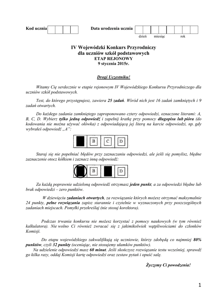Kod ucznia Data urodzenia ucznia dzień miesiąc rok IV Wojewódzki Konkurs Przyrodniczy dla uczniów szkół podstawowych ETAP REJONOWY 9 stycznia 2015r. Drogi Uczestniku! Witamy Cię serdecznie w etapie rejonowym IV Wojewódzkiego Konkursu Przyrodniczego dla uczniów szkół podstawowych. Test, do którego przystępujesz, zawiera 25 zadań. Wśród nich jest 16 zadań zamkniętych i 9 zadań otwartych. Do każdego zadania zamkniętego zaproponowano cztery odpowiedzi, oznaczone literami: A, B, C, D. Wybierz tylko jedną odpowiedź i zapełnij kratkę przy pomocy długopisu lub pióra (do kodowania nie można używać ołówka) z odpowiadającą jej literą na karcie odpowiedzi, np. gdy wybrałeś odpowiedź „A”: Staraj się nie popełniać błędów przy zaznaczaniu odpowiedzi, ale jeśli się pomylisz, błędne zaznaczenie otocz kółkiem i zaznacz inną odpowiedź: Za każdą poprawnie udzieloną odpowiedź otrzymasz jeden punkt, a za odpowiedzi błędne lub brak odpowiedzi – zero punktów. W dziewięciu zadaniach otwartych, za rozwiązanie których możesz otrzymać maksymalnie 24 punkty, pełne rozwiązania zapisz starannie i czytelnie w wyznaczonych przy poszczególnych zadaniach miejscach. Pomyłki przekreślaj (nie stosuj korektora). Podczas trwania konkursu nie możesz korzystać z pomocy naukowych (w tym również kalkulatora). Nie wolno Ci również zwracać się z jakimikolwiek wątpliwościami do członków Komisji. Do etapu wojewódzkiego zakwalifikują się uczniowie, którzy zdobędą co najmniej 80% punktów, czyli 32 punkty (oceniając, nie stosujemy ułamków punktów). Na udzielenie odpowiedzi masz 60 minut. Jeśli skończysz rozwiązanie testu wcześniej, sprawdź go kilka razy, oddaj Komisji kartę odpowiedzi oraz zestaw pytań i opuść salę. Życzymy Ci powodzenia! 1 Zadanie 1. (1 pkt) Który z wymienionych czynników nie wpływa na przebieg procesu fotosyntezy: A. natężenie światła B. stężenie dwutlenku węgla C. stężenie tlenu D. temperatura otoczenia Zadanie 2. (1 pkt) Zaznacz obszar, w którym występują deszcze zenitalne: A. Nizina Chińska B. Kotlina Kongo C. Kotlina Kalahari D. Góry Skaliste Zadanie 3. (1 pkt) Jak nazywa się proces, dzięki któremu zapach niewielkiej ilości silnie pachnącej substancji rozpylonej w jednym końcu pokoju, wyczujemy w drugim końcu pokoju. Zaznacz poprawną odpowiedź. A. przewodnictwo B. dyfuzja C. destylacja D. rozszczepienie Zadanie 4. (1 pkt) Dobrym przewodnikiem prądu jest: A. woda B. guma C. porcelana D. drewno Zadanie 5. (1 pkt) Jak nazywa się jedyne miejsce na świecie, gdzie na wolności żyją Lemury katta? A. B. C. D. Borneo Madagaskar Jamajka Kuba Zadanie 6. (1 pkt) Wybierz zestaw typów gleb zawierający jedynie gleby astrefowe: A. mady, czarnoziemy, bielice B. mady, rędziny, gleby górskie C. bielice, rędziny, gleby brunatne D. gleby górskie, gleby brunatne, gleby tundrowe 2 Zadanie 7. (1 pkt) Zaobserwowano, że napełniona powietrzem bańka mydlana wprowadzona do naczynia z wodorem opada, a w naczyniu z tlenem – unosi się. Który z wniosków zapisanych na podstawie obserwacji jest prawdziwy? A. gęstość powietrza jest większa od gęstości tlenu B. gęstość powietrza jest mniejsza od gęstości wodoru C. gęstość tlenu jest mniejsza od gęstości wodoru D. gęstość wodoru jest mniejsza od gęstości tlenu i gęstości powietrza Zadanie 8. (1 pkt) Koniecznym warunkiem do zapłodnienia u mchu płonnika i paprotki zwyczajnej, jest: mech płonnik A. woda paprotka zwyczajna B. wiatr C. słońce D. owady Zadanie 9. (1 pkt) Promień świetlny padający na zwierciadło odbija się: A. pod takim samym kątem, pod jakim pada B. pod innym kątem niż kąt, pod którym pada C. w tym samym kierunku, z którego pada D. w kierunku przeciwnym, niż ten z którego pada Zadanie 10. (1 pkt) Całą dostępną przestrzeń w naczyniu wypełniają: A. B. C. D. ciała stałe ciecze gazy ciecze i gazy 3 Zadanie 11. (1 pkt) Metale w przyrodzie występują albo w stanie rodzimym (tzw. samorodków), albo w postaci związków chemicznych, czyli rud. W którym zestawie uwzględniono metale występujące wyłącznie w postaci rud? A. złoto, żelazo, platyna B. cynk, ołów, srebro C. złoto, srebro, platyna D. żelazo, cynk, ołów Zadanie 12. (1 pkt) Program utworzenia w krajach Unii Europejskiej wspólnego systemu obszarów objętych ochroną przyrody nosi nazwę : A. Przyroda 2000 B. Natura 2000 C. Ochrona przyrody 2000 D. Zielone płuca Europy 2000 Zadanie 13. (1 pkt) Arktyka to: A. kontynent na półkuli północnej leżący wokół bieguna północnego B. zamarznięty obszar Oceanu Południowego wokół bieguna południowego C. zamarznięty obszar Oceanu Arktycznego wokół bieguna północnego D. kontynent na półkuli południowej leżący wokół bieguna południowego Zadanie 14. (1 pkt) Tarło to: A. narząd mięczaków służący do rozdrabniania pokarmów B. narząd ryb służący do zmiany głębokości zanurzenia C. okres godowy ssaków D. okres rozmnażania u ryb Zadanie 15. (1 pkt) W Ameryce Północnej step jest nazywany: A. buszem B. prerią C. pampą D. puszta Zadanie 16. (1 pkt) Przesuwanie szafy po podłodze utrudnia siła: A. tarcia B. oporu C. grawitacji D. ciężkości 4 Zadanie 17. (0-4 pkt) Uzupełnij tabelę. Czego dokonał? Opłynął południowy kraniec Afryki, dotarł do Przylądka Dobrej Nadziei Odkrywca Vasco da Gama Jako pierwszy zdobył oba bieguny Ziemi w ciągu jednego roku 1995 Abel Tasman Zadanie 18. (0-2 pkt) Zaznacz na siatce kartograficznej punkty o następujących współrzędnych geograficznych: A. 5oN, 175oE B. 15oS, 175oW Zadanie 19. (0-3 pkt) Przyporządkuj wymienionym poniżej witaminom skutki ich niedoboru w diecie. 1. witamina B12 2. witamina A 3.witamina C Odpowiedzi: 1 …………… a. zaćma, b. krwawienie dziąseł, c. zaburzenia krzepnięcia krwi, d. niedokrwistość, e. złe widzenie o zmierzchu. 2 …………… 3 …………… 5 Zadanie 20. (0-
