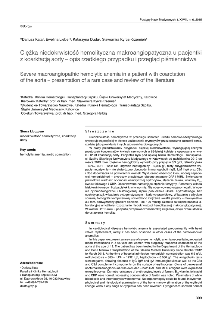Postępy Nauk Medycznych, t. XXVIII, nr 6, 2015 ©Borgis *Dariusz Kata1, Ewelina Lieber2, Katarzyna Duda2, Sławomira Kyrcz-Krzemień1 Ciężka niedokrwistość hemolityczna makroangiopatyczna u pacjentki z koarktacją aorty – opis rzadkiego przypadku i przegląd piśmiennictwa Severe macroangiopathic hemolytic anemia in a patient with coarctation of the aorta – presentation of a rare case and review of the literature 1 Katedra i Klinika Hematologii i Transplantacji Szpiku, Śląski Uniwersytet Medyczny, Katowice Kierownik Katedry: prof. dr hab. med. Sławomira Kyrcz-Krzemień 2 Studenckie Towarzystwo Naukowe, Katedra i Klinika Hematologii i Transplantacji Szpiku, Śląski Uniwersytet Medyczny, Katowice Opiekun Towarzystwa: prof. dr hab. med. Grzegorz Helbig Słowa kluczowe Streszczenie niedokrwistość hemolityczna, koarktacja aorty Niedokrwistość hemolityczna w przebiegu schorzeń układu sercowo-naczyniowego występuje najczęściej w efekcie uszkodzenia erytrocytów przez sztuczne zastawki serca, rzadziej jako powikłanie innych zaburzeń kardiologicznych. W pracy przedstawiamy przypadek ciężkiej niedokrwistości, wymagającej licznych przetoczeń koncentratów krwinek czerwonych u 65-letniej kobiety z operowaną w wieku 12 lat koarktacją aorty. Pacjentka była pod opieką Kliniki Hematologii i Transplantacji Szpiku Śląskiego Uniwersytetu Medycznego w Katowicach od października 2012 do marca 2013 roku. Stężenie hemoglobiny wynosiło przy przyjęciu 6,9 g/dl, retikulocytoza – 68‰, LDH – 1232 IU/l, stężenie haptoglobiny – 0,066 g/l, testy antyglobulinowe wypadły negatywnie – nie stwierdzono obecności immunoglobulin IgG, IgM i IgA oraz C3c i C3d dopełniacza na powierzchni krwinek. Wykluczono obecność klonu nocnej napadowej hemoglobinurii – erytrocyty prawidłowe, obecne antygeny DAF i MIRL. Stwierdzono prawidłowe wartości: oporności osmotycznej erytrocytów, stężenia żelaza, witaminy B12, kwasu foliowego i CRP. Obserwowano narastające stężenie ferrytyny. Parametry układu białokrwinkowego i liczba płytek krwi w normie. Nie obserwowano organomegalii. W ocenie cytomorfologicznej i histologicznej szpiku pobudzenie układu erytroidalnego, bez cech dysplazji, w badaniu cytogenetycznym – kariotyp prawidłowy. W badaniu z użyciem spiralnej tomografii komputerowej stwierdzono zwężenie światła protezy – maksymalnie 3,5 mm, podwyższony gradient ciśnienia – ok. 100 mmHg. Szeroko zakrojone badania laboratoryjne umożliwiły rozpoznanie niedokrwistości hemolitycznej makroangiopatycznej. W kwietniu 2013 roku u pacjentki przeprowadzono korektę zwężenia, dzięki czemu doszło do ustąpienia hemolizy. Key words hemolytic anemia, aortic coarctation Summary Adres/address: *Dariusz Kata Katedra i Klinika Hematologii i Transplantacji Szpiku SUM ul. Dąbrowskiego 25, 40-032 Katowice tel. +48 691-735-156 [email protected] In cardiological diseases hemolytic anemia is associated predominantly with heart valves replacement, rarely it has been observed in other cases of the cardiovascular anomalies. In this paper we present a rare case of severe hemolytic anemia necessitating repeated blood transfusions in a 65-year old women with surgically reapaired coarctation of the aorta at the age of 12. The patient has been treated in the Department of the Hematology and Bone Marrow Transplantation of the Silesian Medical University since October 2012 to March 2013. At the time of hospital admission hemoglobin concentration was 6.9 g/dl, retikulocytosis – 68‰, LDH – 1232 IU/l, haptoglobin – 0.066 g/l. The antiglobulin tests were negative, showing absence of IgG, IgM and IgA immunoglobulins as well as the C3c and C3d complement components on the surface of erythrocytes. Clone of paroxysmal nocturnal haemoglobinuria was excluded – both DAF and MIRL antigens were expressed on erythrocytes. Osmotic resistance of erythrocytes, levels of ferrum, B12 vitamin, folic acid and CRP were normal. Increasing concentration of ferritin was noted. Parameters of white blood cells and thrombocytes were normal. No organomegaly could be found. In cytomorphological and histological examinations of the bone marrow stimulation of the erythroid lineage without any sings of dysplasia has been revealed. Cytogenetics showed normal 399 Dariusz Kata, Ewelina Lieber, Katarzyna Duda, Sławomira Kyrcz-Krzemień karyotype. Stenosis of the aortic prosthesis – maximally 3.5 mm and increased gradient of pressure – circa 100 mmHg have been revealed on CT angiography. Extensive laboratory work-up allowed the diagnosis of macroangiopathic haemolytic anaemia. In April 2013 the patient underwent cardiosurgical correction of the stenosis and hemolysis resolved. WSTĘP Niedokrwistości hemolityczne stanowią niejednorodną grupę schorzeń o zróżnicowanej etiologii, cechujących się skróceniem czasu przeżycia erytrocytów, wynikającym z ich wzmożonego rozpadu, który może zachodzić wewnątrz- lub pozanaczyniowo (1). Jedną z form niedokrwistości rozwijającej się w przebiegu hemolizy wewnątrznaczyniowej jest niedokrwistość hemolityczna makroangiopatyczna. Do hemolizy dochodzi wówczas w wyniku bezpośredniego urazu błony komórkowej erytrocytów wskutek kontaktu ze sztucznymi powierzchniami w obrębie naczyń (protezy, zastawki). Ciężka niedokrwistość hemolityczna nie jest zbyt częstym powikłaniem u pacjentów ze schorzeniami kardiologicznymi. Hemoliza po zabiegu wymiany zastawki serca jest zjawiskiem dobrze znanym, natomiast u pacjentów po chirurgicznym leczeniu wrodzonych wad serca występuje bardzo rzadko, co może utrudniać wyjaśnienie przyczyny niedokrwistości oraz ustalenie ostatecznej diagnozy (2). OPIS PRZYPADKU U 65-letniej pacjentki z koarktacją aorty, skorygowaną w 1959 r. przez wszczepienie protezy naczyniowej długości 8 cm, obejmującej dystalny fragment łuku i początkowy odcinek aorty zstępującej, w styczniu 2012 r. na podstawie badania z użyci