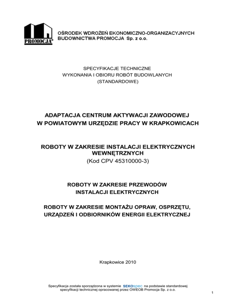 SPECYFIKACJE TECHNICZNE WYKONANIA I OBIORU ROBÓT BUDOWLANYCH (STANDARDOWE) ADAPTACJA CENTRUM AKTYWACJI ZAWODOWEJ W POWIATOWYM URZĘDZIE PRACY W KRAPKOWICACH ROBOTY W ZAKRESIE INSTALACJI ELEKTRYCZNYCH WEWNĘTRZNYCH (Kod CPV 45310000-3) ROBOTY W ZAKRESIE PRZEWODÓW INSTALACJI ELEKTRYCZNYCH ROBOTY W ZAKRESIE MONTAŻU OPRAW, OSPRZĘTU, URZĄDZEŃ I ODBIORNIKÓW ENERGII ELEKTRYCZNEJ Krapkowice 2010 Specyfikacja została sporządzona w systemie SEKOspec SEKOspec na podstawie standardowej specyfikacji technicznej OWEOB opracowanej Promocjaprzez Sp. zOWEOB o.o. 2005Promocja Sp. z o.o. 1 SPIS TREŚCI 1. CZĘŚĆ OGÓLNA ..................................................................................... 3 1.1.Nazwa nadana zamówieniu przez zamawiającego ........................... 3 1.2.Przedmiot ST .................................................................................... 3 1.3.Zakres stosowania ST ...................................................................... 3 1.4.Przedmiot i zakres robót objętych ST ............................................... 3 1.5.Określenia podstawowe, definicje .................................................... 4 1.6.Ogólne wymagania dotyczące robót ................................................. 5 1.7.Dokumentacja robót montażowych .................................................... 6 1.8.Nazwy i kody ..................................................................................... 6 2. WYMAGANIA DOTYCZĄCE WŁAŚCIWOŚCI MATERIAŁÓW ................ 6 3. WYMAGANIA DOTYCZĄCE SPRZĘTU, MASZYN I NARZĘDZI ............ 13 4. WYMAGANIA DOTYCZĄCE TRANSPORTU ......................................... 13 5. WYMAGANIA DOTYCZĄCE WYKONANIA ROBÓT ............................... 14 6. KONTROLA JAKOŚCI ROBÓT .............................................................. 16 7. WYMAGANIA DOTYCZĄCE PRZEDMIARU I OBMIARU ROBÓT ........ 17 8. ODBIÓR ROBÓT .................................................................................... 17 9. PODSTAWA ROZLICZENIA ROBÓT ..................................................... 18 10. DOKUMENTY ODNIESIENIA ............................................................... 19 Najważniejsze oznaczenia i skróty: ST – Specyfikacja Techniczna SST – Szczegółowa Specyfikacja Techniczna ITB – Instytut Techniki Budowlanej PZJ – Program Zabezpieczenia Jakości Jednostka autorska, opracowanie edytorskie i rozpowszechnianie: Ośrodek Wdrożeń Ekonomiczno-Organizacyjnych Budownictwa „Promocja” Sp. z o.o. 02-548 Warszawa, ul. Grażyny 15, tel. (22) 440-84-00, fax (22) 440-84-01 www.sekocenbud.pl e-mail: [email protected] ISBN 83-89756-81-1 Copyright by OWEOB PROMOCJA Sp. z o.o. Wydanie 1, Warszawa 2005 Wszelkie prawa zastrzeżone! Wykorzystanie treści niniejszej specyfikacji technicznej dozwolone jest wyłącznie do przygotowania dokumentacji budowlanej. Kopiowanie, przedrukowywanie i rozpowszechnianie całości lub fragmentów niniejszej publikacji w celach komercyjnych bez pisemnej zgody wydawcy zabronione. Specyfikacja została sporządzona w systemie SEKOspec SEKOspec na podstawie standardowej specyfikacji technicznej OWEOB opracowanej Promocjaprzez Sp. zOWEOB o.o. 2005Promocja Sp. z o.o. 2 1. CZĘŚĆ OGÓLNA 1.1.Nazwa nadana zamówieniu przez zamawiającego ........................................................................................................... 1.2.Przedmiot ST Przedmiotem niniejszej specyfikacji technicznej (ST) są wymagania dotyczące wykonania i odbioru robót związanych z układaniem i montażem elementów instalacji elektrycznej (układanie kabli i przewodów, montaż osprzętu i opraw) w obiektach kubaturowych oraz obiektach budownictwa inżynieryjnego. Specyfikacja nie obejmuje robót elektrycznych niskoprądowych. 1.3.Zakres stosowania ST Specyfikacja techniczna standardowa (ST) stanowi podstawę opracowania specyfikacji technicznej szczegółowej (SST), stosowanej jako dokument przetargowy i kontraktowy przy zlecaniu i realizacji robót wymienionych w pkt. 1.2. Projektant sporządzający dokumentację projektową i odpowiednie szczegółowe specyfikacje techniczne wykonania i odbioru robót budowlanych może wprowadzać do niniejszej standardowej specyfikacji zmiany, uzupełnienia lub uściślenia, odpowiednie dla przewidzianych projektem robót, uwzględniające wymagania Zamawiającego oraz konkretne warunki realizacji robót, niezbędne do uzyskania wymaganego standardu i jakości tych robót. Odstępstwa od wymagań podanych w niniejszej specyfikacji mogą mieć miejsce tylko w przypadkach prostych robót o niewielkim znaczeniu, dla których istnieje pewność, że podstawowe wymagania będą spełnione przy zastosowaniu metod wykonania wynikających z doświadczenia oraz uznanych reguł i zasad sztuki budowlanej. 1.4.Przedmiot i zakres robót objętych ST Ustalenia zawarte w niniejszej specyfikacji technicznej (ST) dotyczą zasad wykonywania i odbioru robót związanych z: – układaniem kabli i przewodów elektrycznych, w tym szynoprzewodów montowanych poza rozdzielnicami, – montażem opraw, osprzętu, urządzeń i odbiorników energii elektrycznej, wraz z przygotowaniem podłoża i robotami towarzyszącymi, dla obiektów kubaturowych oraz obiektów budownictwa inżynieryjnego. ST dotyczy wszystkich czynności mających na celu wykonanie robót związanych z: – kompletacją wszystkich materiałów potrzebnych do wykonania podanych wyżej prac, – wykonaniem wszelkich robót pomocniczych w celu przygotowania podłoża (w szczególności roboty murarskie, ślusarsko-spawalnicze montaż elementów osprzętu instalacyjnego itp.), – ułożeniem wszystkich materiałów w sposób i w miejscu zgodnym z dokumentacją techniczną, – wykonaniem oznakowania zgodnego z dokumentacją techniczną wszystkich elementów wyznaczonych w dokumentacji, – ułożeniem drutu stalowego (dla instalacji prowadzonych w rurkach lub kanałach zamkniętych), ułatwiaj