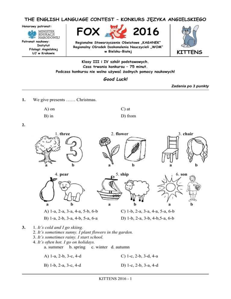 THE ENGLISH LANGUAGE CONTEST – KONKURS JĘZYKA ANGIELSKIEGO Honorowy patronat: FOX Patronat naukowy: Instytut Filologii Angielskiej UJ w Krakowie 2016 Regionalne Stowarzyszenie Oświatowe „KAGANEK” Regionalny Ośrodek Doskonalenia Nauczycieli „WOM” w Bielsku-Białej KITTENS Klasy III i IV szkół podstawowych. Czas trwania konkursu – 75 minut. Podczas konkursu nie wolno używać żadnych pomocy naukowych! Good Luck! Zadania po 3 punkty 1. We give presents …… Christmas. A) on C) at B) in D) from 2. 1. three a 2. flower b a 4. pear a 3. 3. chair b a 5. ship b a 6. son b a A) 1-a, 2-a, 3-a, 4-a, 5-b, 6-b C) 1-b, 2-a, 3-a, 4-a, 5-a, 6-b B) 1-a, 2-b, 3-a, 4-b, 5-a, 6-a D) 1-b, 2-a, 3-b, 4-b,5-a, 6-b 1. It’s cold and I go skiing. 2. It’s sometimes sunny. I plant flowers in the garden. 3. It’s sometimes rainy. I start school. 4. It’s often hot. I go on holidays. a. summer b. spring c. winter d. autumn A) 1-a, 2-b, 3-c, 4-d C) 1-c, 2-b, 3-d, 4-a B) 1-b, 2-a, 3-c, 4-d D) 1-c, 2-b, 3-a, 4-d KITTENS 2016 - 1 b b 4. 5. A) Funny C) Merry B) Nice D) Good luck In The Short-necked Giraffe, this is Jumaane. A) C) B) D) Zadania po 4 punkty 6. You read ‘g’ the same in …… pairs: green – girl, gym – gum, giraffe – gipsy, strange – page, good – glue 7. A) 2 C) 4 B) 3 D) 5 Walking through the jungle … What do I see? I see the loud (1) …… under a tree. Walking through the jungle … What do I see? I see the fast (2) …… zipping by me. Walking through the jungle … What do I see? I see the strong (3) …… lifting up a tree. Walking through the jungle … What do I see? I see the slow (4) …… and it’s on me! A) 1 – snake, 2 – elephant, 3 – lizard, 4 – lion B) 1 – lion, 2 – lizard, 3 – elephant, 4 - snake C) 1 – elephant, 2 – snake, 3 – lizard, 4 – lion D) 1 – lion, 2 – elephant, 3 – lizard, 4 – snake 8. 1. Wear your seat belt. 2. Don’t put your head and hands out of the window. 3. Get out on the side of the pavement. is about: A) plane B) ship C) car D) motorbike KITTENS 2016 - 2 9. 1) 2) 1. 2. 3) 4) 3. 4. 5) 5. 6) 6. 7. 7) 8) 8. 9) 9. It’s a/an: A) dish 10. B) plant C) animal D) sweet In The Short-necked Giraffe: Sometimes life is ……, Sometimes you feel ……, But when you have ……, All your dreams come …… . A) difficult, blue, a family, true C) blue, poor, a family, to you B) hard, blue, a friend, true D) hard, blue, friends, to you Zadania po 5 punktów 11. Hi Gary, It’s March 1st and here I am in Acapulco. I got here first …… plane, then …… car, and then …… foot. What a wonderful trip! Talk to you soon. Jason 12. A) by, by, on C) by, in, on B) on, by, on D) in, by, by -Hey, what’s the matter? - I’ve got a/an… 1. stomach ache 2. earache 3. toothache 4. headache A) 1-b, 2-c, 3-a, 4-d B) 1-b, 2-d, 3-a, 4-c a. …because I ate ten pancakes. b. …because I ate a toffee. c. …because I watched too much television. d. …because I was swimming in the lake. C) 1-a, 2-c, 3-b, 4-d D) 1-a, 2-d, 3-b, 4-c KITTENS 2016 - 3 13. 14. a. Because it’s sad. b. Because I am afraid. c. Because it’s cold. d. Because it’s funny. e. Because he is tired. 1. Why are you hiding? 2. Why are you laughing? 3. Why is he sleeping? 4. Why are you crying? 5. Why are you shaking? A) 1-a, 2-c, 3-e, 4-d, 5-b C) 1-b, 2-d, 3-e, 4-a, 5-c B) 1-c, 2-d, 3-a, 4-b, 5-e D) 1-b, 2-e, 3-c, 4-a, 5-d You can make …… Christmas words from these halves. stock pud tur coo ca din deco cele ner co pres ration ding rol dan key kie pipes ty whi ing bration A) 5 B) 6 C) 7 D) 8 15. You need …… to make 4 missing words from these letters: L E I N R E O T A A T M I T M Jumaane helps the chicks in the …… . Jumaane is not afraid of the …… . The name of Jumaane’s friend is …… . There’s no …… on Jumaane’s face. A) S B) K C) F D) B © RSO “Kaganek” Bielsko-Biała Sponsorship: KITTENS 2016 - 4