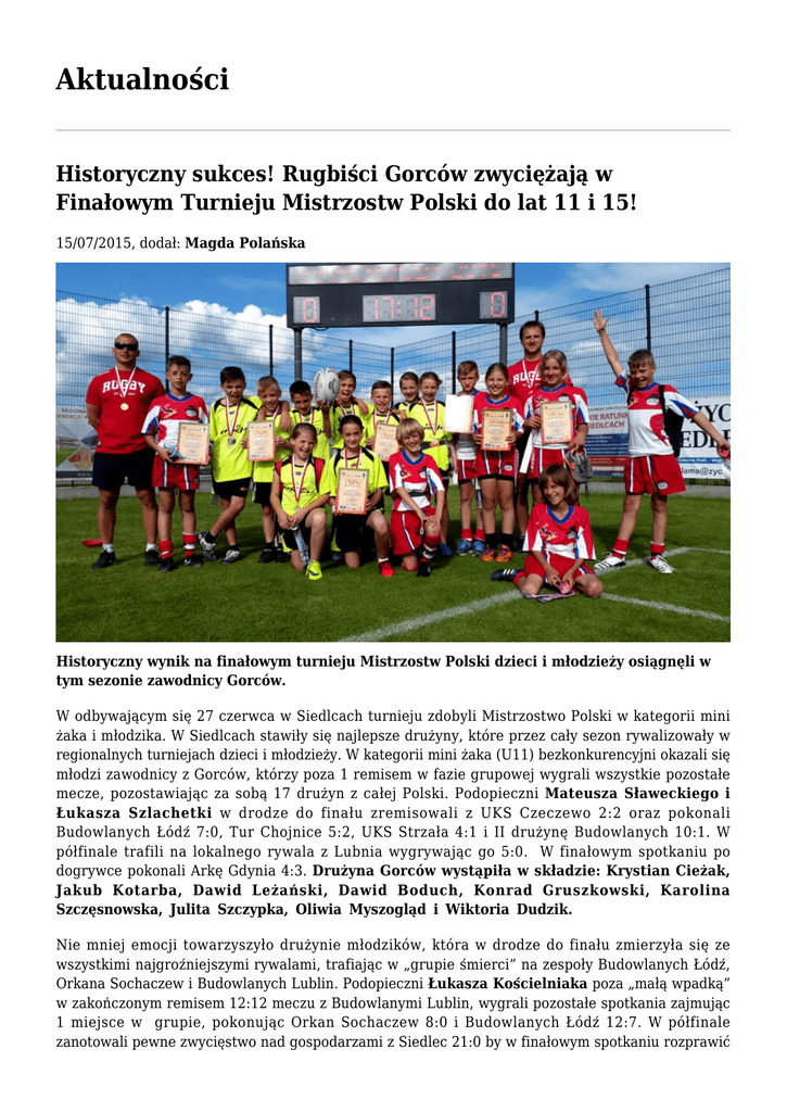 Aktualności Historyczny sukces! Rugbiści Gorców zwyciężają w Finałowym Turnieju Mistrzostw Polski do lat 11 i 15! 15/07/2015, dodał: Magda Polańska Historyczny wynik na finałowym turnieju Mistrzostw Polski dzieci i młodzieży osiągnęli w tym sezonie zawodnicy Gorców. W odbywającym się 27 czerwca w Siedlcach turnieju zdobyli Mistrzostwo Polski w kategorii mini żaka i młodzika. W Siedlcach stawiły się najlepsze drużyny, które przez cały sezon rywalizowały w regionalnych turniejach dzieci i młodzieży. W kategorii mini żaka (U11) bezkonkurencyjni okazali się młodzi zawodnicy z Gorców, którzy poza 1 remisem w fazie grupowej wygrali wszystkie pozostałe mecze, pozostawiając za sobą 17 drużyn z całej Polski. Podopieczni Mateusza Sławeckiego i Łukasza Szlachetki w drodze do finału zremisowali z UKS Czeczewo 2:2 oraz pokonali Budowlanych Łódź 7:0, Tur Chojnice 5:2, UKS Strzała 4:1 i II drużynę Budowlanych 10:1. W półfinale trafili na lokalnego rywala z Lubnia wygrywając go 5:0. W finałowym spotkaniu po dogrywce pokonali Arkę Gdynia 4:3. Drużyna Gorców wystąpiła w składzie: Krystian Cieżak, Jakub Kotarba, Dawid Leżański, Dawid Boduch, Konrad Gruszkowski, Karolina Szczęsnowska, Julita Szczypka, Oliwia Myszogląd i Wiktoria Dudzik. Nie mniej emocji towarzyszyło drużynie młodzików, która w drodze do finału zmierzyła się ze wszystkimi najgroźniejszymi rywalami, trafiając w „grupie śmierci” na zespoły Budowlanych Łódź, Orkana Sochaczew i Budowlanych Lublin. Podopieczni Łukasza Kościelniaka poza „małą wpadką” w zakończonym remisem 12:12 meczu z Budowlanymi Lublin, wygrali pozostałe spotkania zajmując 1 miejsce w grupie, pokonując Orkan Sochaczew 8:0 i Budowlanych Łódź 12:7. W półfinale zanotowali pewne zwycięstwo nad gospodarzami z Siedlec 21:0 by w finałowym spotkaniu rozprawić się z Lechią Gdańsk 14:7. Gorce zagrały w składzie: Robert Knowa, Dawid Lach, Adrian Kościelniak, Jakub Rapacz, Marcin Morus, Artur Bryl, Mateusz Polakiewicz, Jakub Warzecha, Michał Jurczyński, Bartłomiej Janeczko, Dariusz Kos, Bartłomiej Skoczeń, Daniel Wańczyk, Marcjan Krzykawski, Damian Wilkosz, Norbert Wyżga i Magdalena Knowa. KATEGORIA MINI ŻAK Grupa A: Lechia II - MKR Siedlce 0:9, Lubień - Lechia II 4:0, Arka II - Lubień 0:3 vo, MKR Siedlce Arka I 0:6, Skra - Arka I 1:5, Arka II - Lechia II 0:3 vo, MKR Siedlce - Lubień 1:6, Skra - MKR Siedlce 3:1, Lechia II - Skra 0:4, Lubień - Arka I 2:3, Arka II - Arka I 0:3 vo, Lubień - Skra 5:1, MKR Siedlce Arka II 3:0 vo, Lechia II - Arka 0:5, Skra - Arka II 3:0 vo. Kolejność: 1. RC Arka I Gdynia; 2. UKS Lubień; 3. RKS Skra Warszawa; 4. Miejski Klub Rugby Siedlce; 5. RC Lechia Gdańsk II; 6. RC Arka II Gdynia. Grupa B: Sparta - Ruda Śl. 1:0, Pogoń - Sparta 0:4, Ogniwo - Pogoń 3:3, Ruda Śl. - Lechia 1:5, Lublin - Lechia 0:7, Ogniwo - Sparta 1:5, Ruda Śl. - Pogoń 4:0, Lublin - Ruda Śl. 0:6, Sparta - Lublin 4:0, Pogoń - Lechia 0:8, Ogniwo - Lechia 0:8, Pogoń - Lublin 2:0, Ruda Śl. - Ogniwo 10:0, Sparta Lechia 0:4, Lublin - Ogniwo 1:2. Kolejność: 1. RC Lechia I Gdańsk; 2. Sparta Jarocin; 3. Rugby Ruda Śląska; 4. MKS Pogoń Siedlce; 5. MKS Ogniwo Sopot; 6. Budowlani Lublin. Grupa C: Czeczewo - Gorce 2:2, Tur - Czeczewo 5:2, Strzała - Tur 2:1, Gorce - Łódź I 7:0, Łódź II Łódź I 1:2, Strzała - Czeczewo 0:1, Gorce - Tur 5:2, Łódź II - Gorce 1:10, Czeczewo - Łódź II 4:1, Tur Łódź I 1:1, Strzała - Łódź I 2:1, Tur - Łódź II 6:0, Gorce - Strzała 4:1, Czeczewo - Łódź I 3:2, Łódź II Strzała 0:4. Kolejność: 1. RC Gorce Raba Niżna; 2. UKS Czeczewo; 3. Tur Chojnice; 4. UKS Strzała; 5. KS Budowlani Łódź I; 6. KS Budowlani Łódź II. Półfinały: Arka I - Lechia I 4:1; Gorce - Lubień 5:0 Finał o XVII miejsce: Łódź II - Arka II 3:0 vo Finał o XV miejsce: Lechia II - Lublin 3:1 Finał o XIII miejsce: Łódź I - Ogniwo 9:1 Finał o XI miejsce: MKR Siedlce - Pogoń 4:0 Finał o IX miejsce: Skra - Strzała 1:3 Finał o VII miejsce: Ruda Śl. - Tur 1:3 Finał o V miejsce: Sparta - Czeczewo 0:6 Finał o III miejsce: Lechia I - Lubień 2:1 Finał o I miejsce: Gorce - Arka I 4:3 Klasyfikacja: 1. RC Gorce Raba Niżna; 2, RC Arka Gdynia I; 3. RC Lechia Gdańsk I; 4. UKS Rugby Lubień; 5. UKS Czeczewo; 6. Sparta Jarocin; 7. Tur Chojnice; 8. KS Rugby Ruda Śląska; 9. UKS Strzała; 10. RKS Skra Warszawa; 11. Miejski Klub Rugby Siedlce; 12. MKS Pogoń Siedlce; 13. KS Budowlani Łódź I; 14. MKS Ogniwo Sopot; 15. RC Lechia II Gdańsk; 16. KS Budowlani Lublin; 17. KS Budowlani Łódź II; 18.Arka II Gdynia KATEGORIA MŁODZIK Grupa A: Łódź - Lublin 38:5, Orkan - Gorce 0:8, Lublin - Gorce 12:12, Łódź - Orkan 0:7, Orkan Lublin 26:0, Gorce - Łódź 12:7. Kolejność: 1. RC Gorce Raba Niżna; 2. RC Orkan Sochaczew; 3. KS Budowlani Łódź; 4. Budowlani Lublin. Grupa B: Lechia - Pogoń 31:0, Pogoń - Ogniwo 12:7, Lechia - Ogniwo 43:0. Kolejność: 1. RC Lechia Gdańsk; 2. MKS Pogoń Siedlce; 3. MKS Ogniwo Sopot. Półfinały: Gorce - Pogoń 21:0; Lechia - Orkan 33:0 Finał o V miejsce: Łódź - Ogniwo 31:5 Finał o III miejsce: Orkan - Pogoń 33:12 Finał o I miejsce: Lechia - Gorce 7:14 Klasyfikacja: 1. RC Gorce Raba Niżna; 2. RC Lechia Gdańsk; 3. RC Orkan Sochaczew; 4. MKS Pogoń Siedlce; 5. KS Budowlani Łódź; 6. MKS Ogniwo Sopot; 7. KS Budowlani Lublin. Łukasz Kościelniak