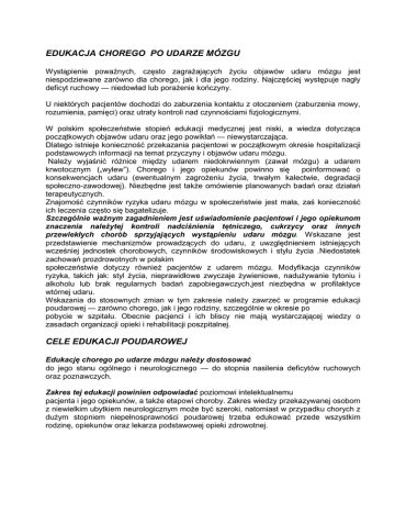 EDUKACJA CHOREGO PO UDARZE MÓZGU Wystąpienie powaŜnych, często zagraŜających Ŝyciu objawów udaru mózgu jest niespodziewane zarówno dla chorego, jak i dla jego rodziny. Najczęściej występuje nagły deficyt ruchowy — niedowład lub poraŜenie kończyny. U niektórych pacjentów dochodzi do zaburzenia kontaktu z otoczeniem (zaburzenia mowy, rozumienia, pamięci) oraz utraty kontroli nad czynnościami fizjologicznymi. W polskim społeczeństwie stopień edukacji medycznej jest niski, a wiedza dotycząca początkowych objawów udaru oraz jego powikłań — niewystarczająca. Dlatego istnieje konieczność przekazania pacjentowi w początkowym okresie hospitalizacji podstawowych informacji na temat przyczyny i objawów udaru mózgu. NaleŜy wyjaśnić róŜnice między udarem niedokrwiennym (zawał mózgu) a udarem krwotocznym („wylew”). Chorego i jego opiekunów powinno się poinformować o konsekwencjach udaru (ewentualnym zagroŜeniu Ŝycia, trwałym kalectwie, degradacji społeczno-zawodowej). Niezbędne jest takŜe omówienie planowanych badań oraz działań terapeutycznych. Znajomość czynników ryzyka udaru mózgu w społeczeństwie jest mała, zaś konieczność ich leczenia często się bagatelizuje. Szczególnie waŜnym zagadnieniem jest uświadomienie pacjentowi i jego opiekunom znaczenia naleŜytej kontroli nadciśnienia tętniczego, cukrzycy oraz innych przewlekłych chorób sprzyjających wystąpieniu udaru mózgu. Wskazane jest przedstawienie mechanizmów prowadzących do udaru, z uwzględnieniem istniejących wcześniej jednostek chorobowych, czynników środowiskowych i stylu Ŝycia .Niedostatek zachowań prozdrowotnych w polskim społeczeństwie dotyczy równieŜ pacjentów z udarem mózgu. Modyfikacja czynników ryzyka, takich jak: styl Ŝycia, nieprawidłowe zwyczaje Ŝywieniowe, naduŜywanie tytoniu i alkoholu lub brak regularnych badań zapobiegawczych,jest niezbędna w profilaktyce wtórnej udaru. Wskazania do stosownych zmian w tym zakresie naleŜy zawrzeć w programie edukacji poudarowej — zarówno chorego, jak i jego rodziny, szczególnie w okresie po pobycie w szpitalu. Obecnie pacjenci i ich bliscy nie mają wystarczającej wiedzy o zasadach organizacji opieki i rehabilitacji poszpitalnej. CELE EDUKACJI POUDAROWEJ Edukację chorego po udarze mózgu naleŜy dostosować do jego stanu ogólnego i neurologicznego — do stopnia nasilenia deficytów ruchowych oraz poznawczych. Zakres tej edukacji powinien odpowiadać poziomowi intelektualnemu pacjenta i jego opiekunów, a takŜe etapowi choroby. Zakres wiedzy przekazywanej osobom z niewielkim ubytkiem neurologicznym moŜe być szeroki, natomiast w przypadku chorych z duŜym stopniem niepełnosprawności poudarowej trzeba edukować przede wszystkim rodzinę, opiekunów oraz lekarza podstawowej opieki zdrowotnej. Pacjent w ostrej fazie udaru powinien uzyskać podstawowe informacje o jego przyczynie, przebiegu i powikłaniach. W ramach opieki poszpitalnej najistotniejsza jest wiedza na temat kontroli czynników ryzyka, sposobów pielęgnacji i rehabilitacji chorego oraz zmiany stylu i warunków jego Ŝycia. Edukacja pacjenta u osób samodzielnych, bez nasilonych deficytów ruchowych, bez zaburzeń afatycznych, objawów zespołu otępiennego obejmuje: • wyjaśnienie przyczyny udaru, zapewnienie niezbędnych informacji na temat jego przebiegu i powikłań; Edukacja chorego po udarze mózgu • ukazanie konieczności i sposobu zmiany stylu Ŝycia (promocja zachowań prozdrowotnych) oraz poprawy kontroli czynników ryzyka po udarze; • zwiększenie aktywnego udziału chorego w procesie leczniczym; • planowaną i dostosowaną do moŜliwości pacjenta rehabilitację społeczno-zawodową. Edukacja rodziny/opiekunów chorych z utrwaloną niepełnosprawnością poudarową, zaburzeniami mowy,demencją obejmuje: • wyjaśnienie zakresu oraz konsekwencji trwałych deficytów neurologicznych występujących u chorego; • naukę czynności pielęgnacyjnych i rehabilitacyjnych; • instruktaŜ w zakresie przygotowania zaplecza socjalnego (adaptacja mieszkania, wyposaŜenia w sprzęt rehabilitacyjny); • podanie informacji o moŜliwości uzyskania wsparcia (opieka społeczna, pielęgniarki środowiskowe, organizacje kościelne, pomoc psychologiczna); • ukazanie konieczności konsekwentnej rehabilitacji w warunkach domowych oraz sposobów jej prowadzenia. Edukacja lekarza rodzinnego i pielęgniarki środowiskowej pełniących poszpitalną opiekę nad chorym i jego rodziną obejmuje: • uświadomienie, Ŝe chory po udarze to pacjent specyficzny, wymagający szczególnego nadzoru neurologicznego i ogólnolekarskiego oraz ścisłej kontroli czynników ryzyka; • wskazanie, Ŝe niezbędne jest dostosowanie terapii do moŜliwości i konkretnych potrzeb pacjenta, przekazanie standardów postępowania leczniczego w warunkach ambulatoryjnych; • promowanie fachowego nadzoru pielęgnacyjnego w warunkach poszpitalnych (stała opieka domowa). KORZYŚCI Z EDUKACJI • Pogłębienie wiedzy chorych i ich rodzin dotyczącej czynników ryzyka udaru mózgu, zrozumienie jego przyczyny oraz przebiegu i konsekwencji. • Usprawnienie współpracy z lekarzem, zwiększenie częstości wizyt oraz lepsze przestrzeganie zaleceń terapeutycznych przez pacjenta i jego rodzinę. • Poprawa kontroli modyfikowalnych czynników ryzyka i większa skuteczność ich leczenia (zmniejszenie liczby i dawek leków, wprowadzenie działań niefarmakologicznych). • Promocja zachowań prozdrowotnych, zmiana niekorzystnego stylu Ŝycia. • Usprawnienie opieki domowej nad pacjentem oraz rehabilitacji poszpitalnej. PROGRAM DZIAŁAŃ EDUKACYJNYCH Metody przekazywania informacji: • bezpośrednia rozmowa lekarza z pacjentem oraz jego rodziną (NAJISTOTNIEJSZA); • publikacje informacyjne dla chorych po udarze mózgu i ich rodzin (prasa, broszury); • programy szkoleniowe dla pacjentów i ich rodzin lub opiekunów (w Polsce prowadzone tylko w k